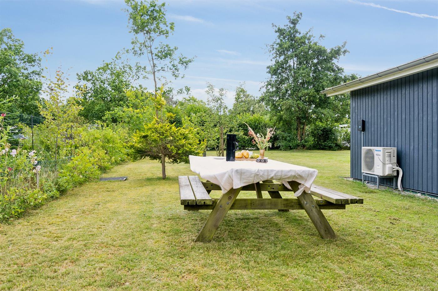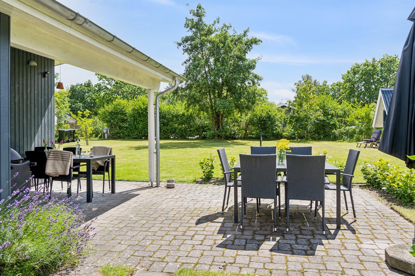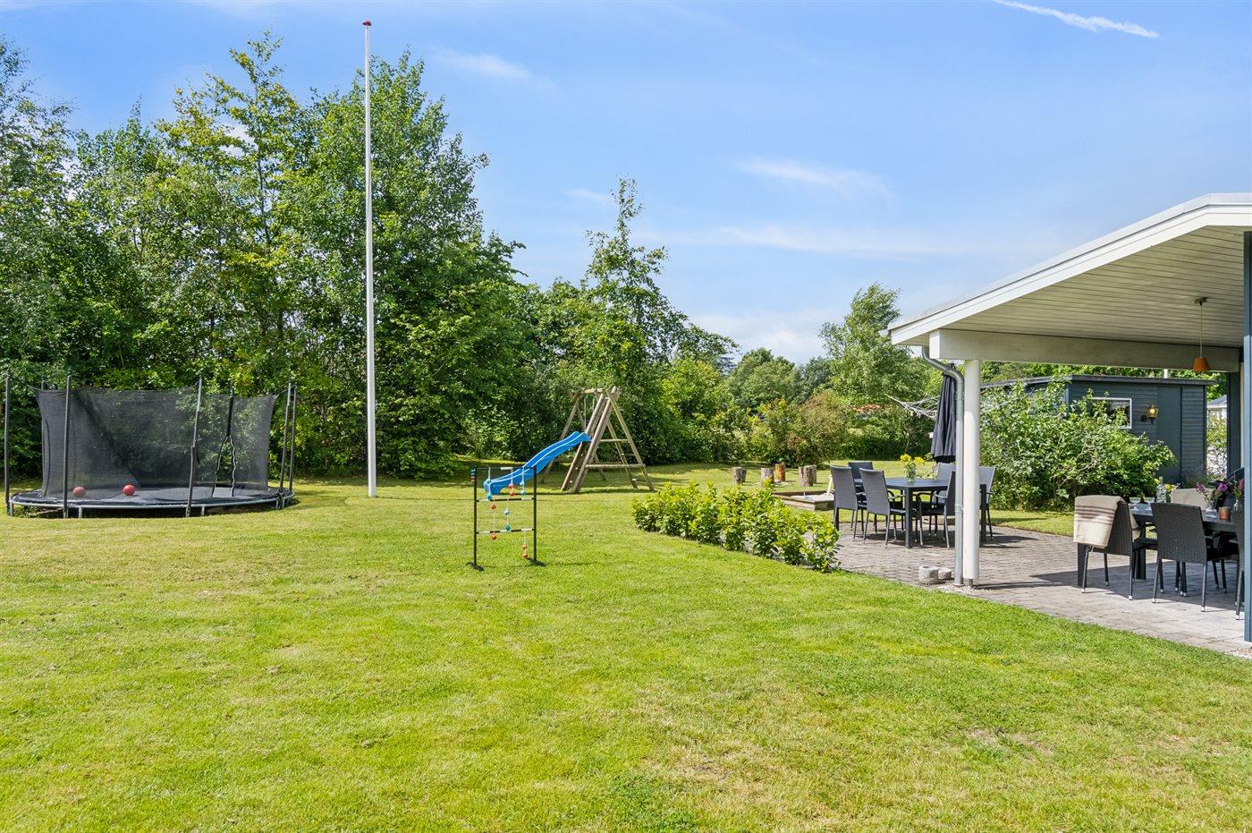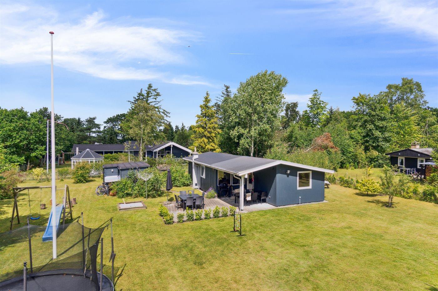 Ferieboligen er beliggende på en 1200 m² stor naturgrund. Der er 300 m til havet. Nærmeste forretning er beliggende i en afstand af 500 m. Til ferieboligen hører 24 m² terrasseareal. Desuden er der 14 m² overdækket terrasse. Der er redskabsrum. Gynge. Sandkasse. Trampolin. Rutchebane. Bålsted. Grill til rådighed. Der er installeret stik til opladning af elbil. Type 2 stik. Med 11 kW ladeeffekt. Parkering ved ferieboligen.