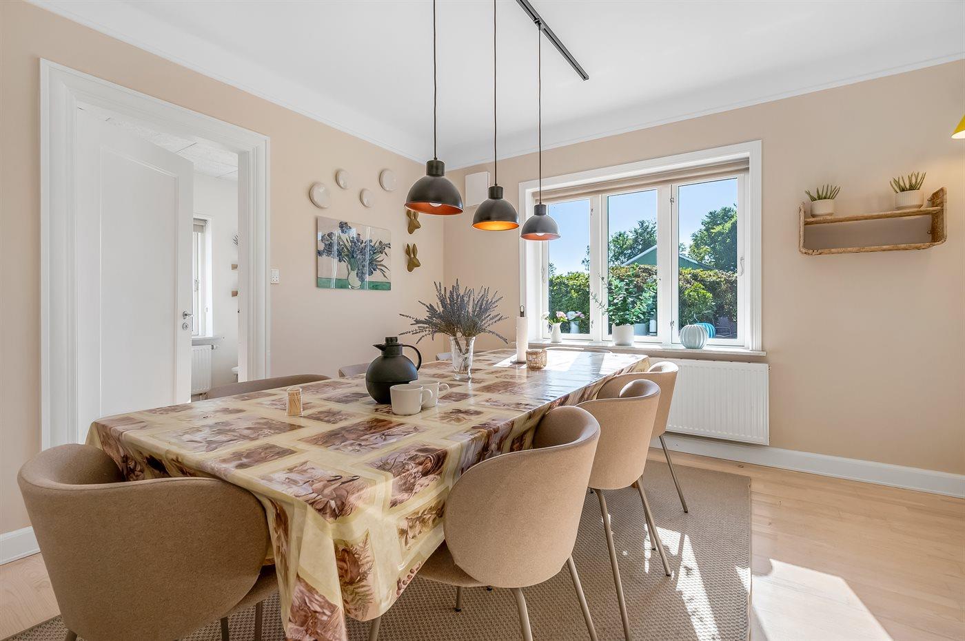 Renoveret landejendom ved Fjellerup Strand med aktivitetsrum og stor have.