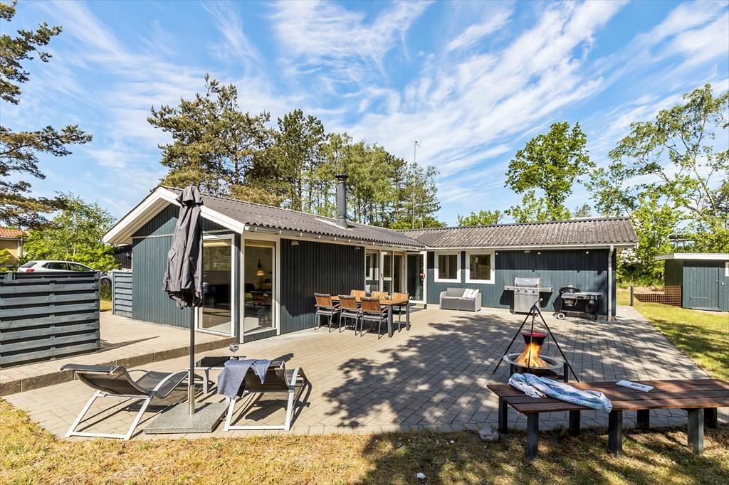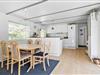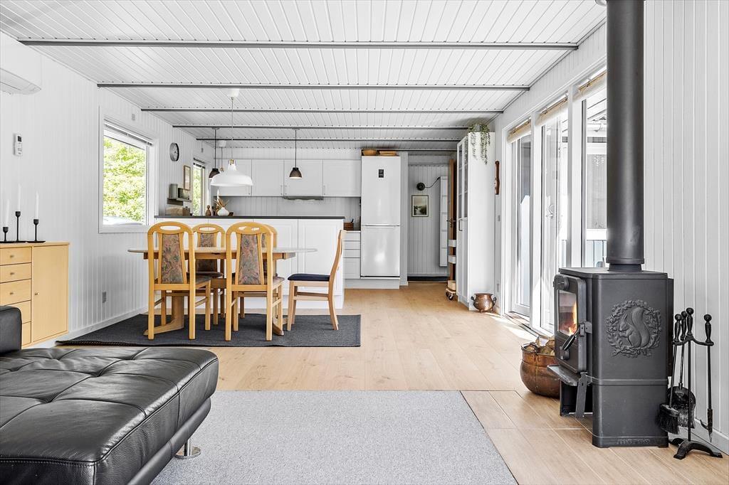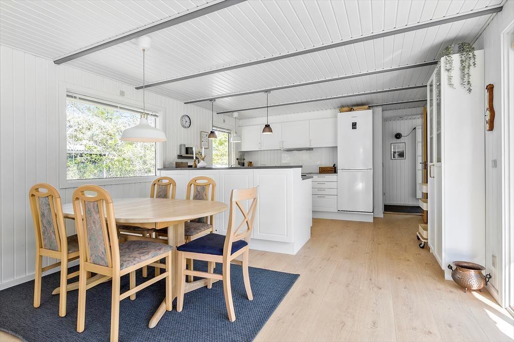 Når I træder indenfor, mødes I af en dejlig atmosfære. Det nyere, funktionelle køkken flyder sammen med spisepladsen og den hyggelige stue i ét åbent rum – her kan familien samles til både madlavning, brætspil og afslappede stunder i sofaen. Fra stuen åbner terrassedøren op til en verden af udendørs oplevelser. I husets anden vinkel finder I tre soveværelser – det ene med dobbeltseng, et andet med køjeseng, og et tredje med enkeltseng – alle med en rolig stemning, der indbyder til god nattesøvn efter dagens eventyr. Badeværelset er praktisk indrettet med både bruser og vaskemaskine, så det er nemt at holde styr på strandtøjet.
