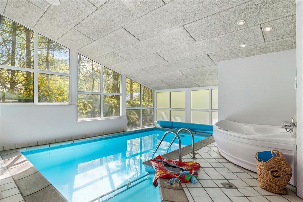 I et sommerhus, der emmer af afslapning, forkælelse og fælles ferieglæde! Her kan du og familien se frem til jeres helt eget wellnessrum med swimmingpool, boblende spa og varm sauna – en lille oase af velvære, hvor I kan lade skuldrene sænke og bare nyde ferien. Her står et par behagelige stole klar til en rolig pause mellem dukkerterne, og der er direkte adgang til det ene badeværelse, der i øvrigt har både vaskemaskine og tørretumbler.
