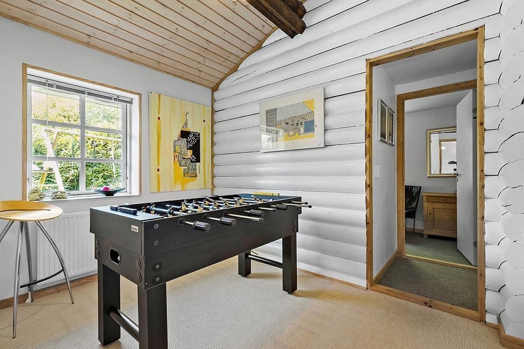 Midt i huset ligger det flotte og funktionelle køkken – perfekt til lange feriemorgener med duften af kaffe og nybagt brød. Ovenover køkkenet gemmer der sig en stor og sjov legehems, som børnene vil elske at indtage som deres helt eget ferieunivers. I den kæmpestore opholdsstue indbyder bløde sofaer til ren afslapning – måske med en god bog, et brætspil eller bare udsigten til naturen udenfor. Herfra er der direkte udgang til en stor, overdækket terrasse, hvor både morgenkaffe og aftenhygge kan nydes i tørvejr. Med to badeværelser – det ene med spa – fire indbydende soveværelser og et aktivitetsrum med bordfodbold, er der masser af plads til både samvær og privatliv.