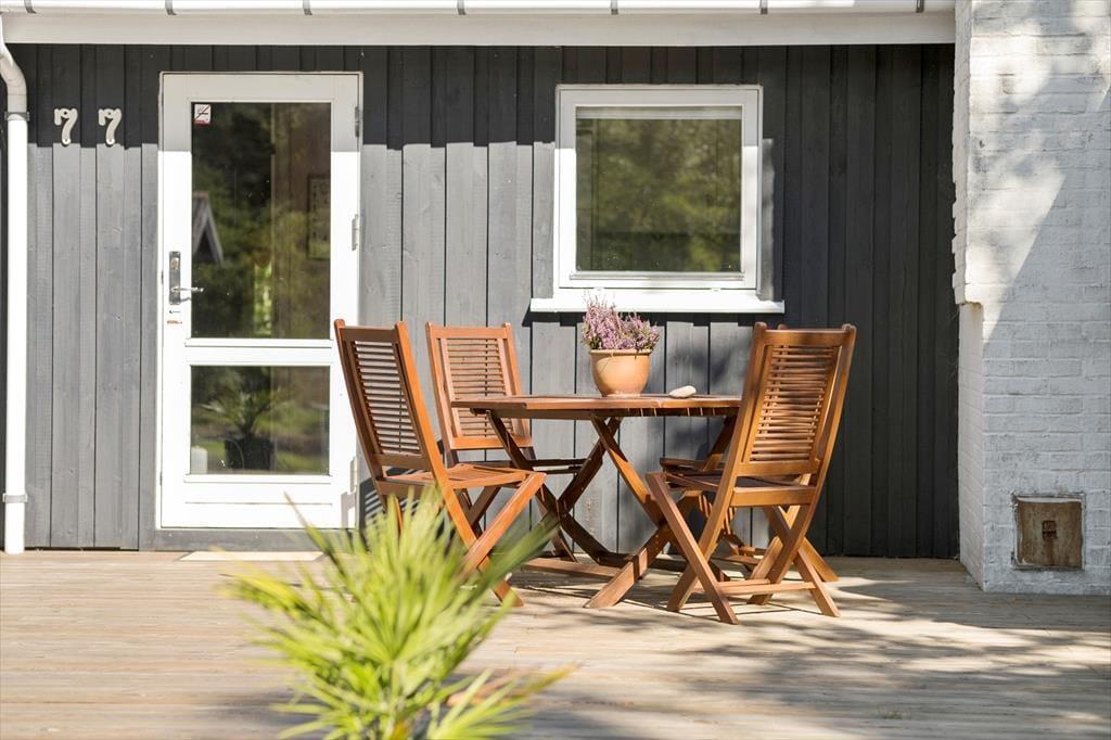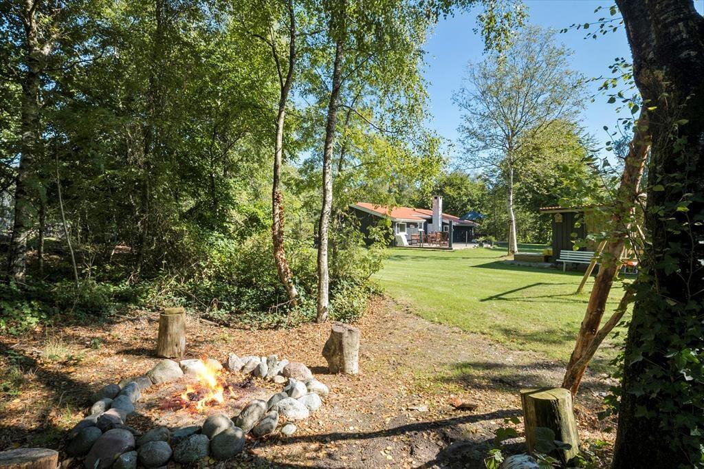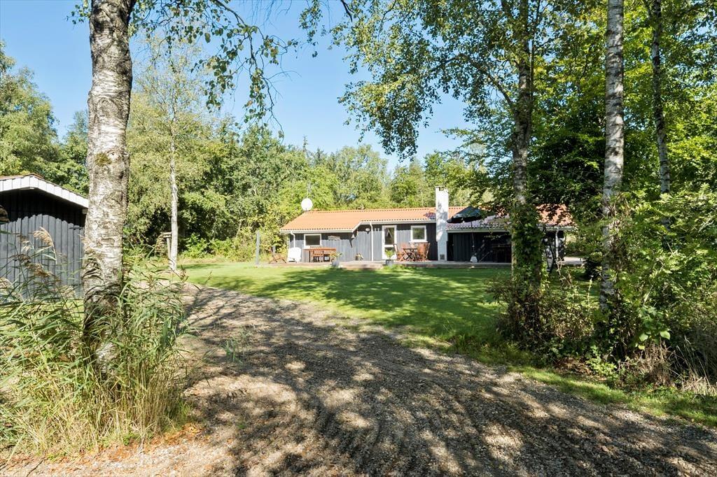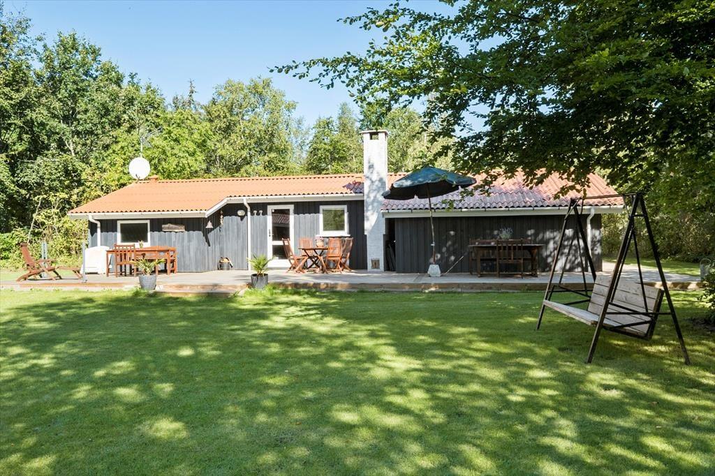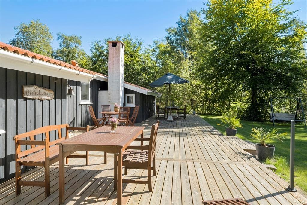 Navnet på huset er Birkely, og der står da også flere flotte birketræer på den store naturgrund. I det hele taget føles det lidt som at holde ferie i et skovbryn, for sommerhusets græsplæne er på kønneste vis omkranset af grønt, hvilket også gør det udendørs ferieliv dejligt ugeneret. Syd og øst for sommerhuset breder en stor træterrasse sig, og her er der både overdækkede og åbne siddepladser at vælge imellem.