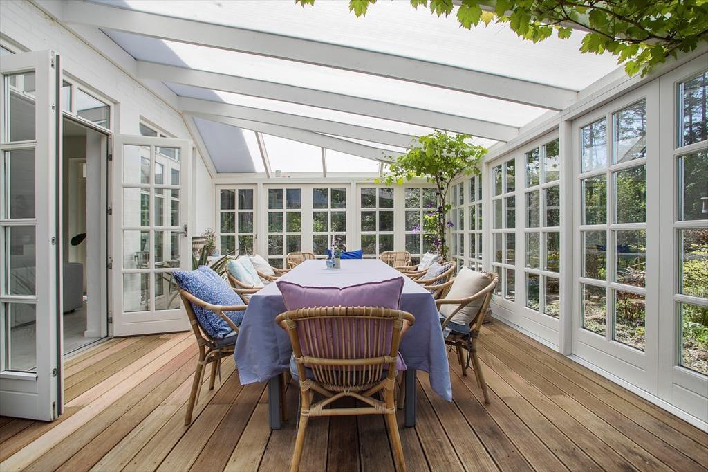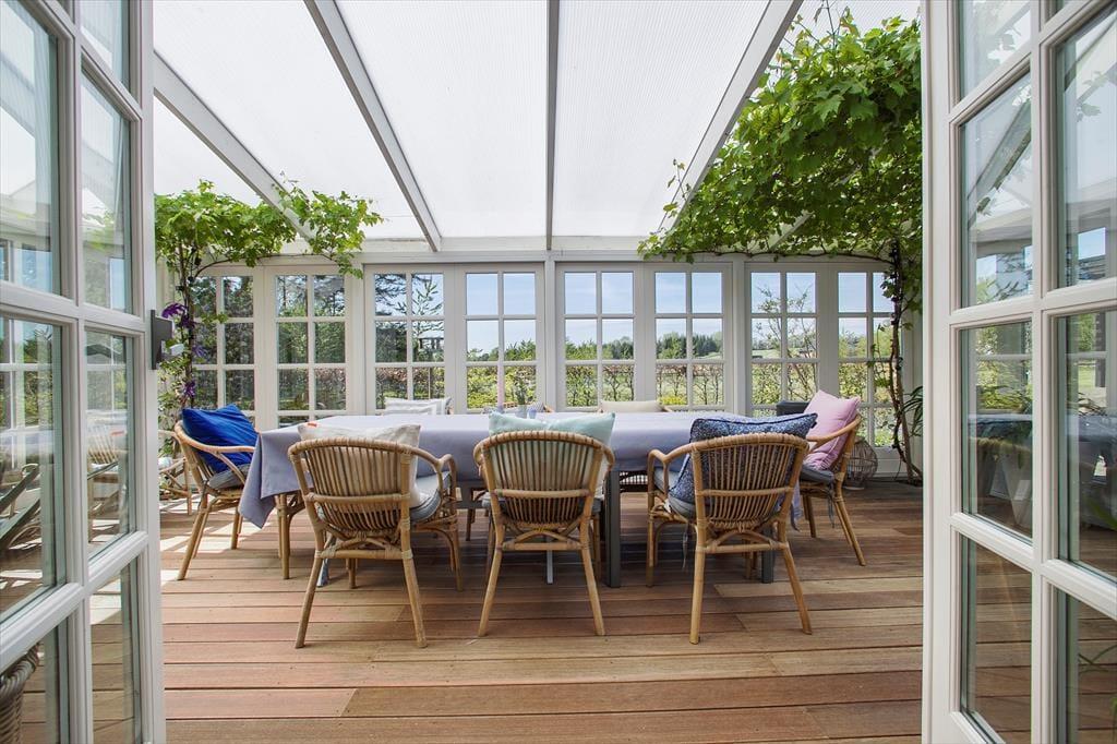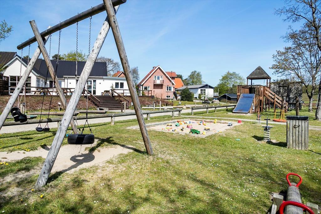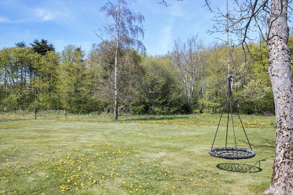 Udestuen kan nemt blive en af jeres foretrukne opholdspladser, men når sommersolen står højt på himlen, er det ligeledes tillokkende at sidde helt ude i det fri. Rundt om huset er der anlagt flere store, åbne terrasser, hvoraf det vestvendte miljø har en fin udsigt til det omgivende grønne landskab. Til børnene er der en sansegynge, og hele familien har masser af plads til at spille havespil på den kæmpestore grund.