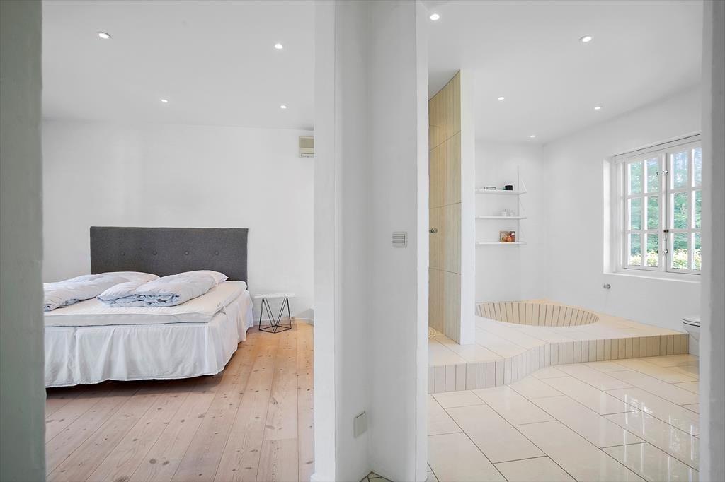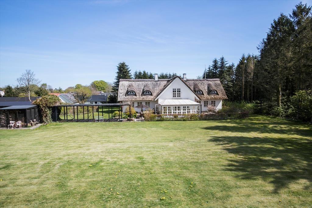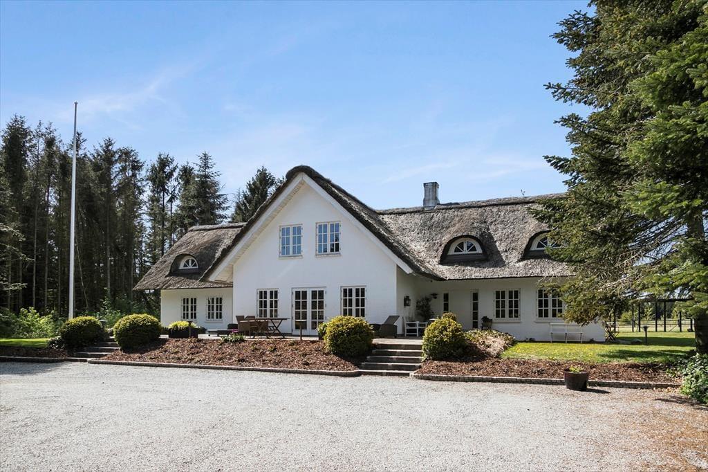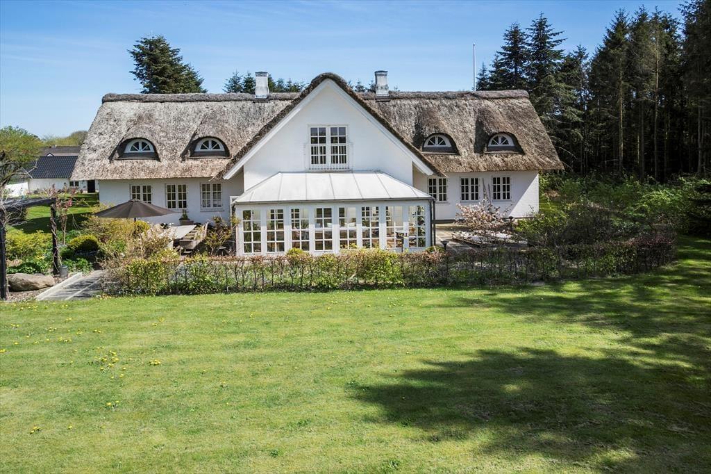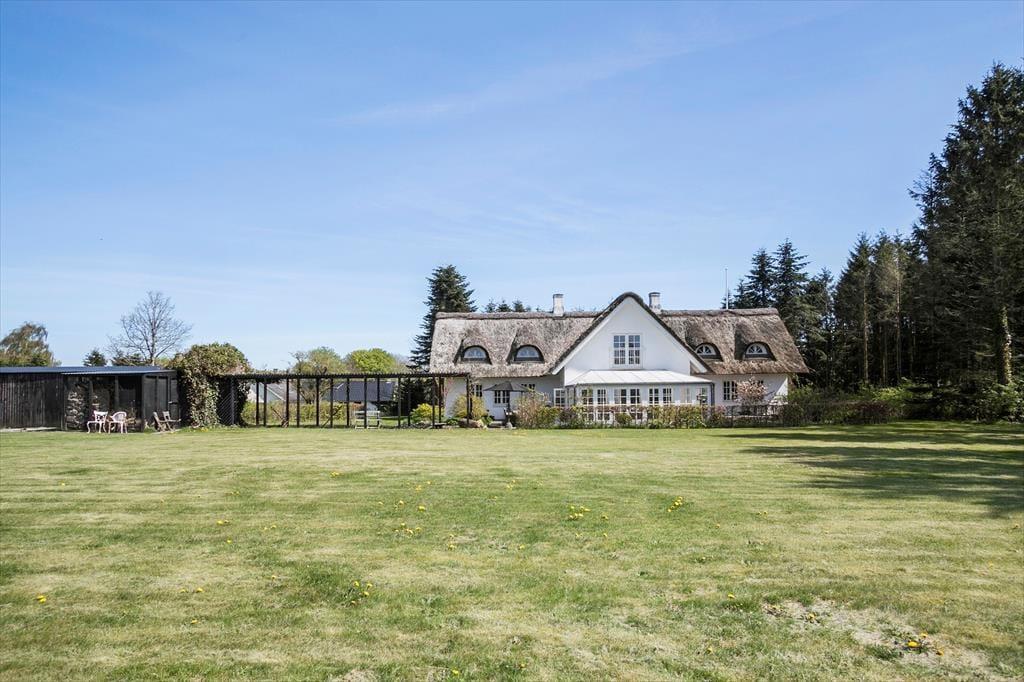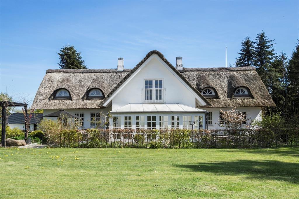 Sommerhusets stråtag og hvide facade vækker minder om klassiske landejendomme. Der er dog tale om et nyere byggeri fra 2007, og inden døre har I hele 350 m2 til rådighed fordelt på stueetagen og førstesalen. Atmosfæren er lys og luftig, og som billederne afslører, er rummene indrettet på udsøgt vis med materialer og møblement af højeste klasse. Fem værelser er fordelt i tre soveafsnit – to i stueplan og et på førstesalen. Soveafsnittene har hver sit badeværelse, hvoraf det ene har et elegant nedsænket badekar. Som supplement til soveværelserne står der en dobbelt sovesofa i aktivitetsrummet, som derudover er udstyret med poolbord, elektronisk dart og bordfodbold. Når I ikke dyster om at blive feriens champion, har I to flotte stuer og et højloftet køkken-alrum at samles i – foruden en vestvendt udestue, der inviterer til idylliske middage og hyggestunder under den klatrende vin.