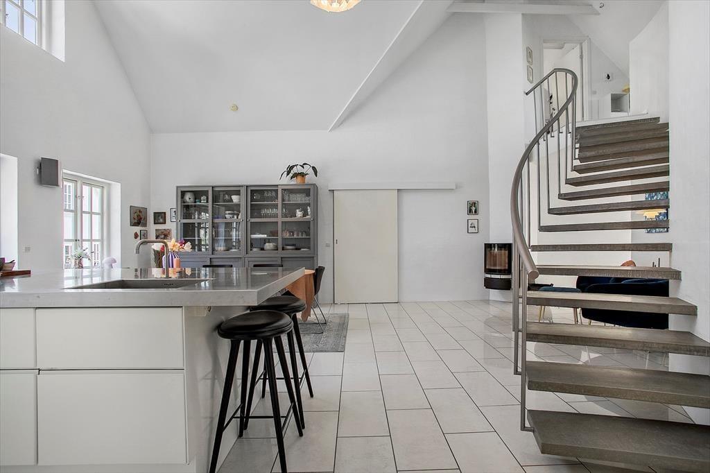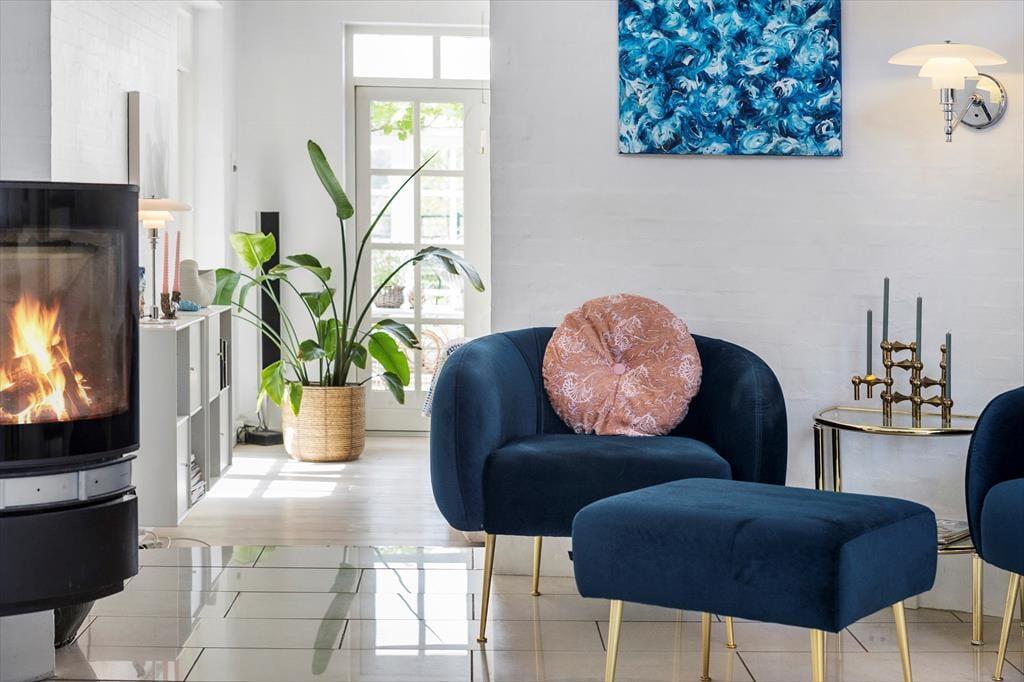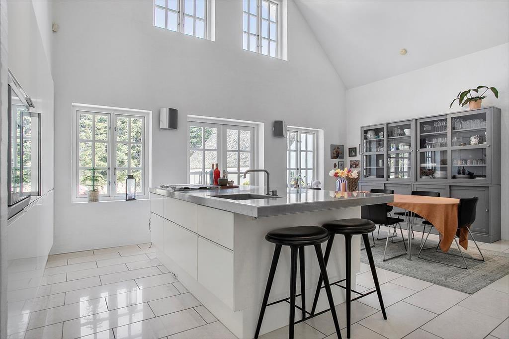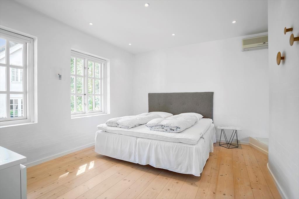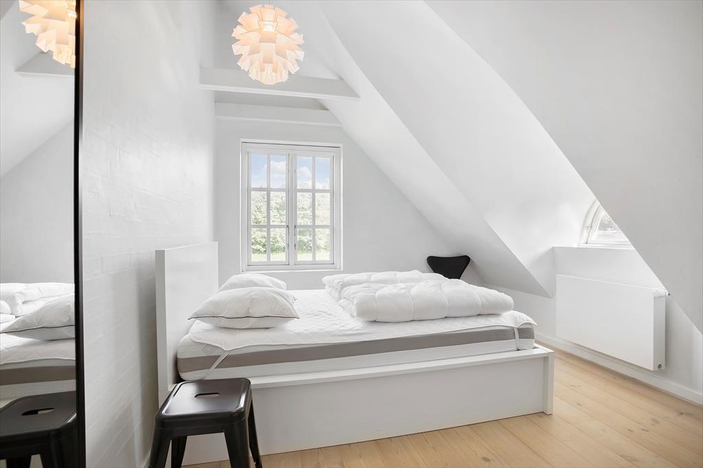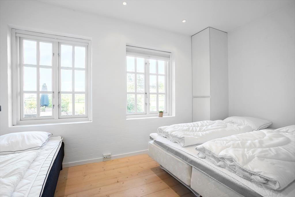 Sommerhusets stråtag og hvide facade vækker minder om klassiske landejendomme. Der er dog tale om et nyere byggeri fra 2007, og inden døre har I hele 350 m2 til rådighed fordelt på stueetagen og førstesalen. Atmosfæren er lys og luftig, og som billederne afslører, er rummene indrettet på udsøgt vis med materialer og møblement af højeste klasse. Fem værelser er fordelt i tre soveafsnit – to i stueplan og et på førstesalen. Soveafsnittene har hver sit badeværelse, hvoraf det ene har et elegant nedsænket badekar. Som supplement til soveværelserne står der en dobbelt sovesofa i aktivitetsrummet, som derudover er udstyret med poolbord, elektronisk dart og bordfodbold. Når I ikke dyster om at blive feriens champion, har I to flotte stuer og et højloftet køkken-alrum at samles i – foruden en vestvendt udestue, der inviterer til idylliske middage og hyggestunder under den klatrende vin.