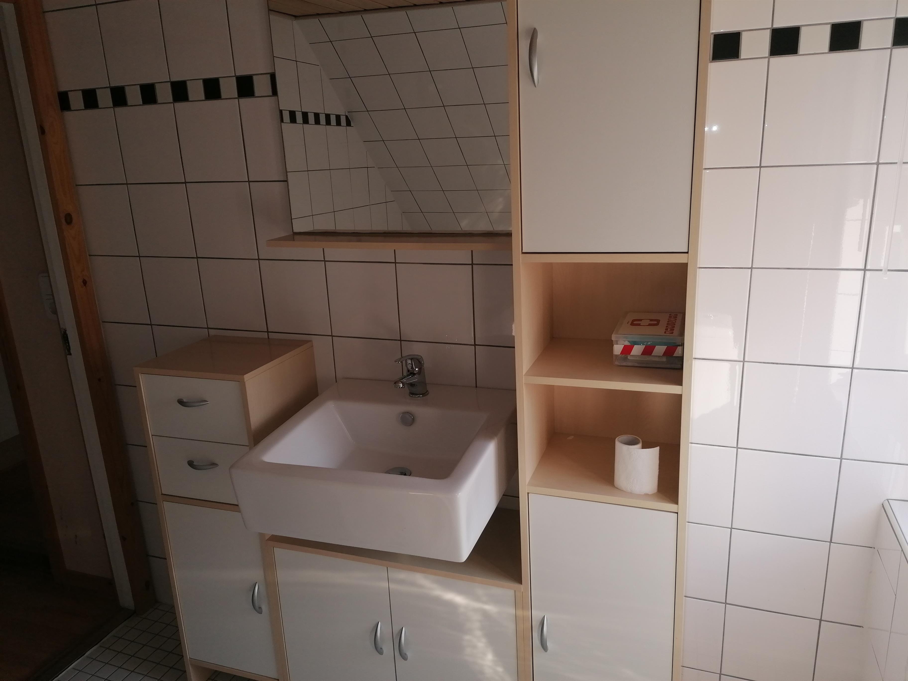 Auch das Badezimmer ist zweckmäßig mit Badewanne, WC, Waschbecken und Schrankplatz eingerichtet. Ein Föhn ist vorhanden. Als Erstausstattung haben wir Toilettenpapier bereitgelegt.