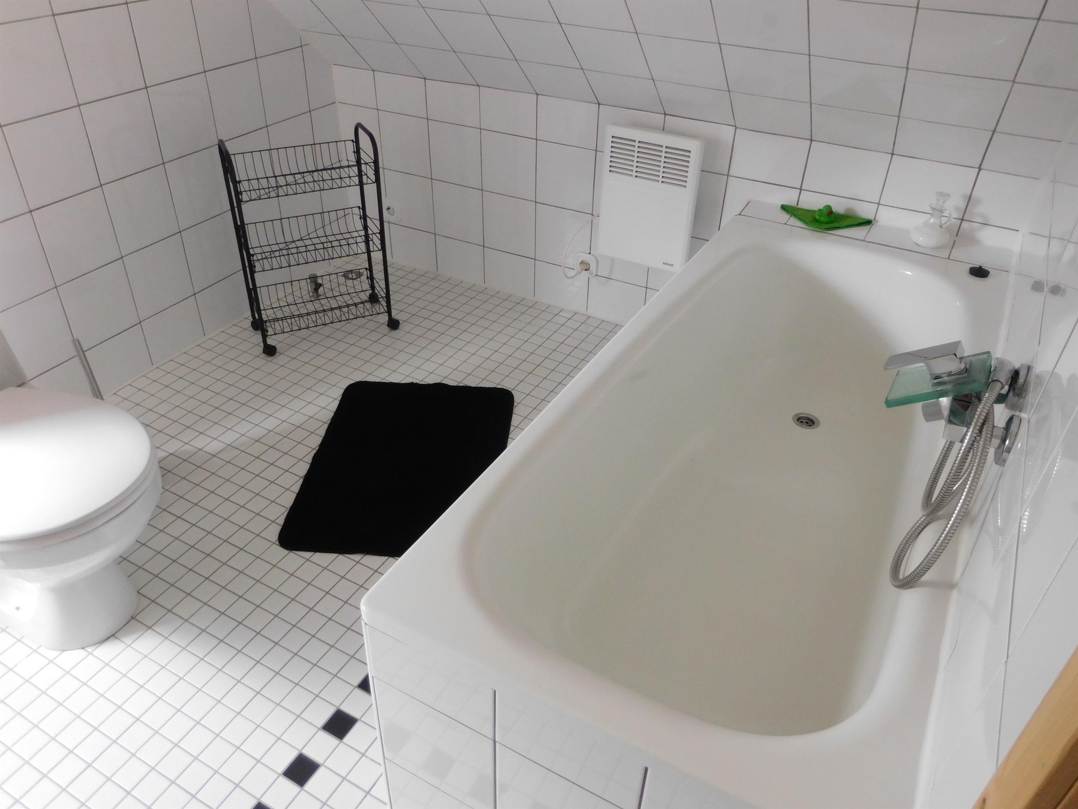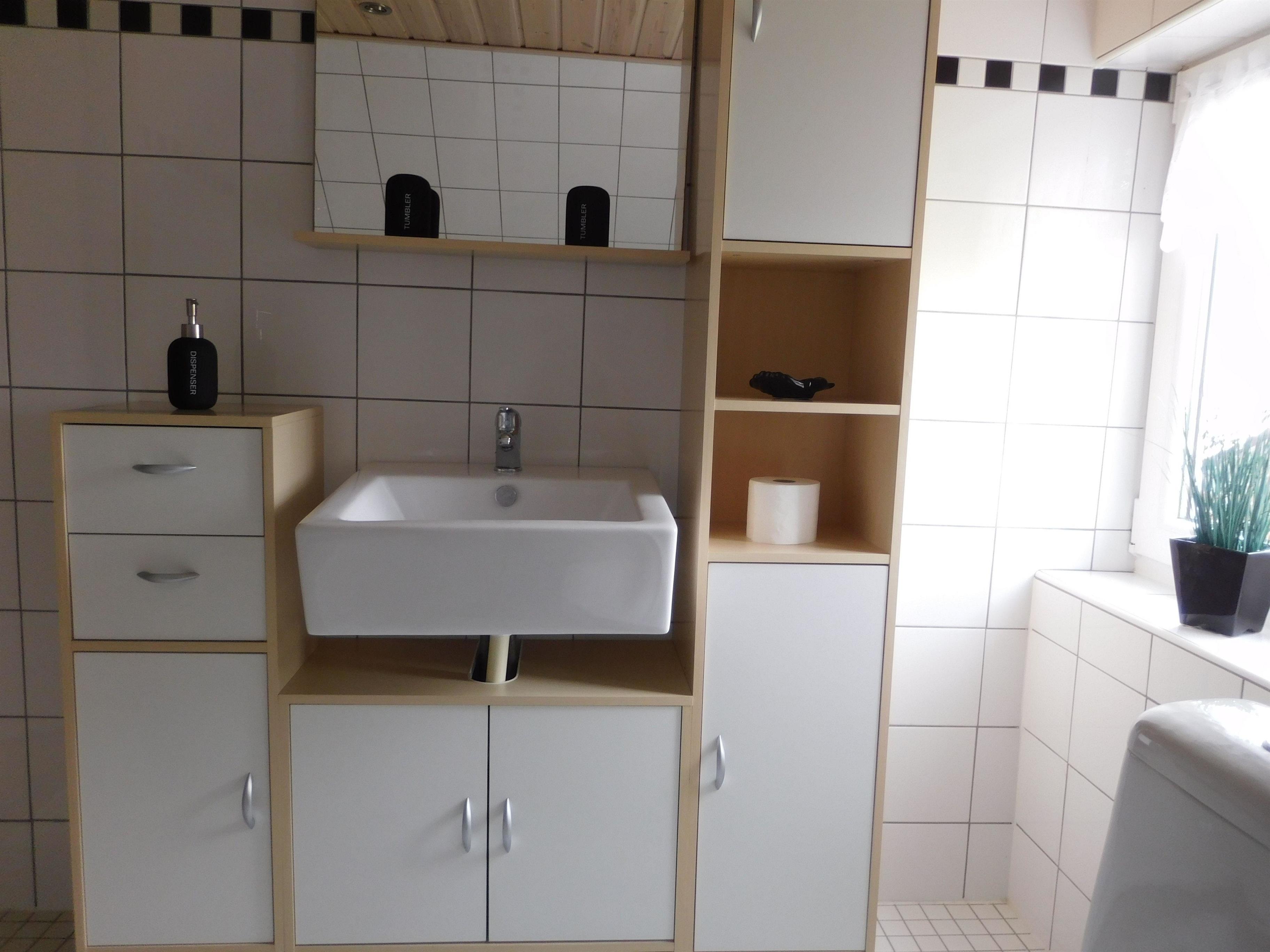 Auch das Badezimmer ist zweckmäßig mit Badewanne, WC, Waschbecken und Schrankplatz eingerichtet. Ein Föhn ist vorhanden. Als Erstausstattung haben wir Handseife und Toilettenpapier bereitgelegt.