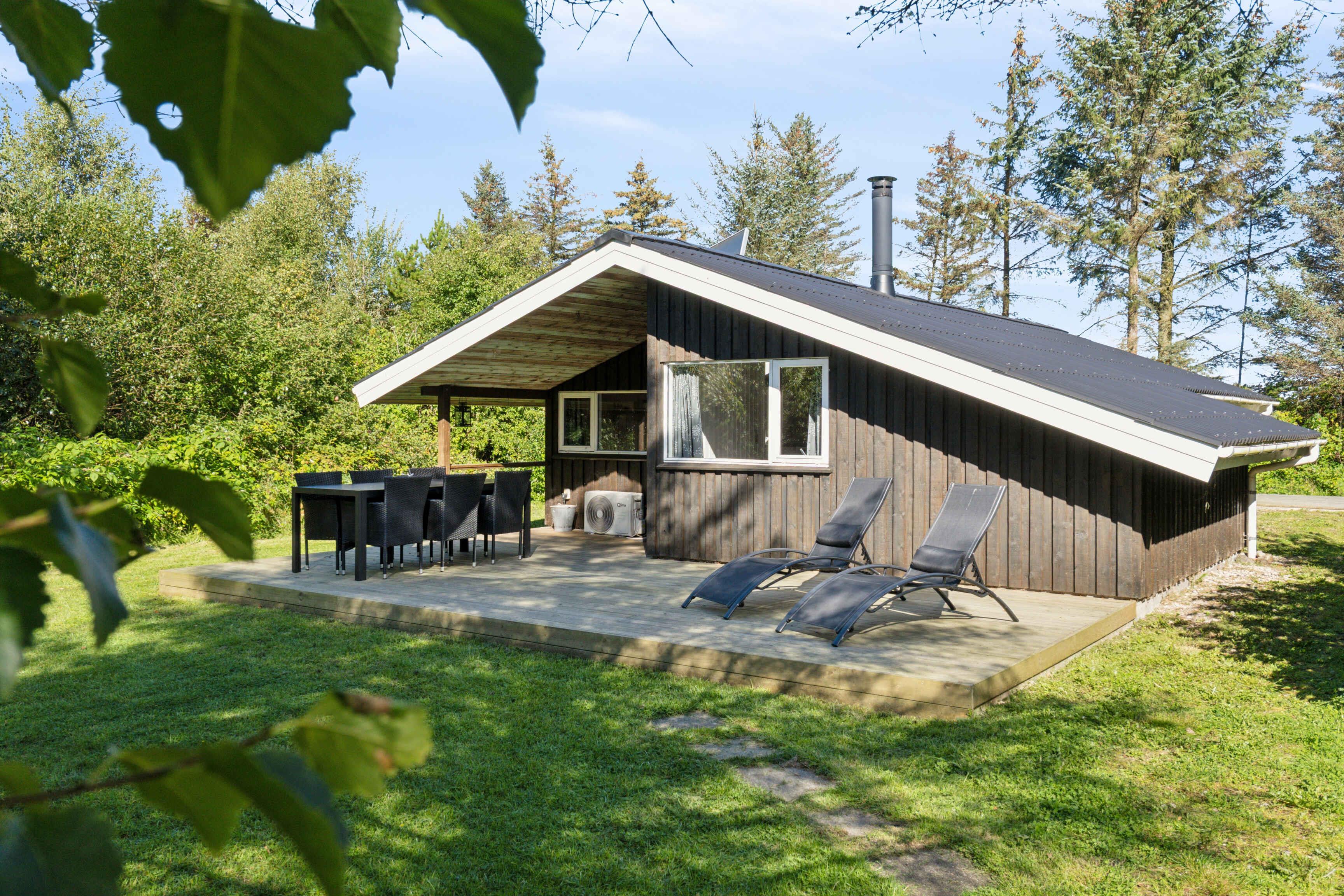 Hyggeligt træsommerhus tæt på Vesterhavet med privat naturgrund og sydvendt terrasse for familie og kæledyr.