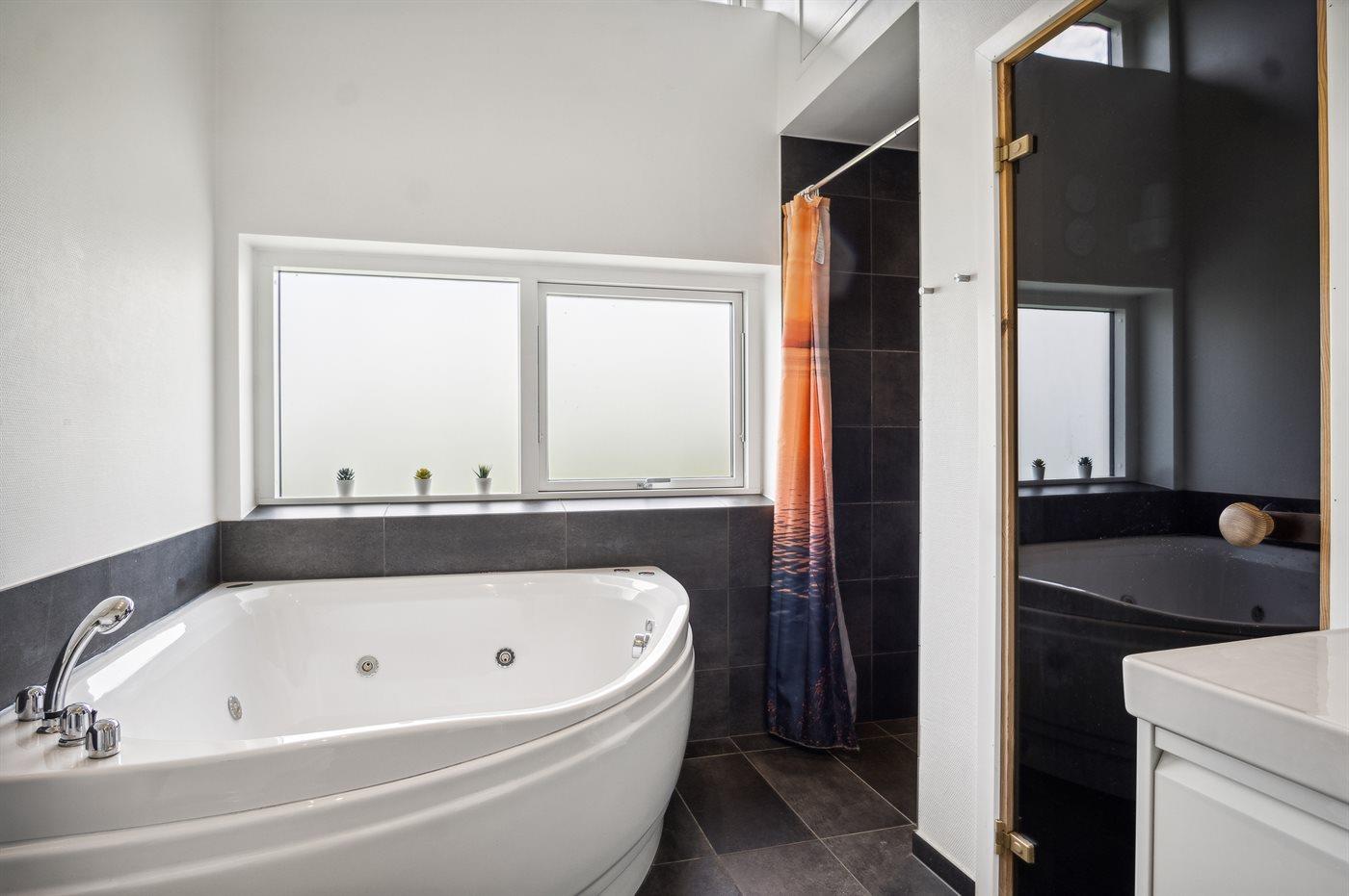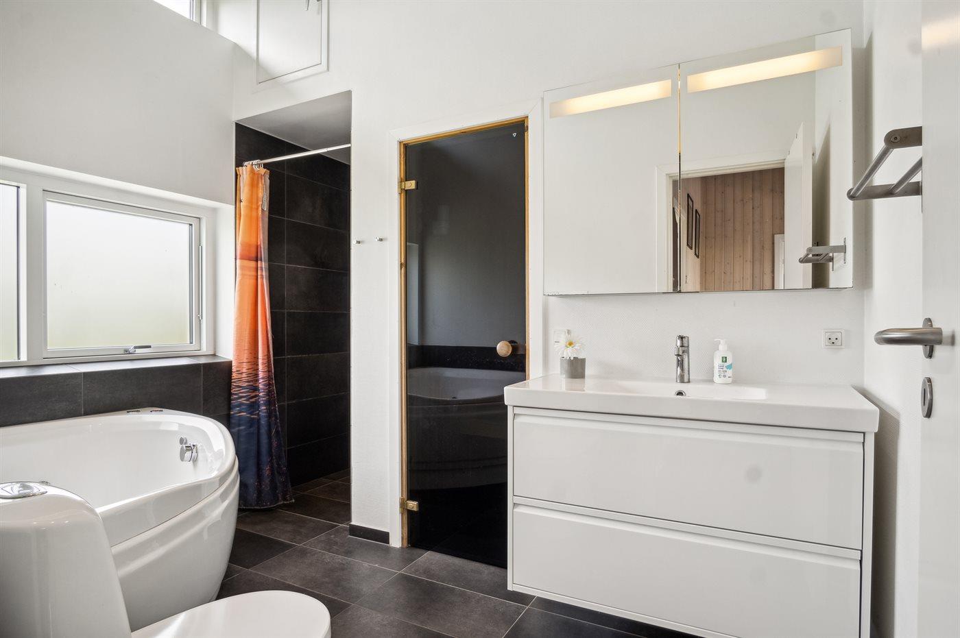 Der er 2 badeværelser med bruseniche og 2 toiletter. Der er gulvvarme på 2 badeværelser. I saunaen er der mulighed for afslapning.
