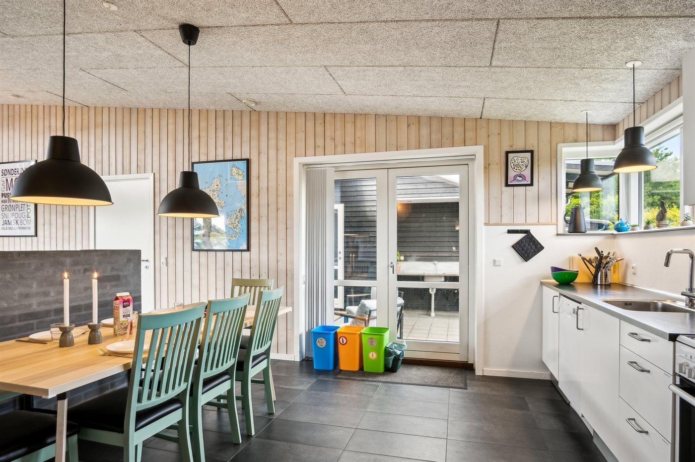 Køkkenet er udstyret med 1 køleskab. Der er 4 keramiske kogeplader, varmluftovn, mikrobølgeovn samt opvaskemaskine.