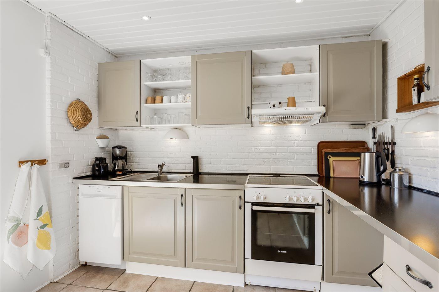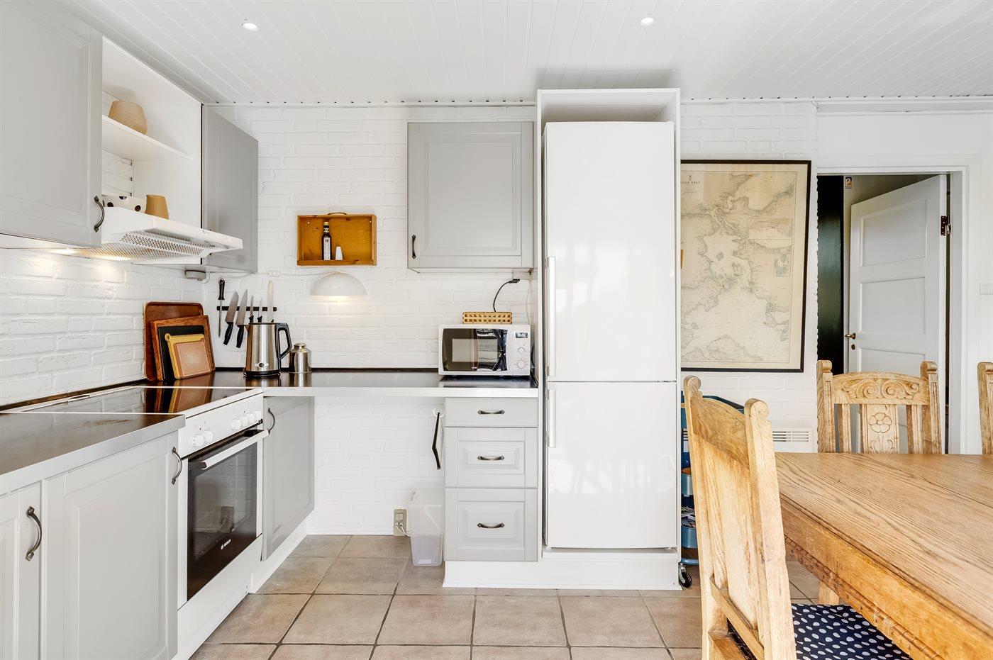 Køkkenet er udstyret med 1 køleskab. Der er 4 keramiske kogeplader, varmluftovn, mikrobølgeovn samt opvaskemaskine Der er gulvvarme i køkkenet.