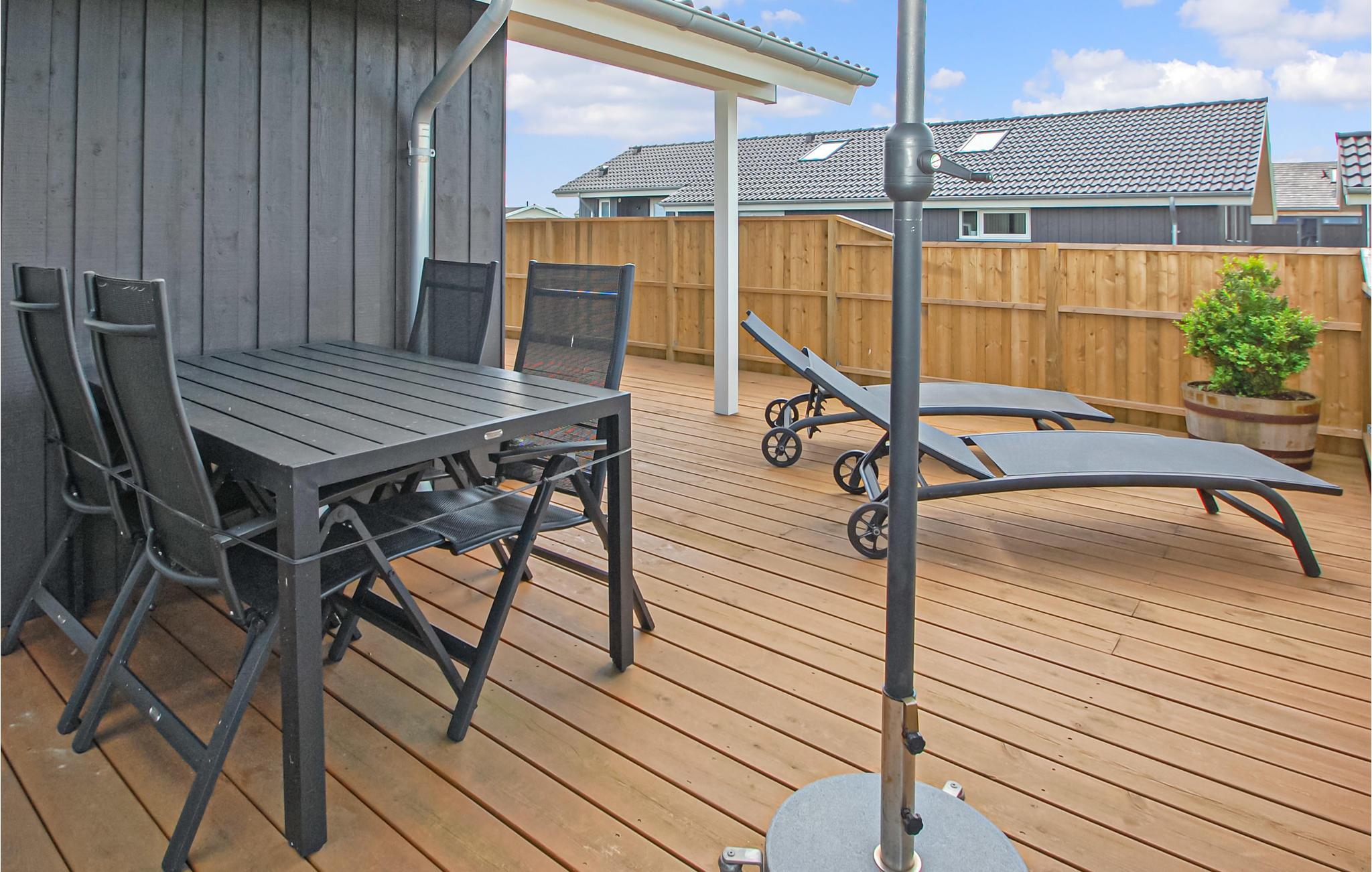 Moderne træhus nær Flovt Strand med spabad, sauna og store terrasser til afslapning.