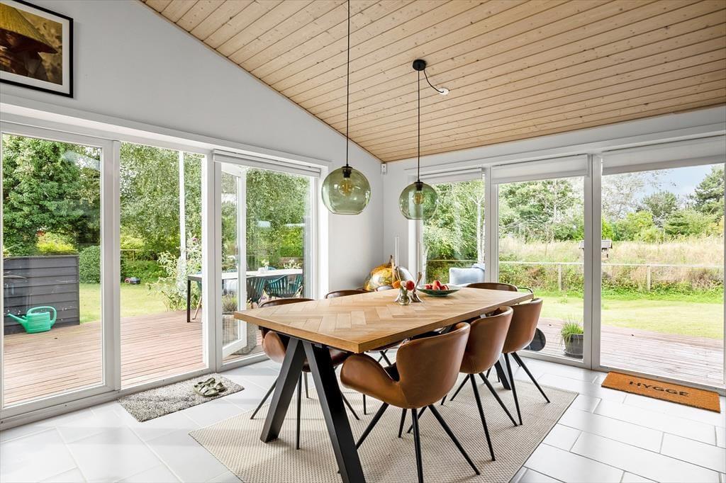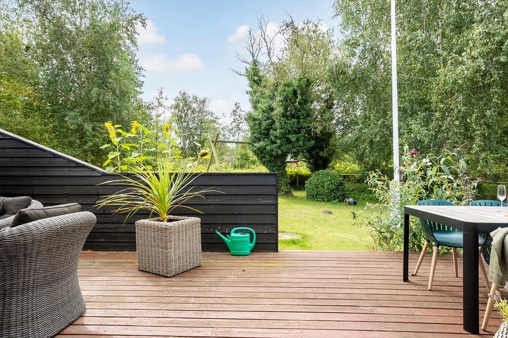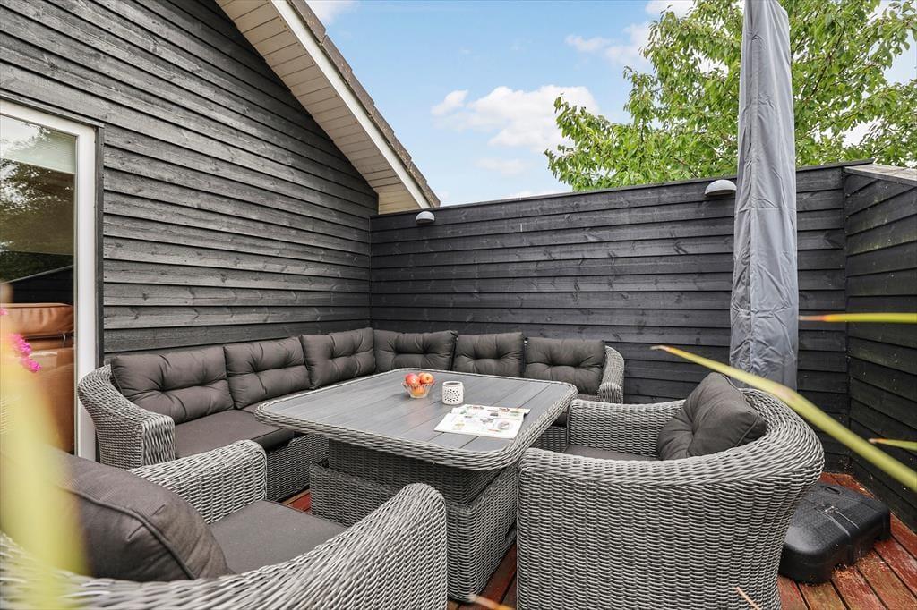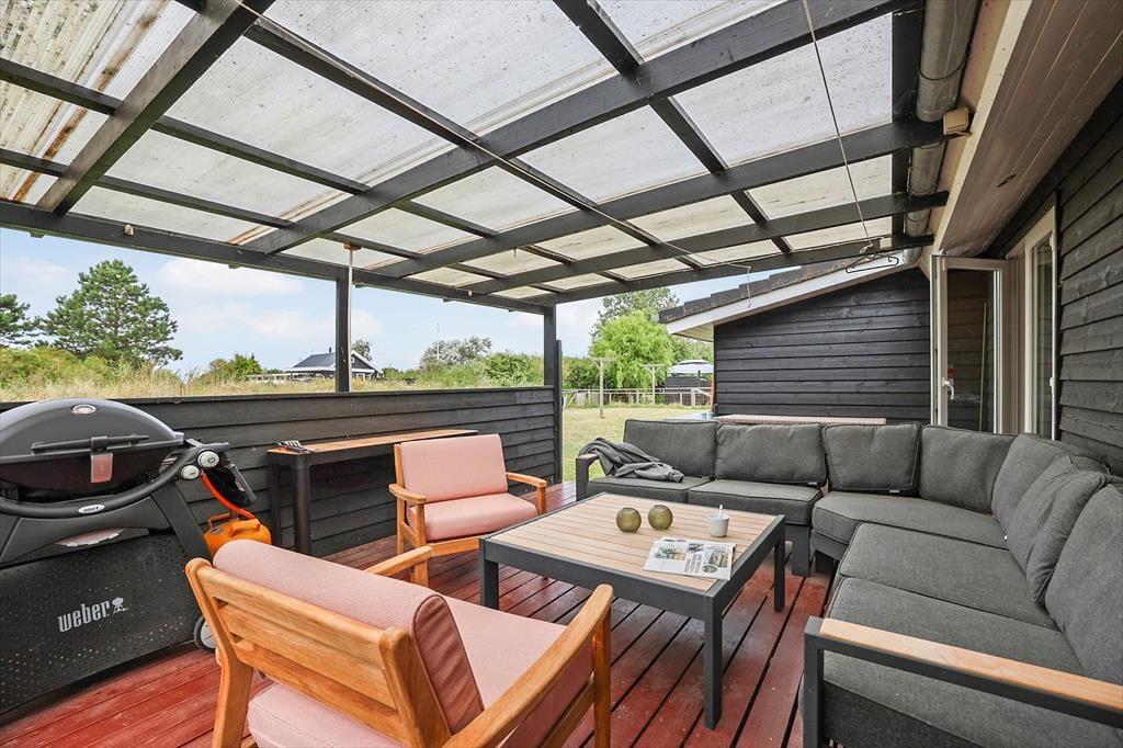 Nyd livet udenfor: Her er der rig mulighed for at nyde udelivet og solens stråler. Huset har en stor skøn terrasse, hvor en del er overdækket. Terrassen har flere siddemuligheder og flere komfortable havemøbler, perfekt til at nyde morgenkaffen eller de stille aftener. Fra flere af husets rum er der direkte udgang, hvor du kan nyde en kop kaffe og bare slappe af med en god bog. Tag en tur til stranden for en forfriskende dukkert eller en hyggelig strandtur. I haven er der en sti, der fører videre til den fine strand. Tilbered en lækker grillmiddag om aftenen og benyt det fine udekøkken, huset også har til rådighed.