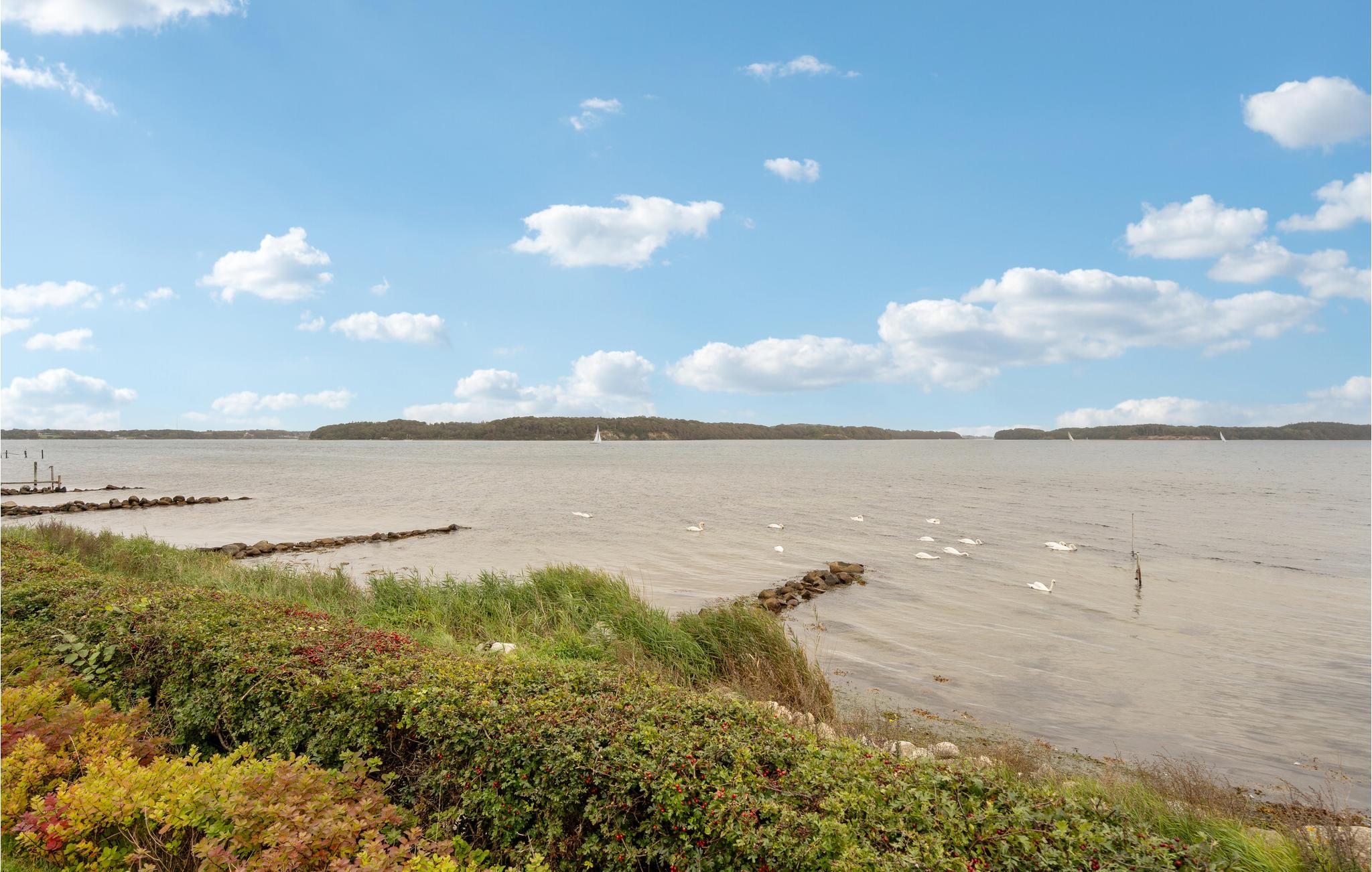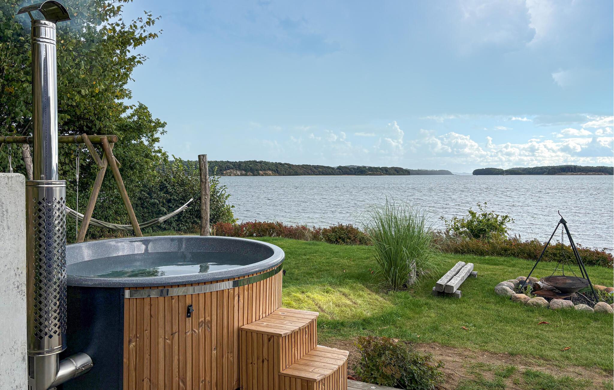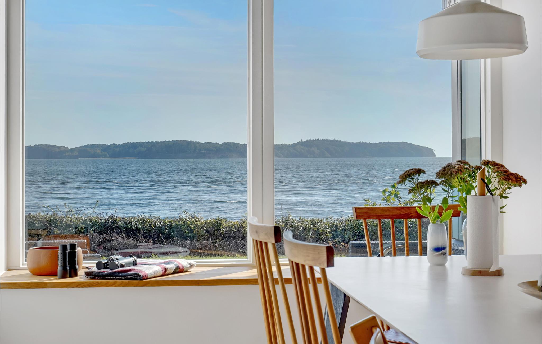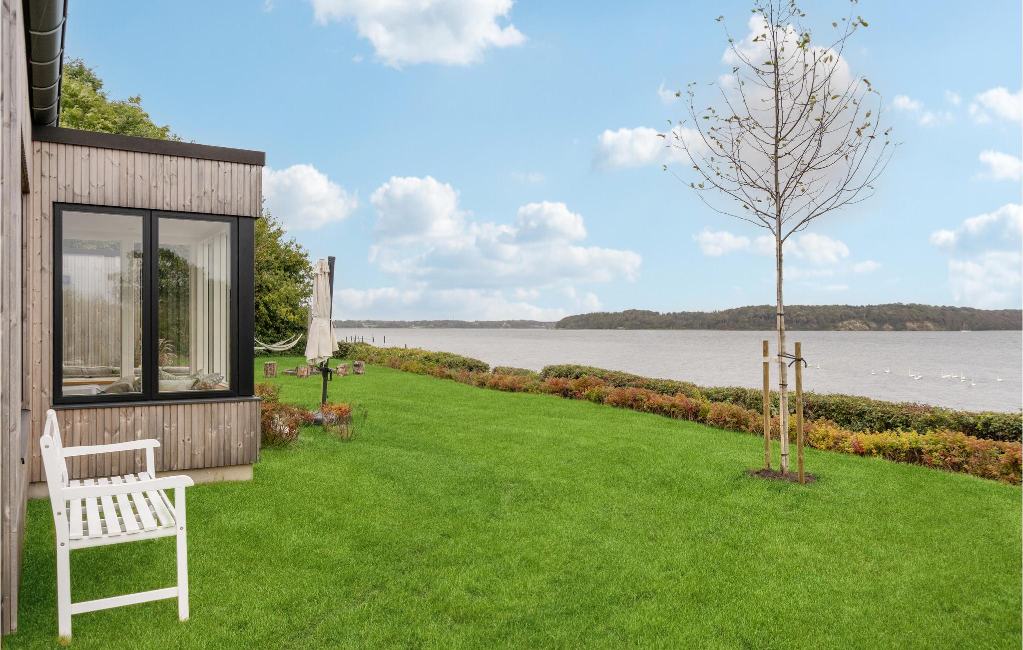 Moderne feriehus med panoramaudsigt ved Kolding Fjord, privat have, vildmarksbad og tæt på strand i naturskønne omgivelser.