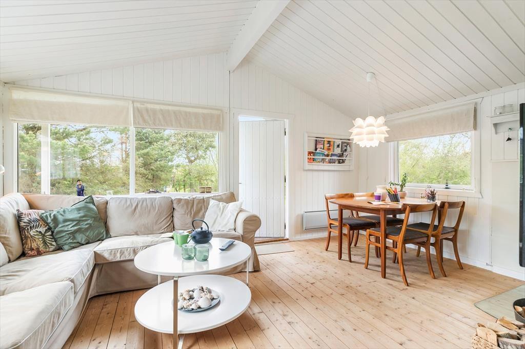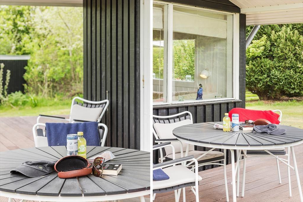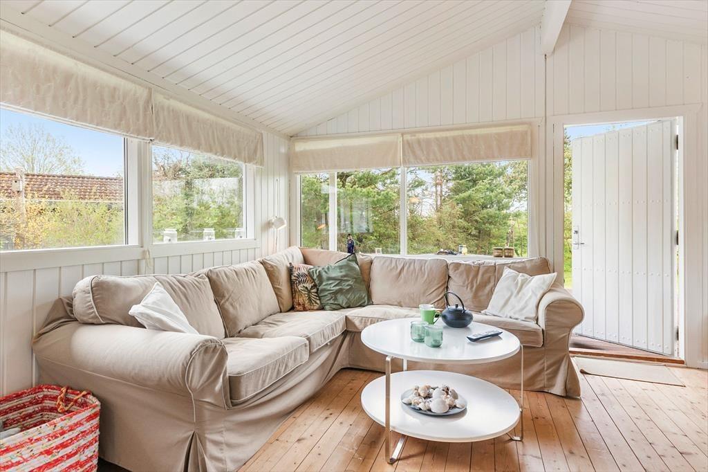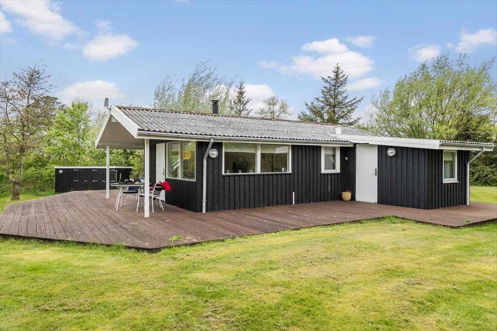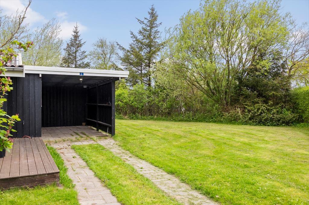 Naturgrunden er stor og grøn, og randbeplantningen skærmer udearealerne godt af, så det er et dejligt sted at være, når solen skinner fra oven, og du har en kølig forfriskning ved din side. Husets træterrasse er stor, så der er flere steder, du kan slå dig ned – inklusiv et overdækket areal, hvis du vil blive ude, selvom tusmørket breder sig, og duggen snart vil falde. Børn og barnlige sjæle vil elske at have plads til at spille bold og dyste i havespil på græsplænen, og mon ikke, at luften føles ekstra ren og frisk, når du bor bare 200 meter fra kysten?