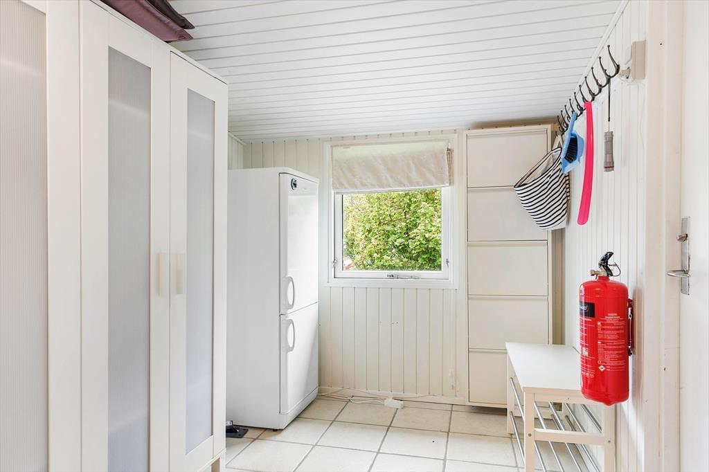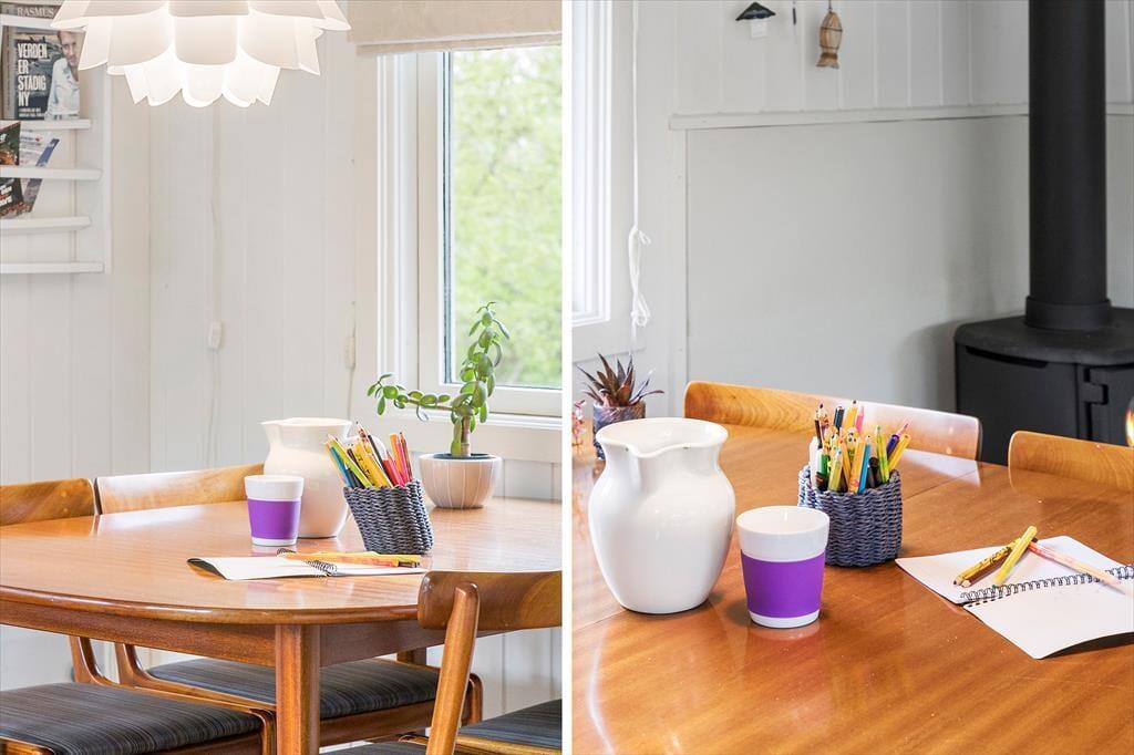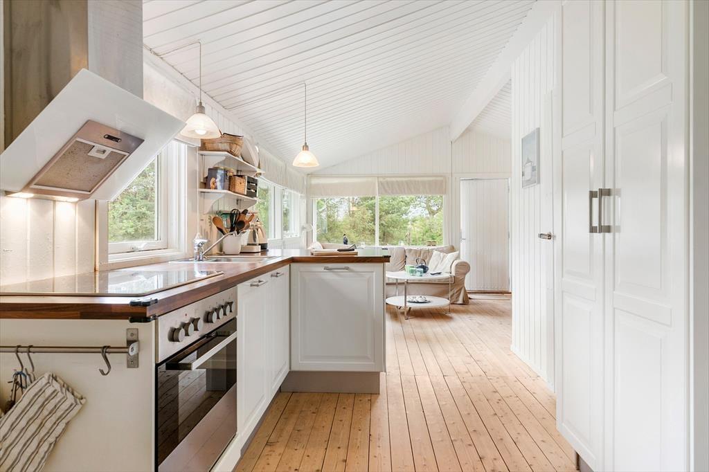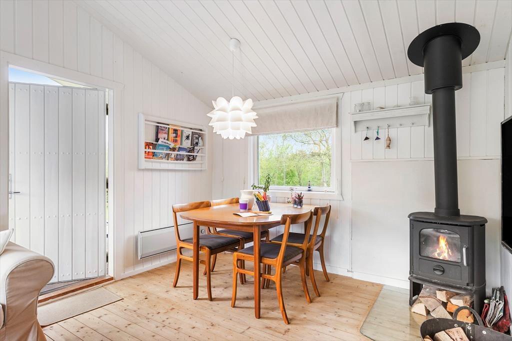 Sommerhusets 60 m2 er godt udnyttede, og du og dine kære kan se frem til at slappe af i lyse og stemningsfulde omgivelser. Planløsningen byder på en rummelig entré, to gode soveværelser og et badeværelse med bruseniche, men de fleste af dagens vågne stunder kommer sikkert til at udspille sig i opholdsrummet, hvor stuen og køkkenet er forenet. Hvis det ikke er dig, der har madtjansen, kan du eventuelt sætte dig på en af barstolene for at holde kokken med selskab, og du har selvfølgelig også mulighed for at slænge dig i sofahjørnet med en krydsogtværs eller en god bog – og udsigt til den hyggeskabende brændeovn.
