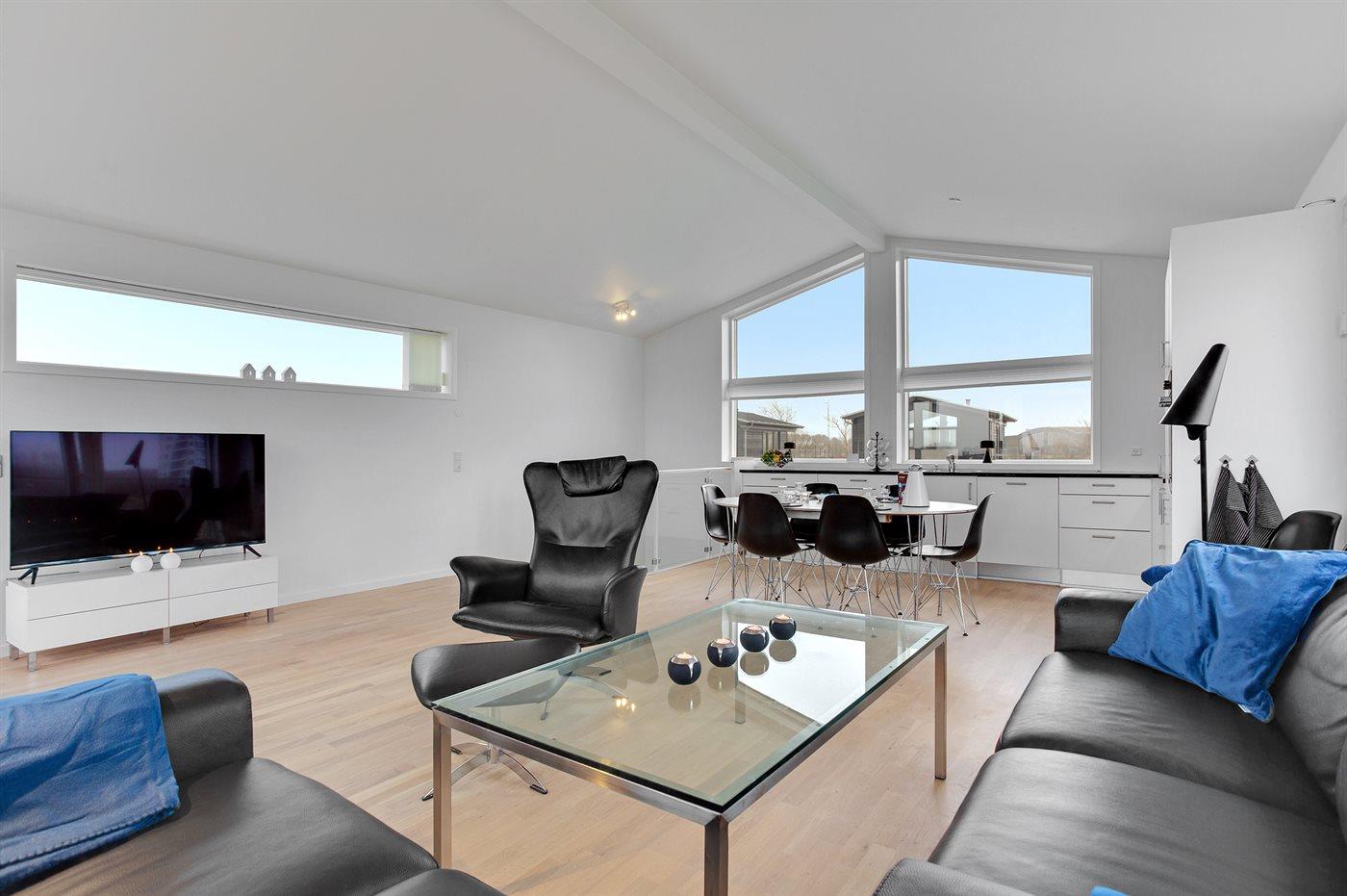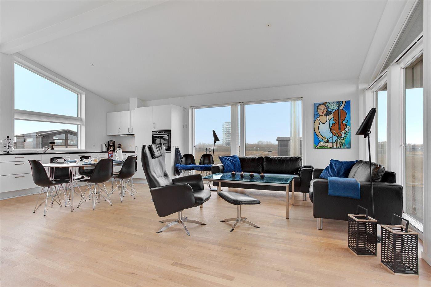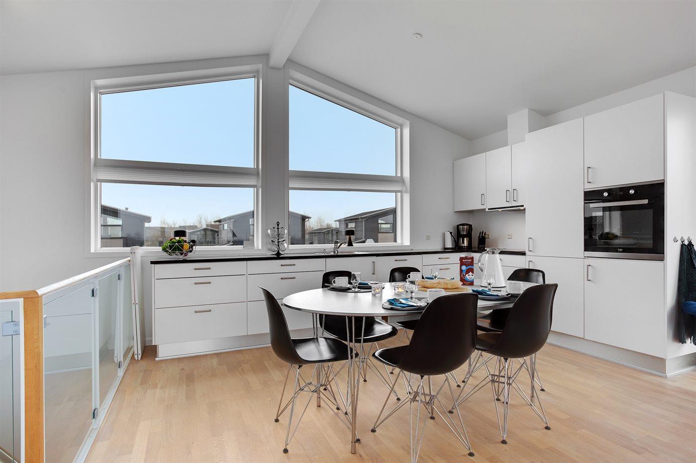 Køkkenet er udstyret med 1 køleskab. Der er 4 induktionskogeplader, varmluftovn, mikrobølgeovn samt opvaskemaskine.