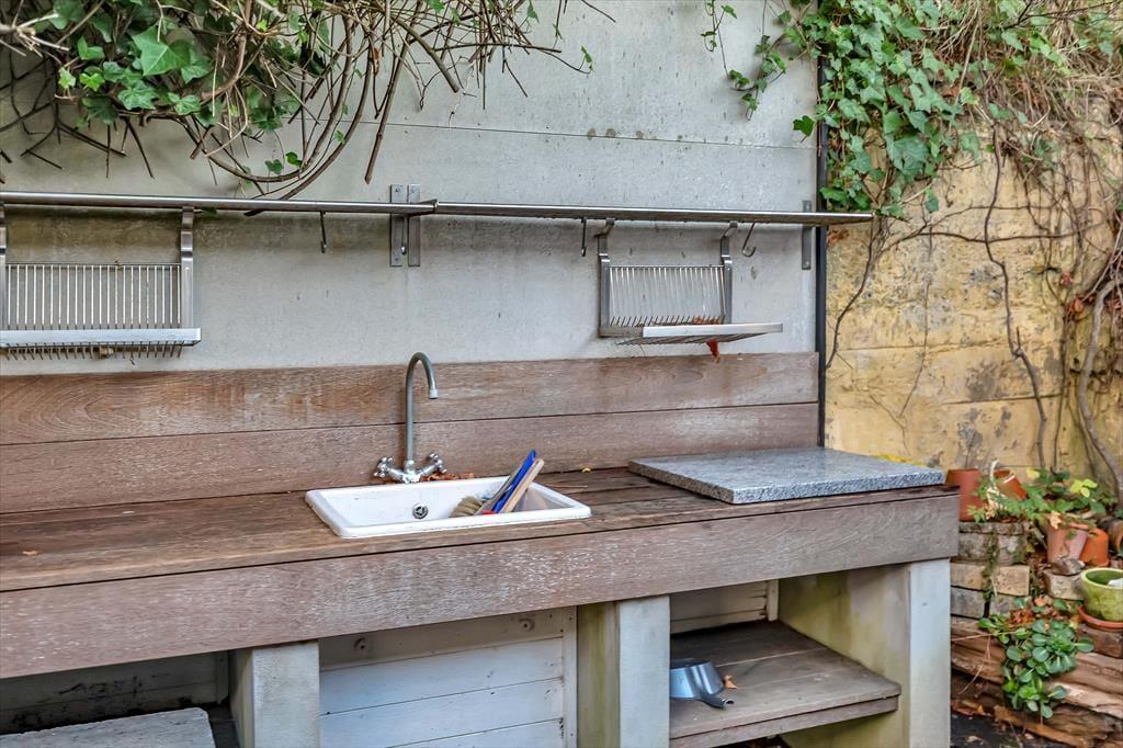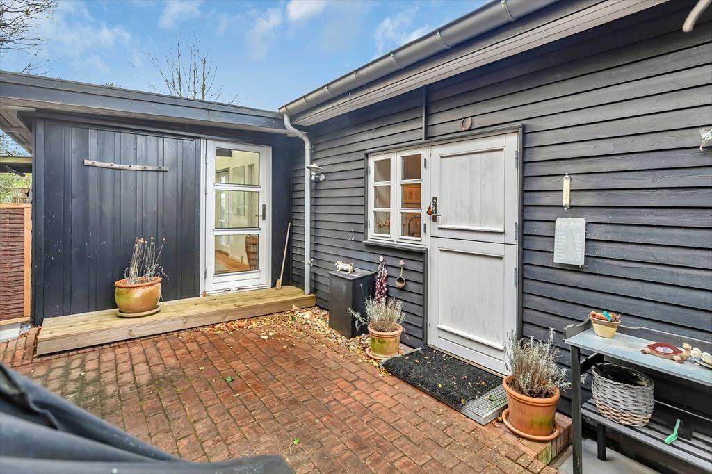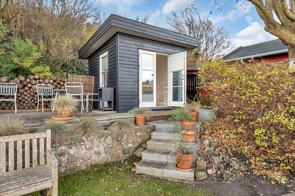 Fra spisestuen er der flere udgange til den store flotte træterrasse med flere grupper af stole/borde, så der er mulighed for at nyde solen og den uovertrufne udsigt på flere pladser. En del af terrassen er overdækket, hvilket giver endnu en opholdsmulighed. Terrassen er den oplagte plads for en god grillaften med et glas vin, hvor man er i et med naturen og den friske fjordduft. Fra hovedhuset går du direkte over terrassen til annekset hvor der er to sovepladser – også med direkte fjordudsigt. Er du til lidt skygge , så er der på siden af huset endnu en terrasse samt udendørs vask/bord. Du kan også gå på opdagelse ad trappen i baghaven, som fører op til endnu en terrasse hævet op over huset og med mulighed for udsigt til Frederiksværk. Fjorden er oplagt til en tur i kajak eller en dejlig svømmetur, og efter svømmeturen går du direkte ind i underetagen af huset hvor du finder huset bad.