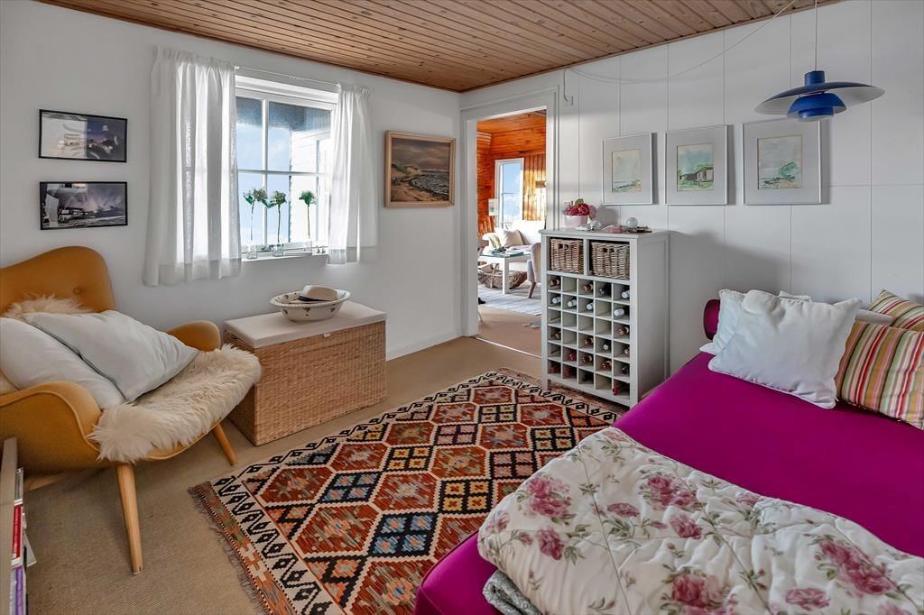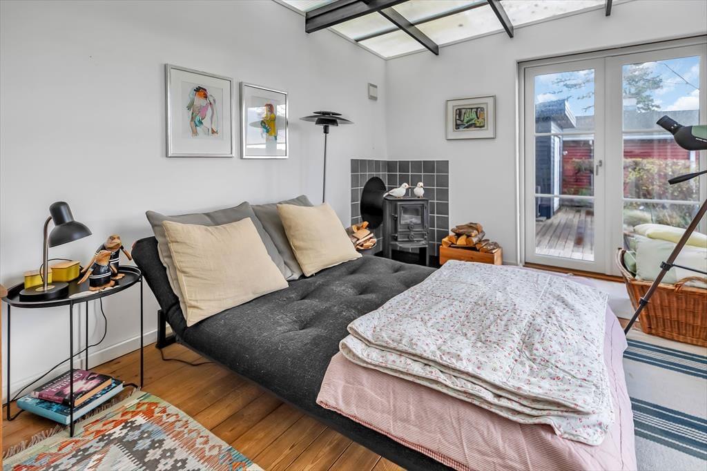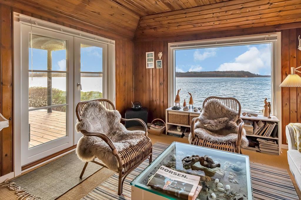Dette sommerhus ligger i vandkanten på en skrånende grund, og fra du træder ind i køkkenet til du fortsætter ind i stuerne, er der direkte udsigt til Roskilde fjord overalt. Der er en hyggestue med TV, videre gennem et mellemgangsrum med udtræksseng og ind i spisestuen med naturligt ovenlys kombineret med de store vinduespartier direkte mod fjorden; nyd ilden fra brændeovnen ved siden af en dejlig day bed, hvor man kan ligge og hygge mens man nyder udsigten; alt fremtræder lyst og imødekommende.
