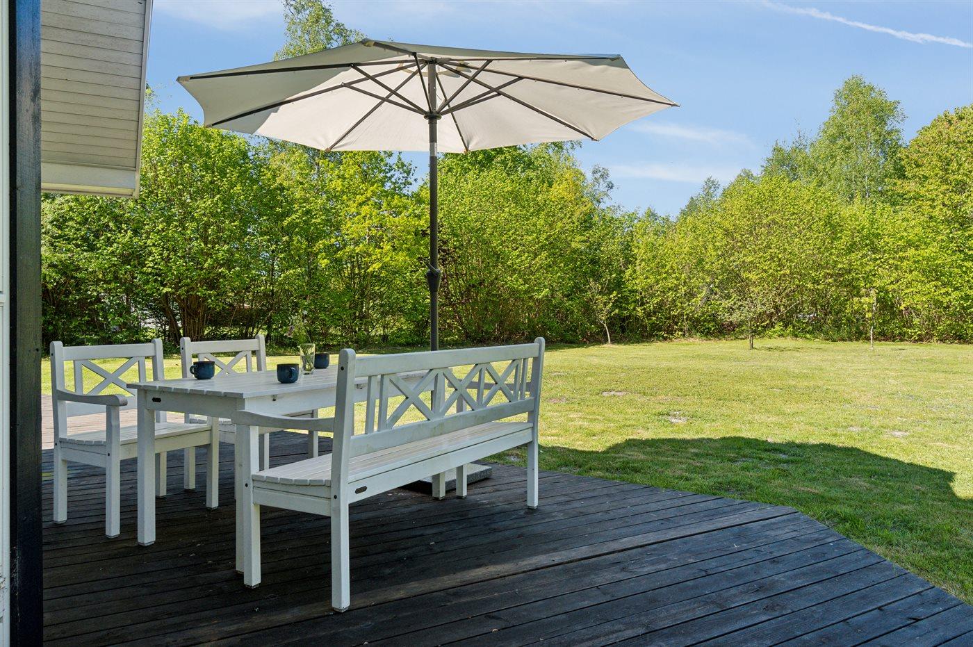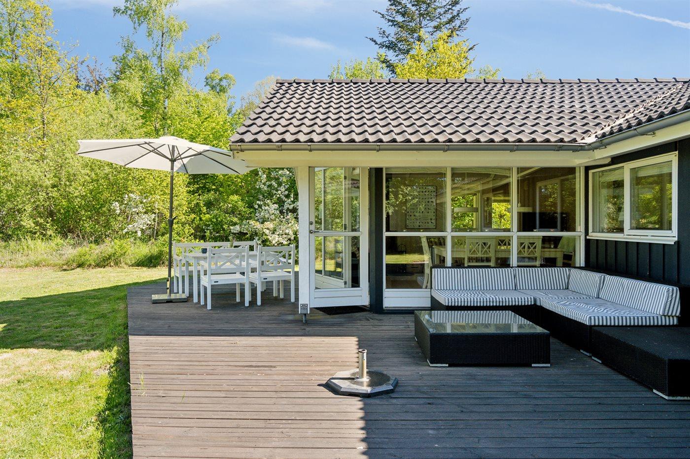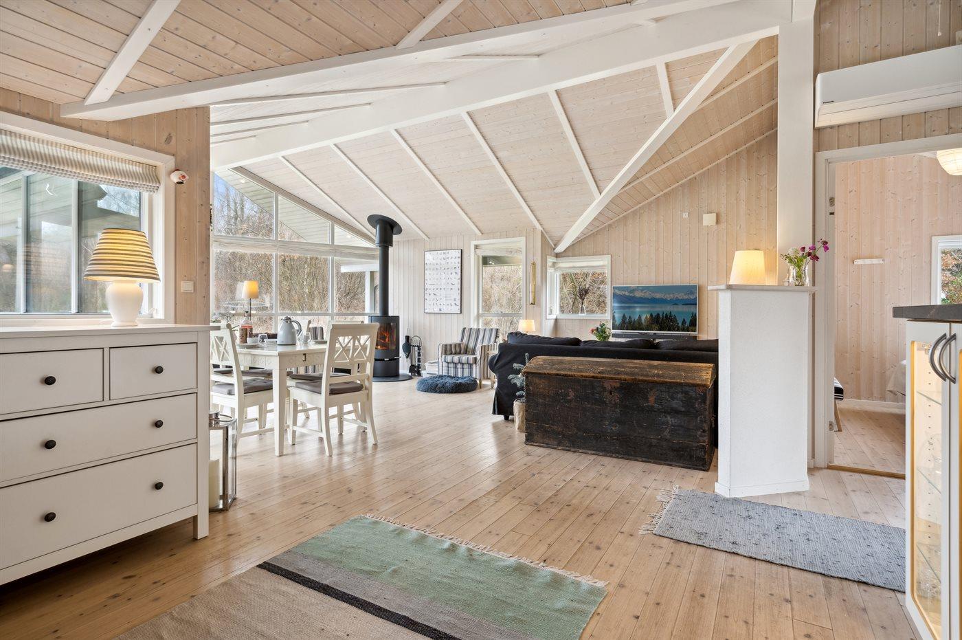 Sommerhuset fremstår lyst og moderne med en rigtig god indretning og fra den lyse stue kan man træde direkte ud på den store terrasse, hvorfra man kan nyde udsigten over de dejlige omgivelser. Her er altid mulighed for at finde en krog med læ og nyde solen, hvad enten det er på terrassen, som vender ud mod haven eller i det hyggelige og lukkede gårdmiljø på forsiden af sommerhuset. Også her kan man sidde fuldstændig ugenert.