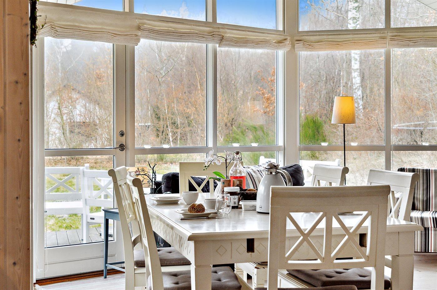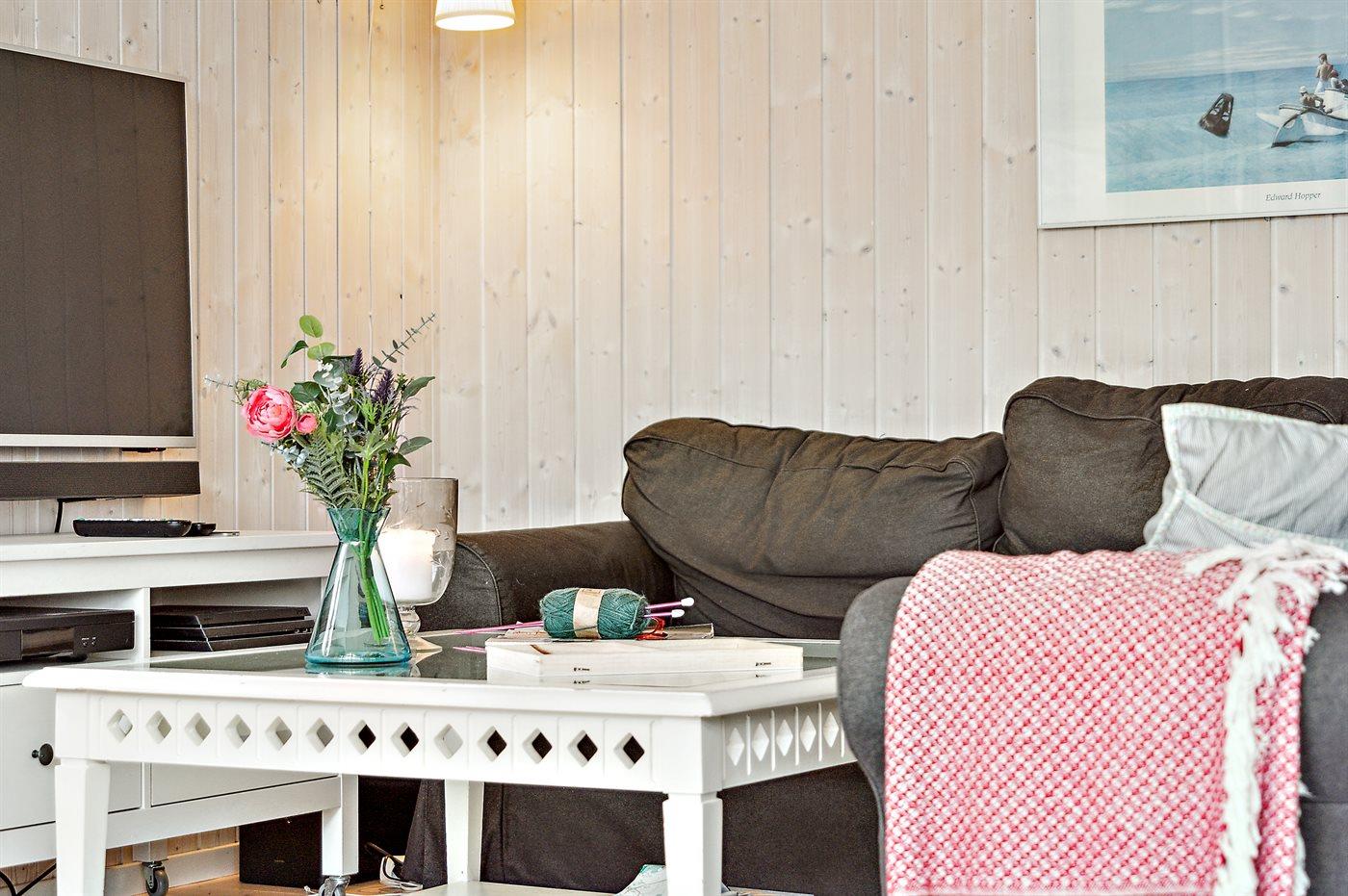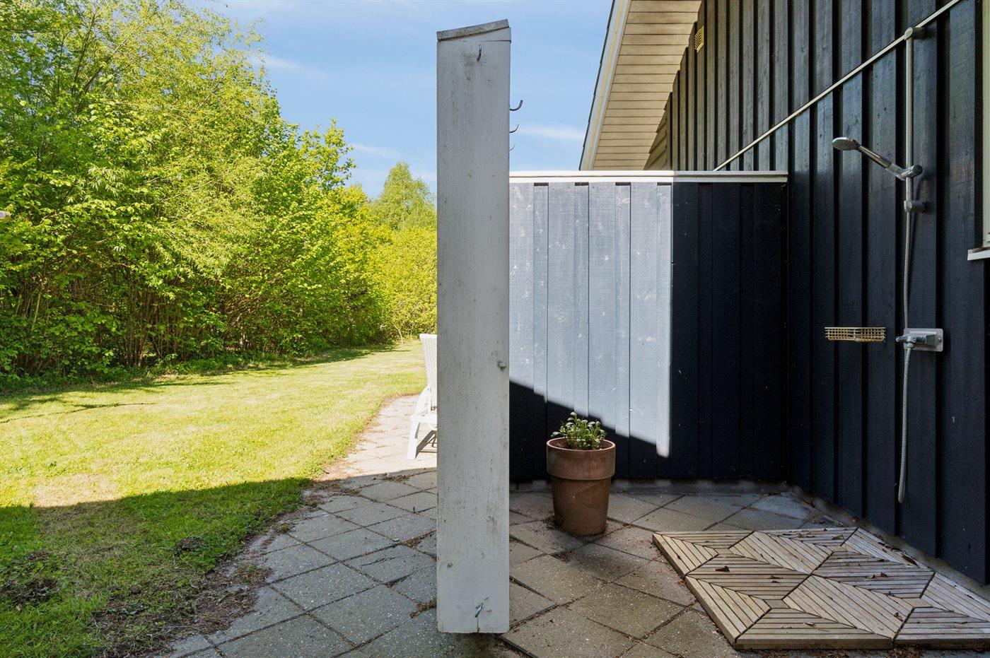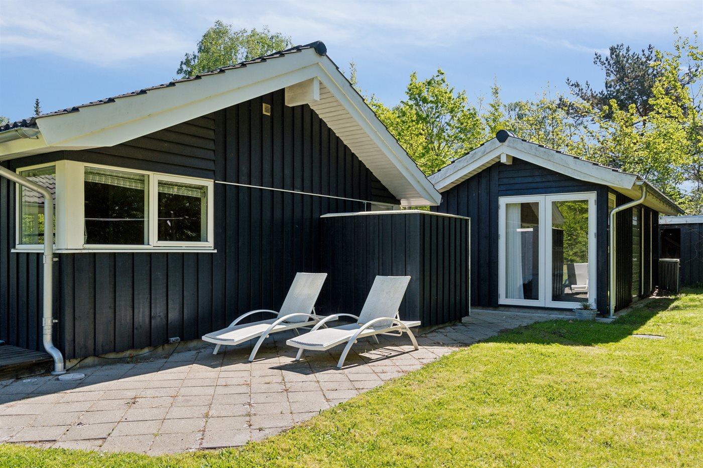 Sommerhuset fremstår lyst og moderne med en rigtig god indretning og fra den lyse stue kan man træde direkte ud på den store terrasse, hvorfra man kan nyde udsigten over de dejlige omgivelser. Her er altid mulighed for at finde en krog med læ og nyde solen, hvad enten det er på terrassen, som vender ud mod haven eller i det hyggelige og lukkede gårdmiljø på forsiden af sommerhuset. Også her kan man sidde fuldstændig ugenert.