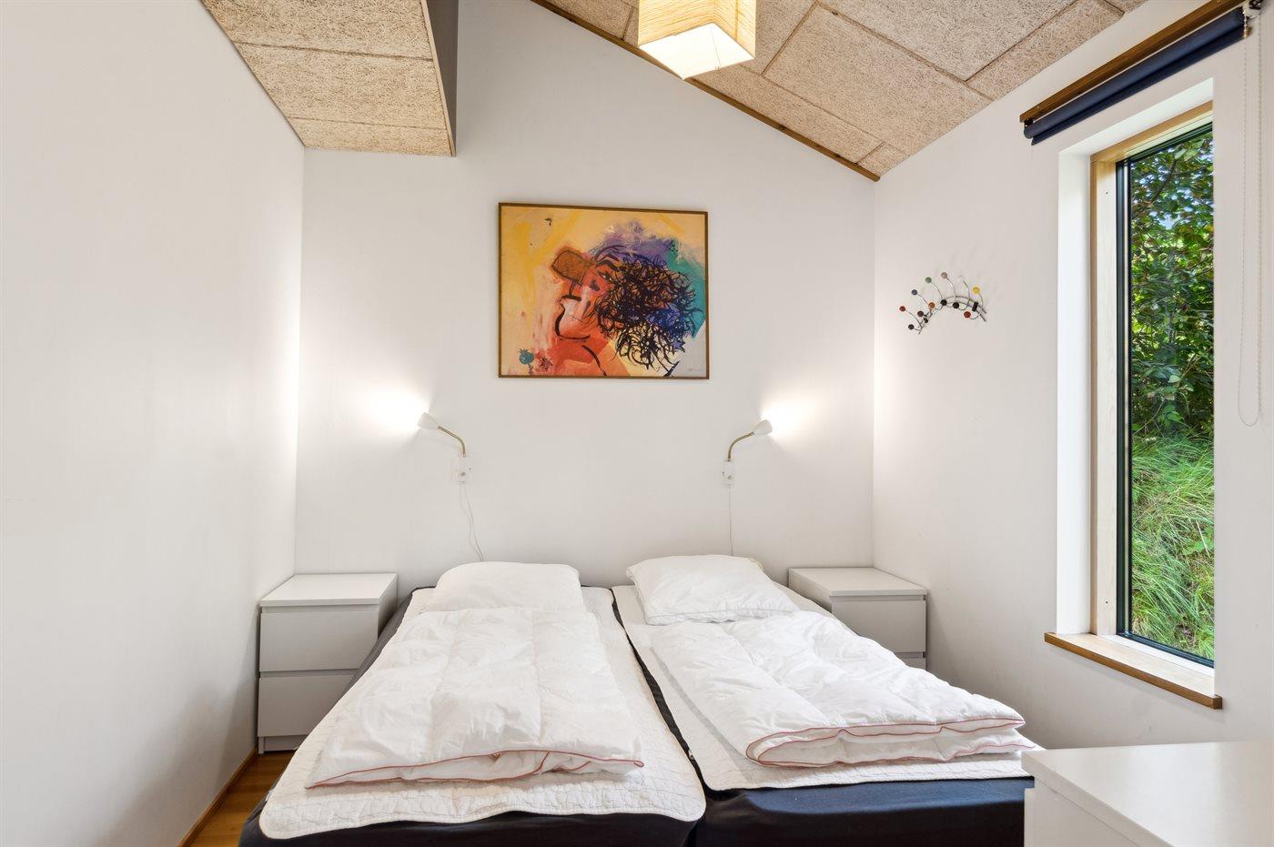 Der er i alt 3 soveværelser. Sovepladserne fordeler sig på: 4 sovepladser i dobbeltsenge. 1 soveplads i enkeltseng. 2 sovepladser på madrasser. 2 af disse sovepladser befinder sig på husets hems. Derudover er der 1 stk. barneseng.