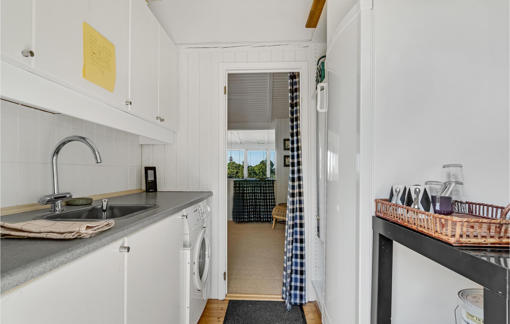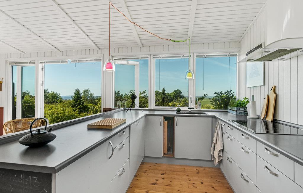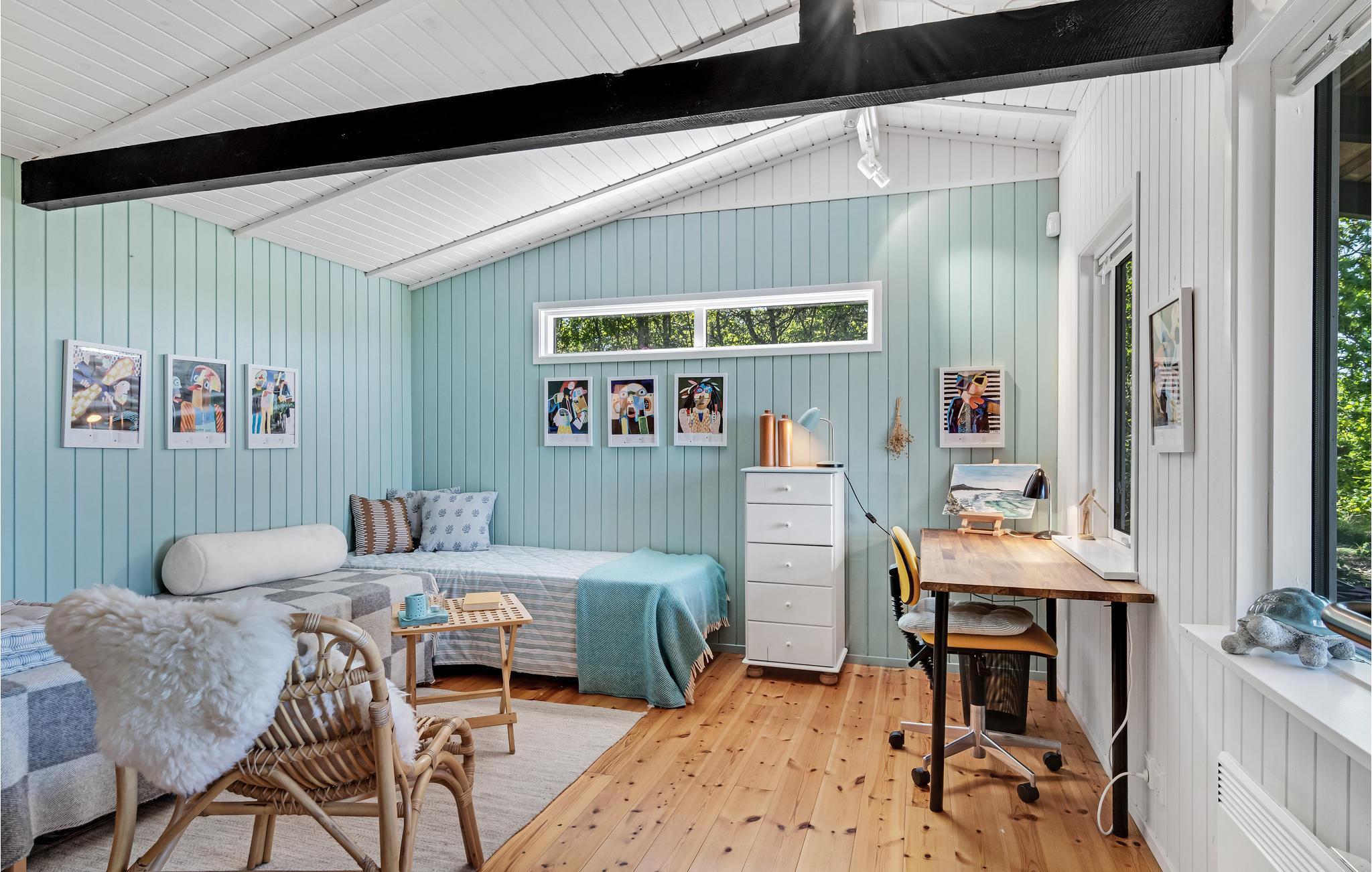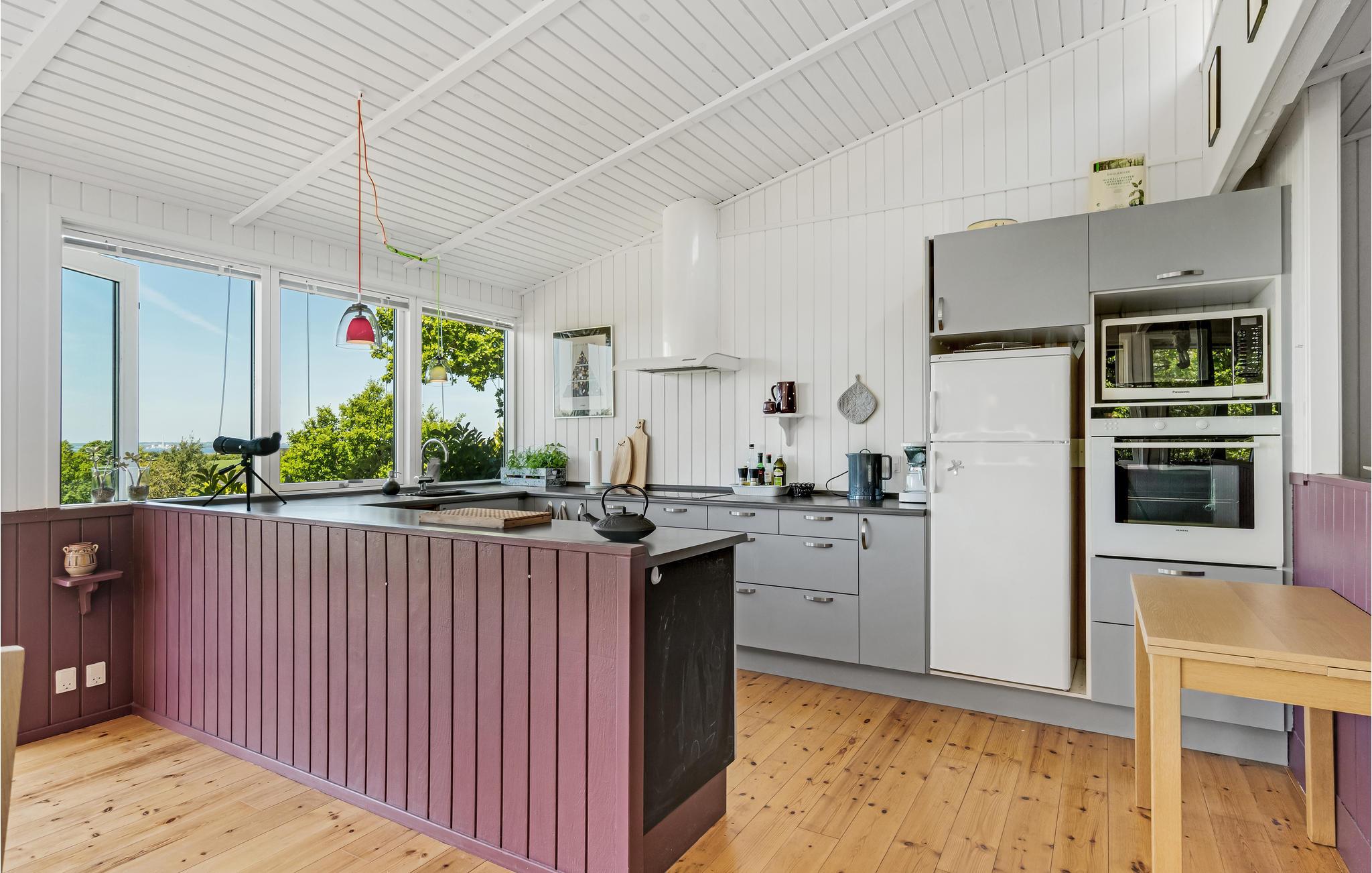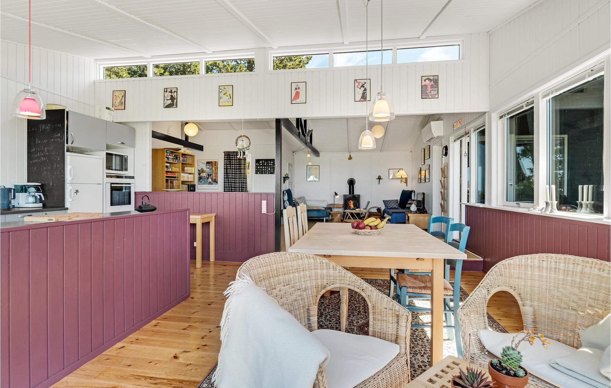 Her kan I nyde lyset og naturen, også på gråvejrsdage med ild i brændeovnen. Huset er hyggeligt udformet med et stort, åbent fællesareal, hvor I kan samles til rolige stunder efter en lang dag med oplevelser. Træværket er malet i behagelige farver, og boligen emmer af ro og afslapning.