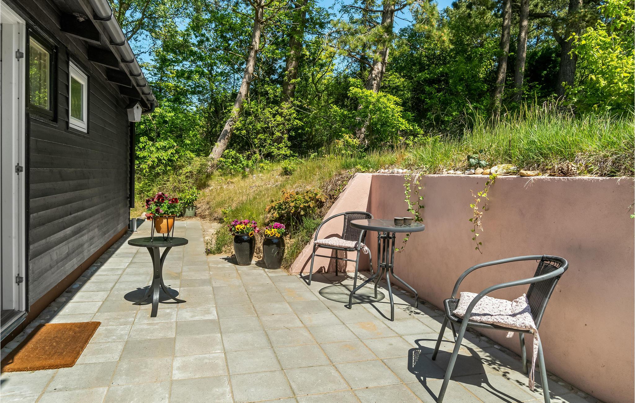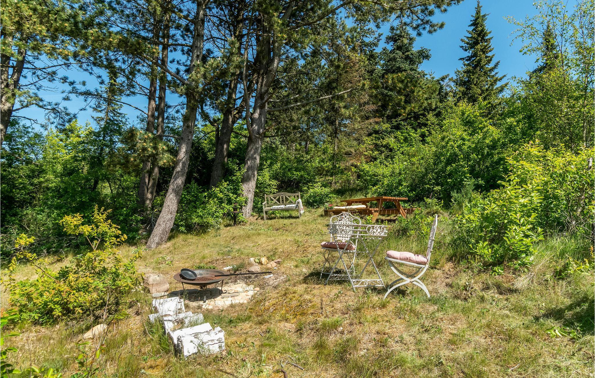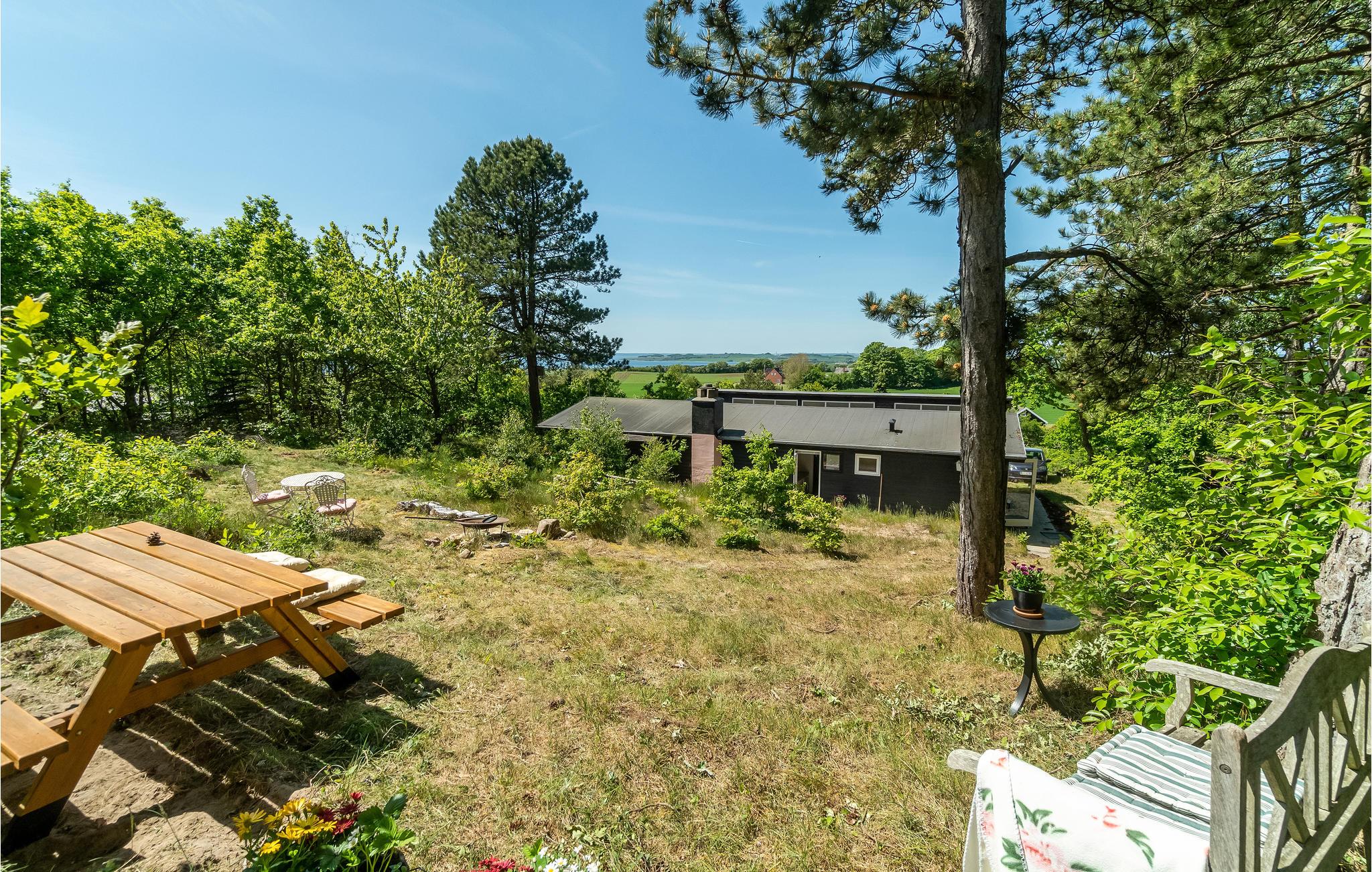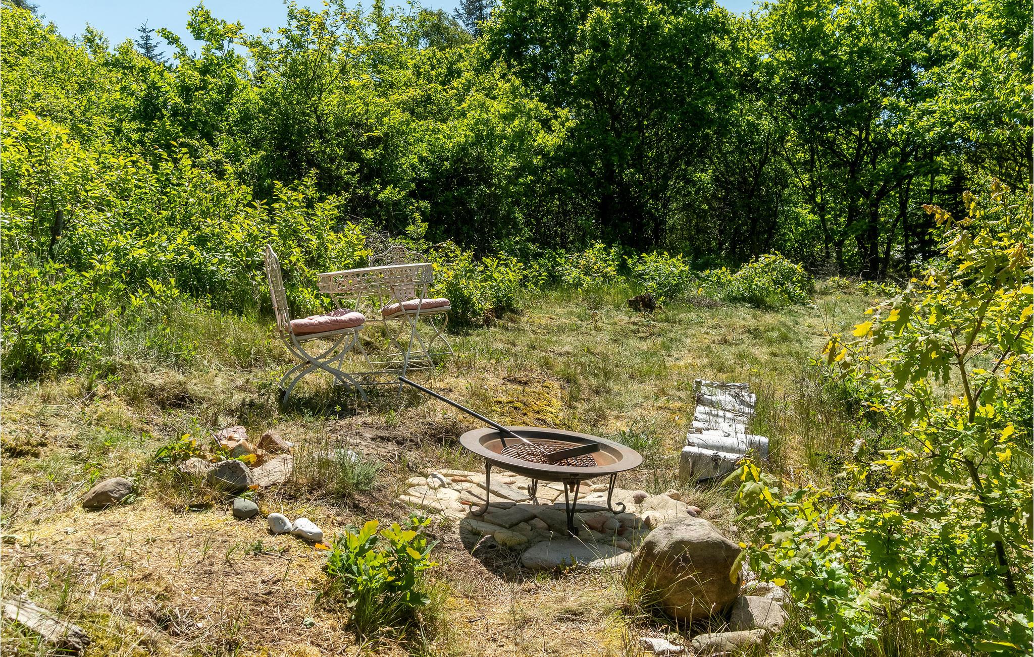 Huset ligger ugenert på en stor grund på en bakke skrånende mod vest, så man kan se ud over Begtrup Vig, Knebel Vig og Aarhusbugten. Bag huset er der desuden en bålplads, hvor I kan samles til aftenhygge i de lyse sommernætter. I kan begynde dagene med en kop kaffe på husets charmerende terrasse med morgensol, hvor I sidder helt i læ. Dæk op til sommerens måltider i det fri og tag ferieplanlægningen med ud, så I kan nyde rammerne imens.