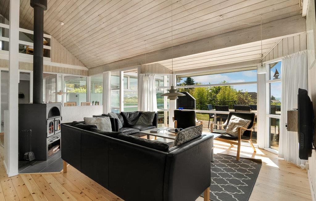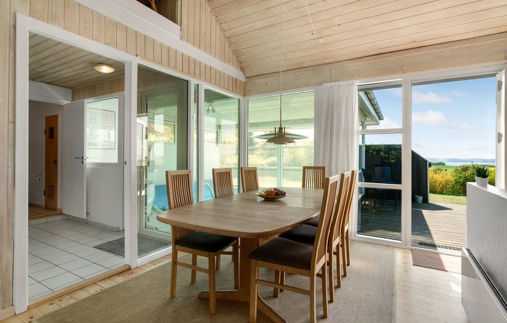 Midt på det skønne Mols ligger dette attraktive feriehus. Fra huset er der en enestående udsigt over marker og bakker i forgrunden og havet i baggrunden. På den store terrasse er der rig mulighed for at slappe af og solbade, mens resten af familien kan lege og spille bold på den store naturgrund. Indendørs er ligeledes mange muligheder. I kan udfordre hinanden i skak på det opstillede skakbræt, tage en svømmetur i den dejlige swimmingpool eller få masseret musklerne i spabadet."På hemsen er der indrettet legerum med bl.a. tv med dvd, cromecast og wifi til husets 100 Mbit/s fibernet. Huset er med sin størrelse velegnet til flere familier. Der er mange muligheder for vandreture på de mange stier i de naturskønne Mols Bjerge. Kun 15 min. kørsel fra Ebeltoft. Det 5. soverum er på hemsen.