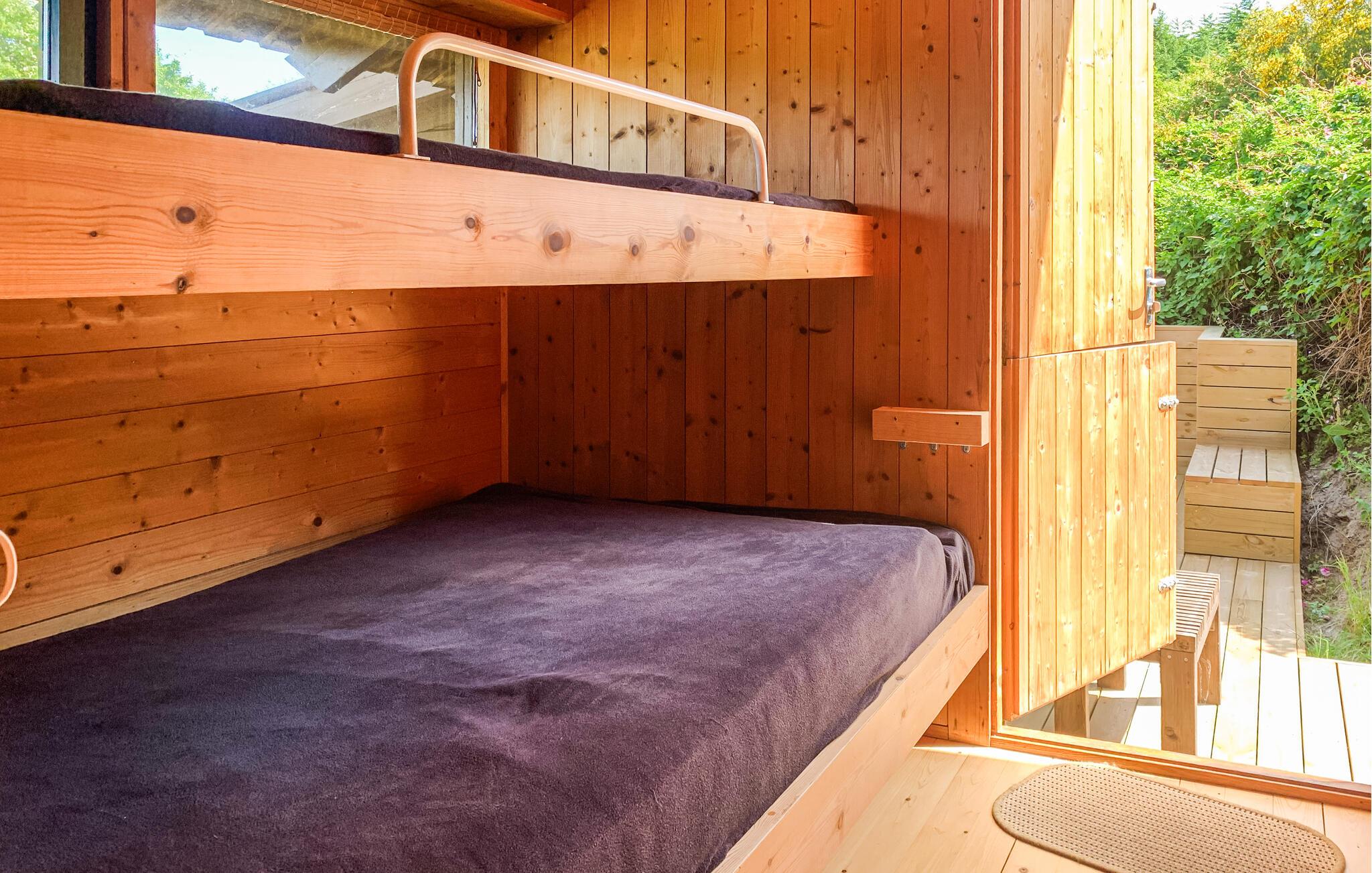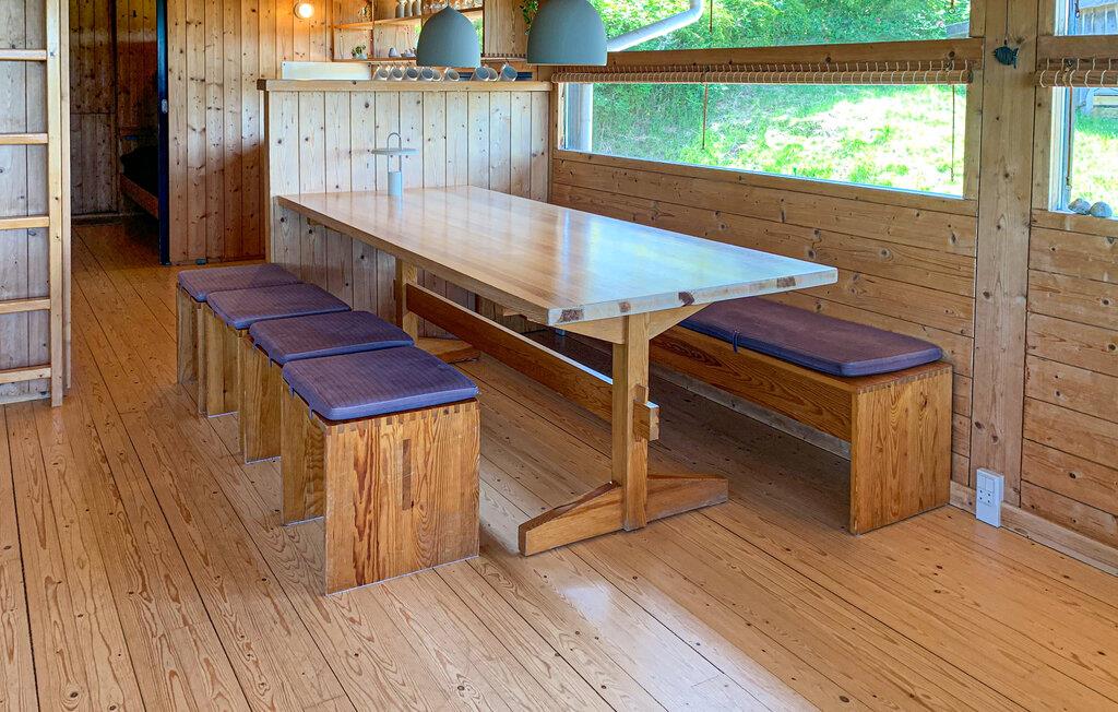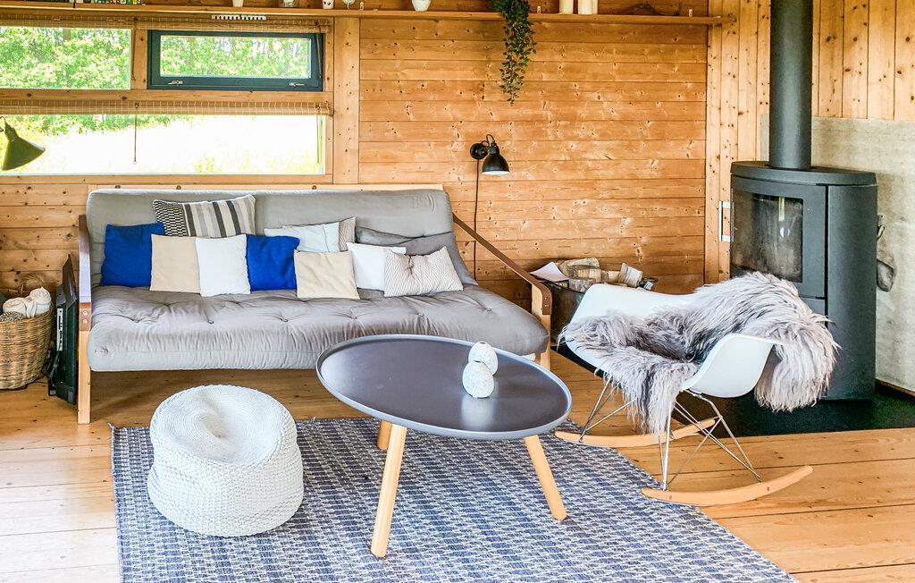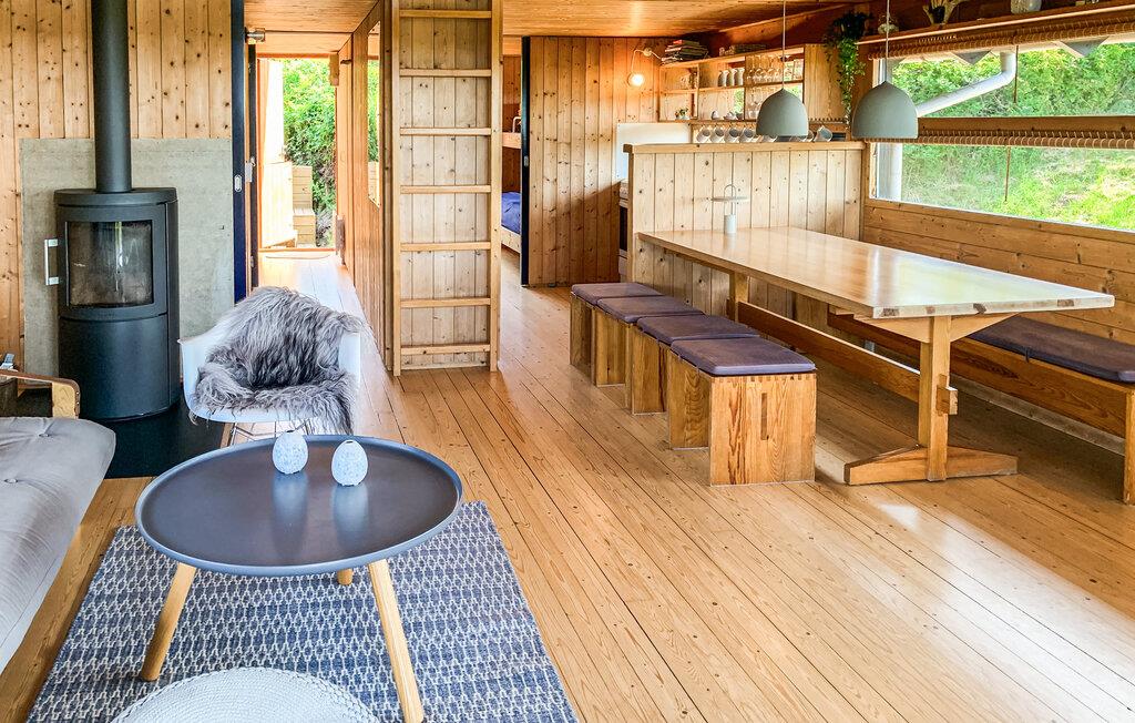 Dette hyggelige feriehus lægger op til en ferie tæt på naturen. Glæd jer til fred, plads og et gennemtænkt rummeligt koncept med en storslået udsigt. Træd ind i den åbne stue og spisestue med varmt træinteriør, store vinduer og en hyggelig brændeovn. Læn jer tilbage i den komfortable sofa eller nyd hyggelige måltider ved det store spisebord med plads til alle. Det integrerede køkken er funktionelt udstyret og gør det til en fornøjelse at lave mad sammen.
