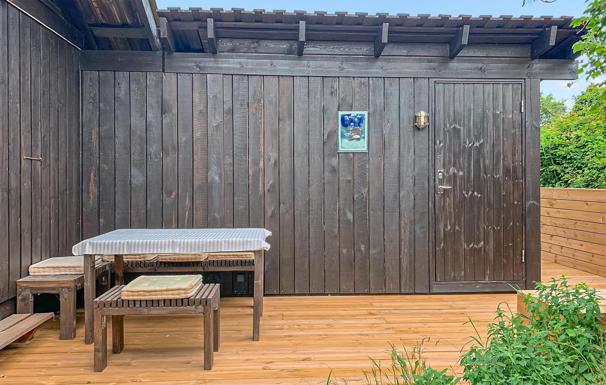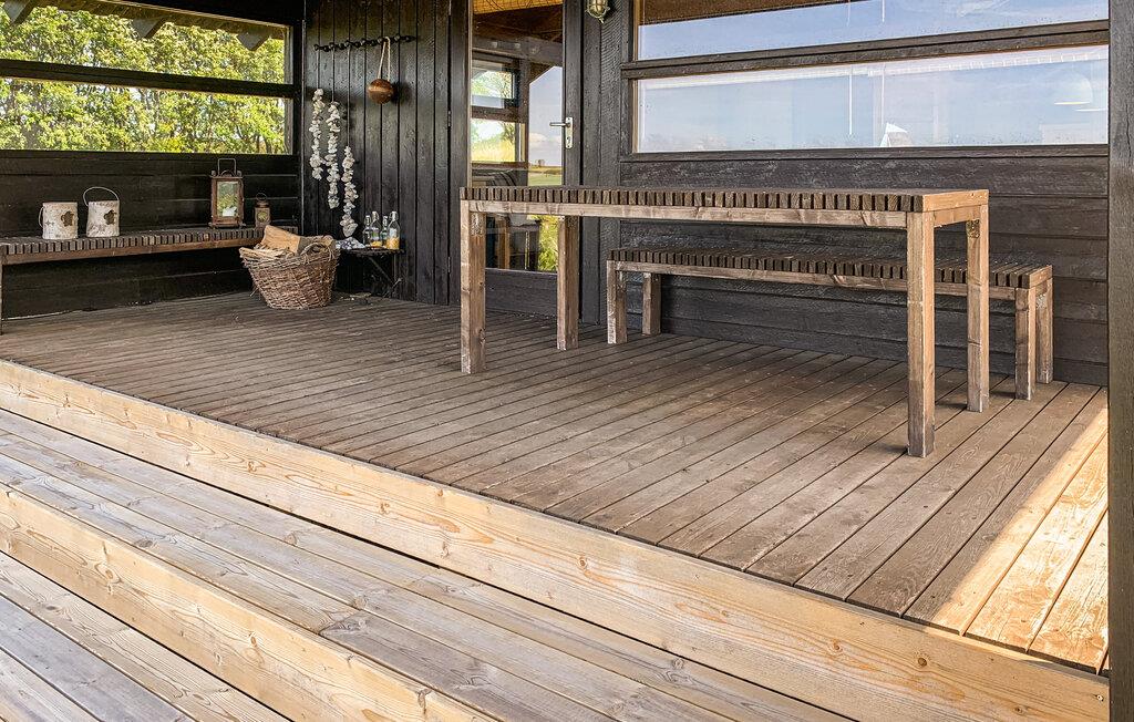 Brug den store terrasse til solbadning eller afslapning med en bog i en liggestol. Den delvist overdækkede træveranda tilbyder ly på blæsende dage og er også oplagt til morgenmad eller aftensmad udendørs. Den naturskønne have med enkle udendørs siddepladser smelter harmonisk sammen med omgivelserne.