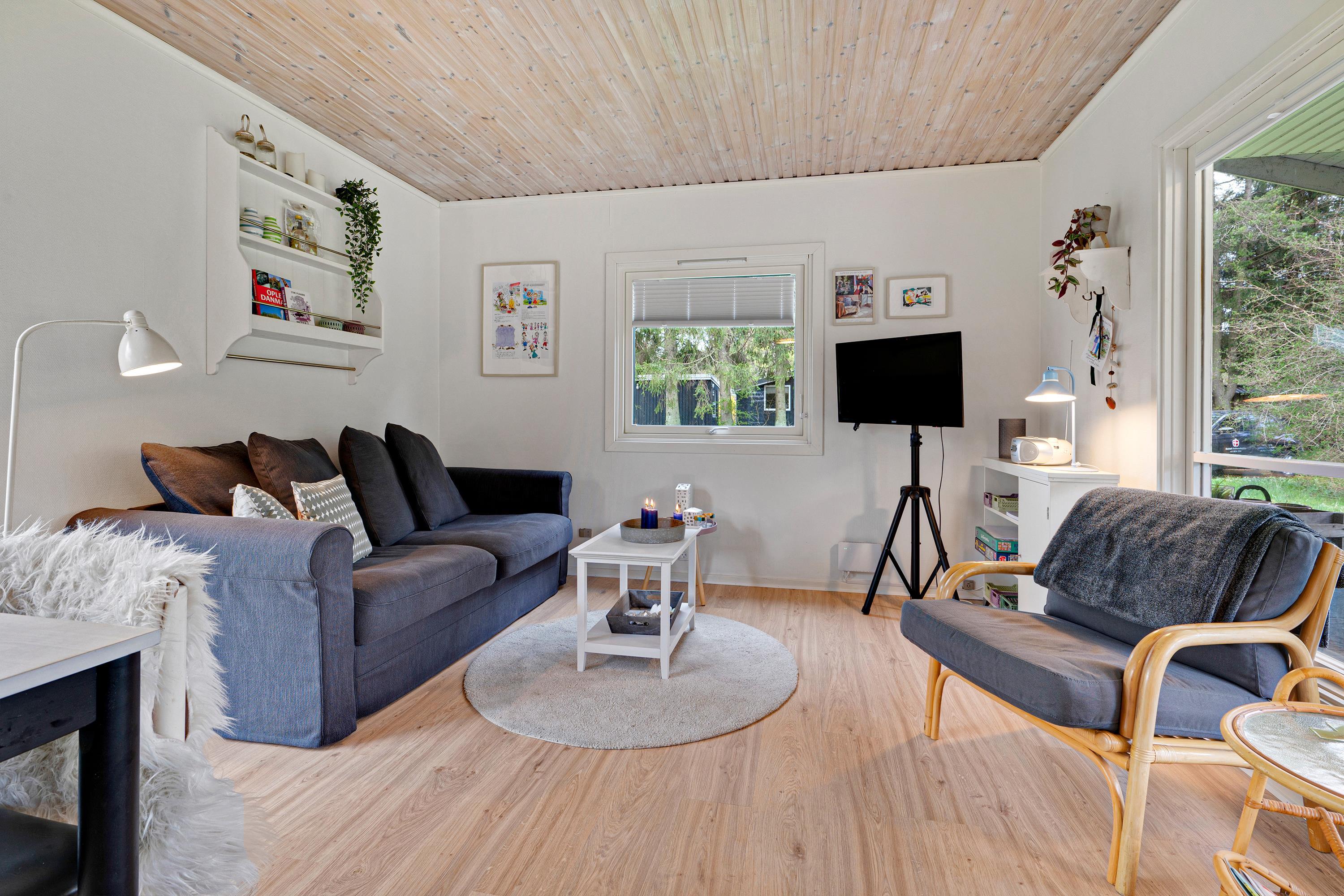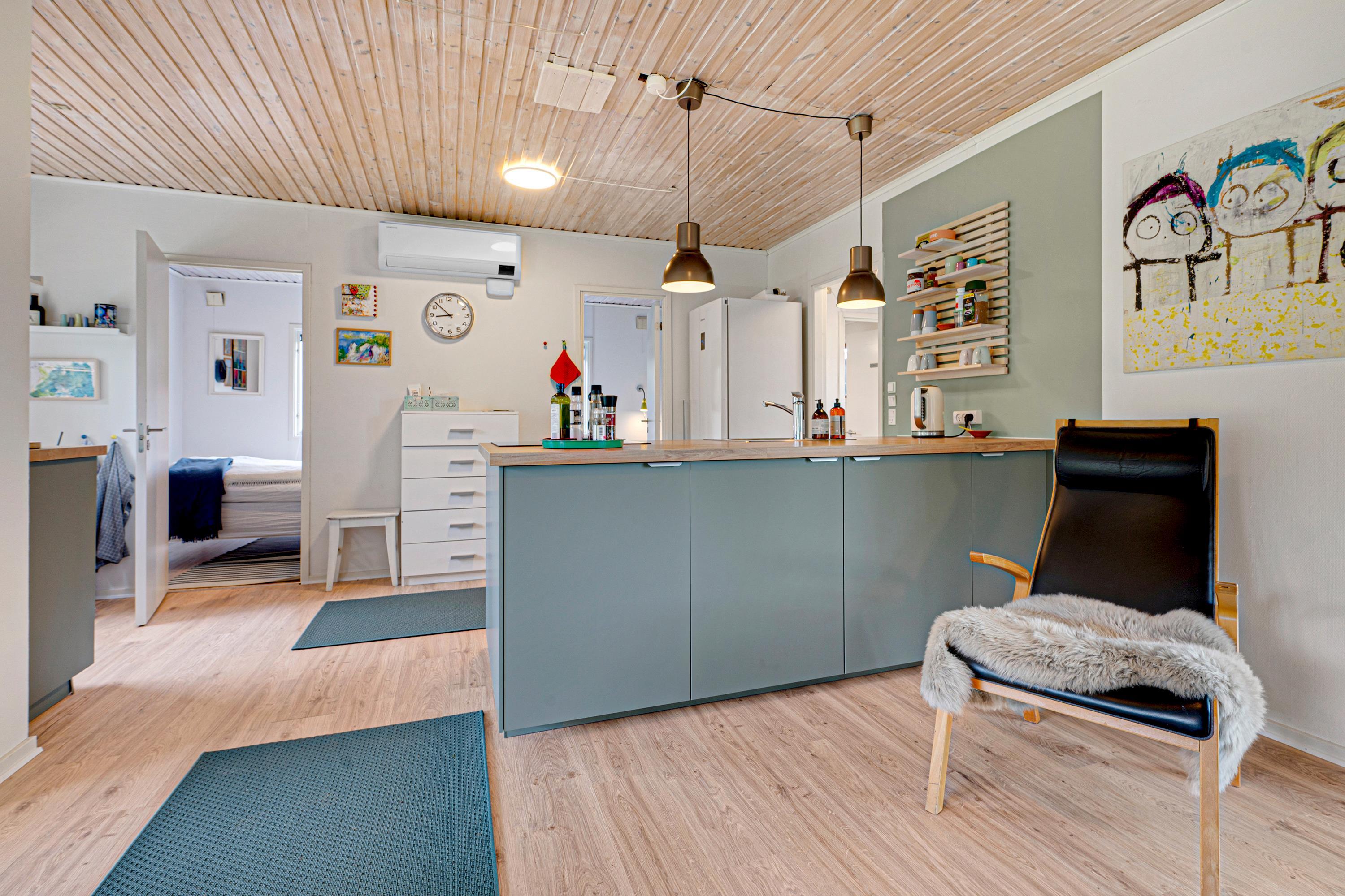 Den lyse stue i åben forbindelse med køkken har panoramavinduer og udgang til terrasse. Her er spiseplads til 6 personer, sofamøblement, lænestole og fladskærms-TV med chromecaster – bemærk, at der ingen kanaler er tilkoblet, alt indhold skal streames fra PC eller andet medie. Desuden er her CD-afspiller og radio. Nyt, lille men velindrettet køkken med keramiske kogeplader, ovn, køle-/fryseskab samt opvaskemaskine. Godt, nyt badeværelse med bruseniche og skabsarrangement. Husets 6 sovepladser fordeler sig på 2 lyse soveværelser med dobbeltseng samt en dobbelt sovesofa i stuen. Til de mindste er der barnestol. Huset har varmepumpe med aircondition, og der er internetadgang.