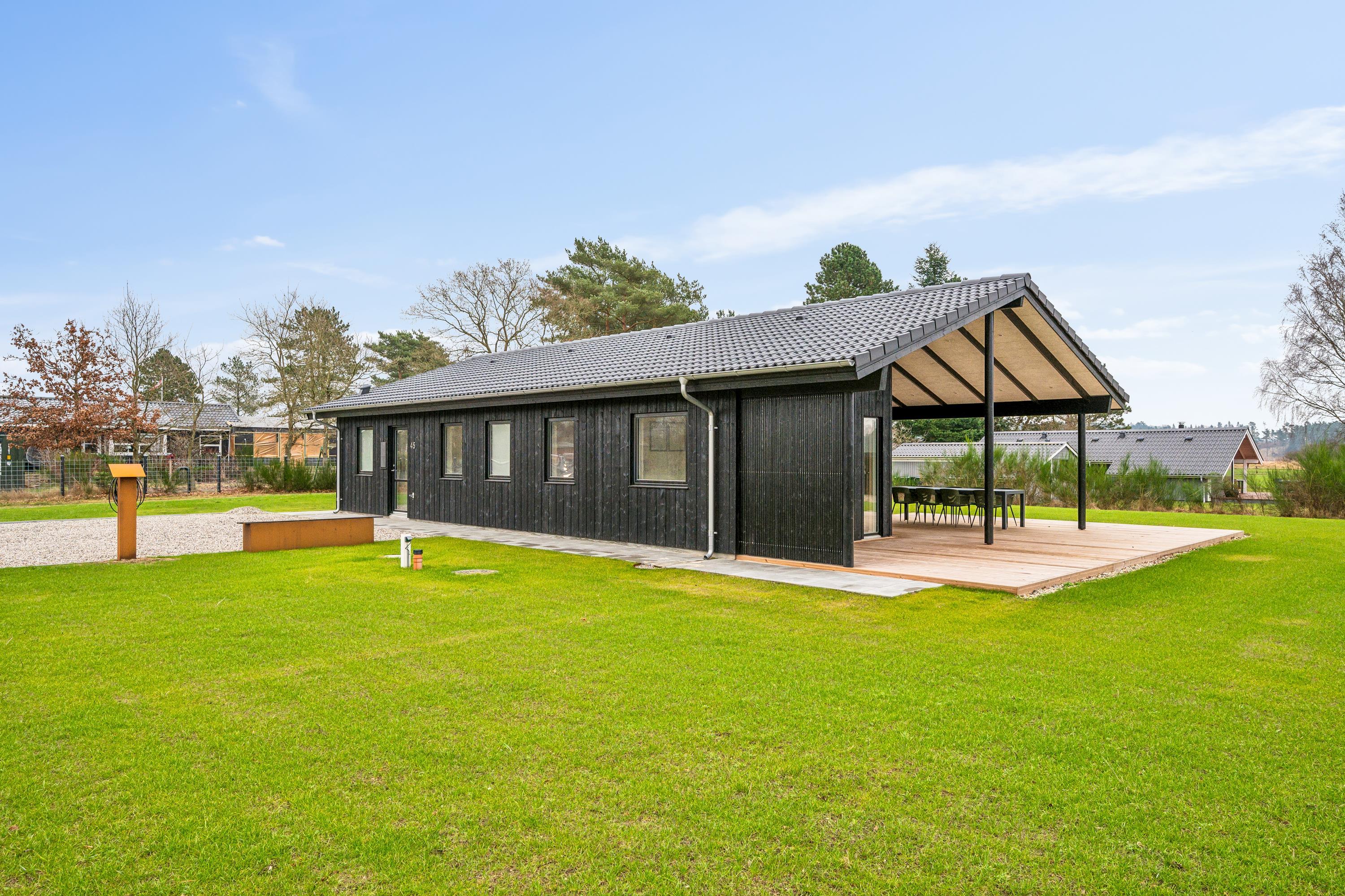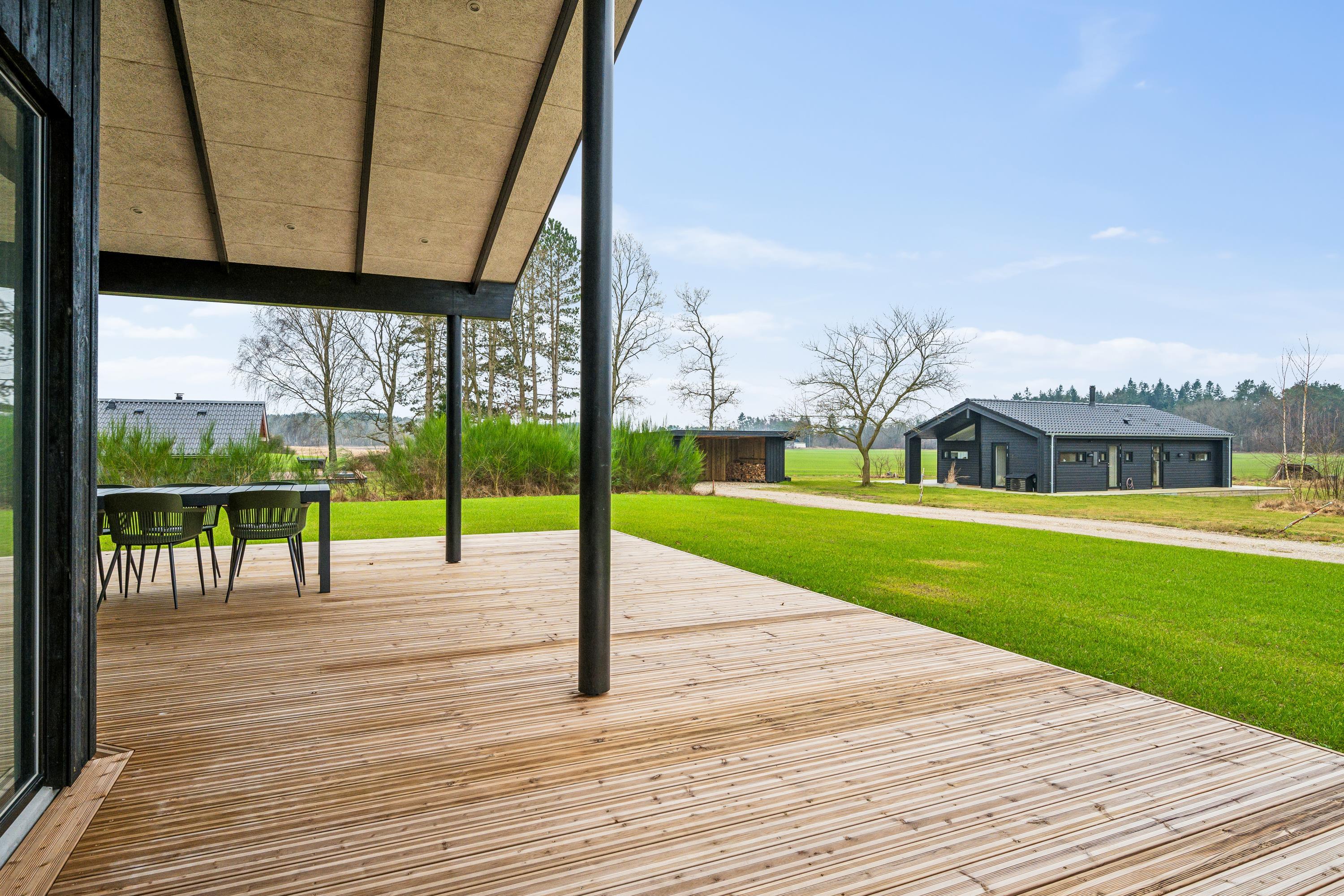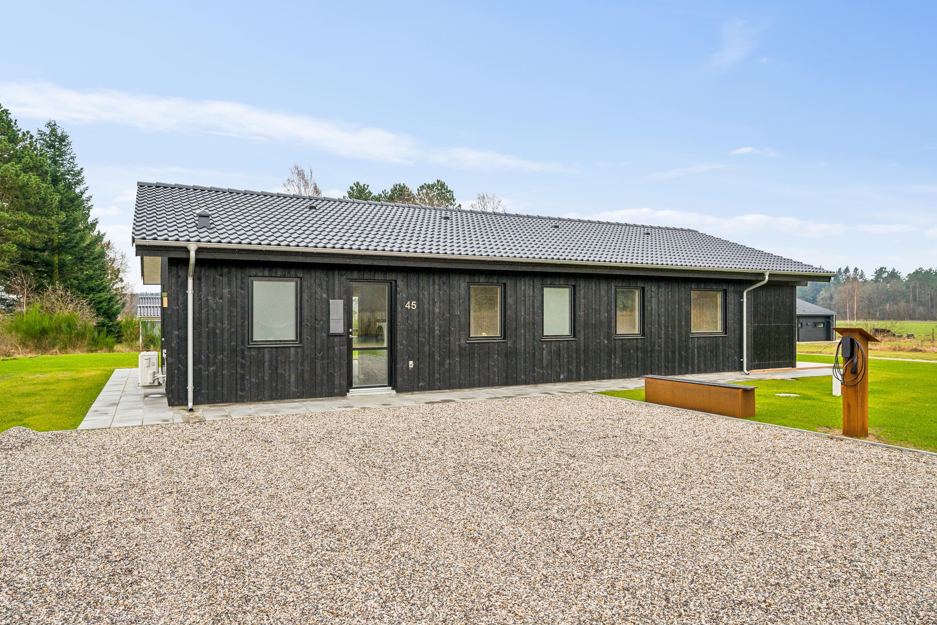 Flot nyopført feriehus nær Ebeltoft med 4 værelser, terrasse, varmepumpe og el-ladestander i fredelige omgivelser.
