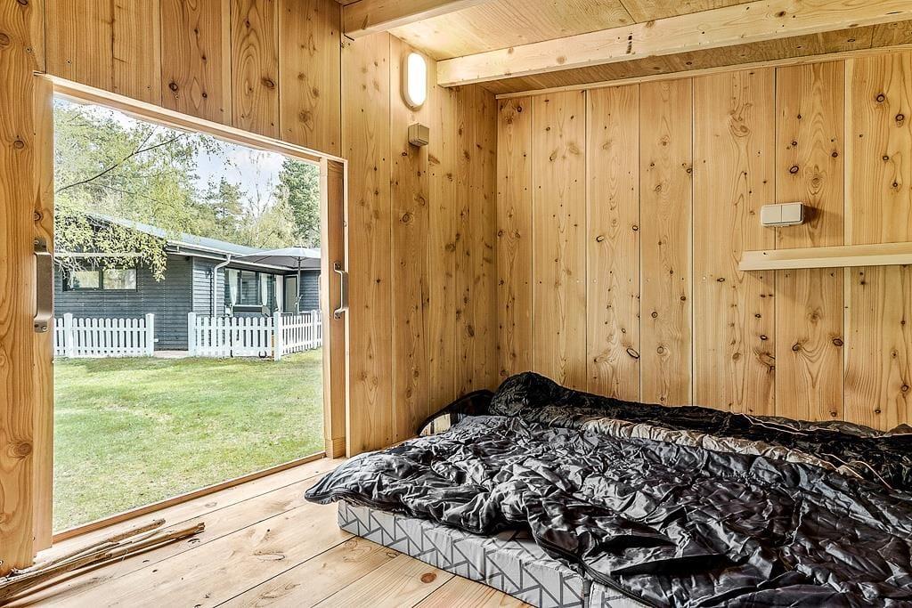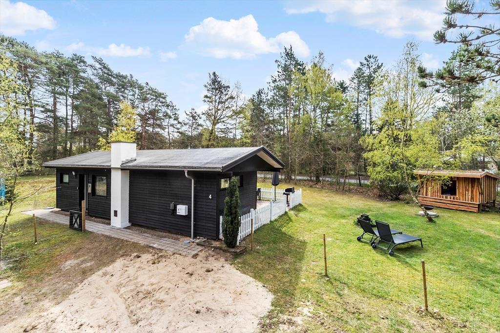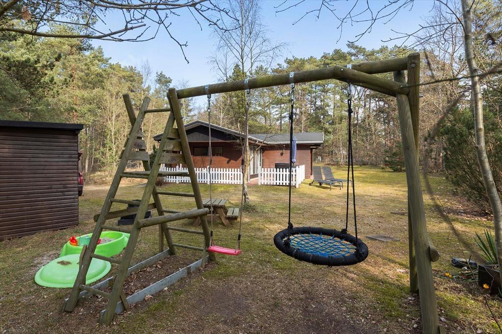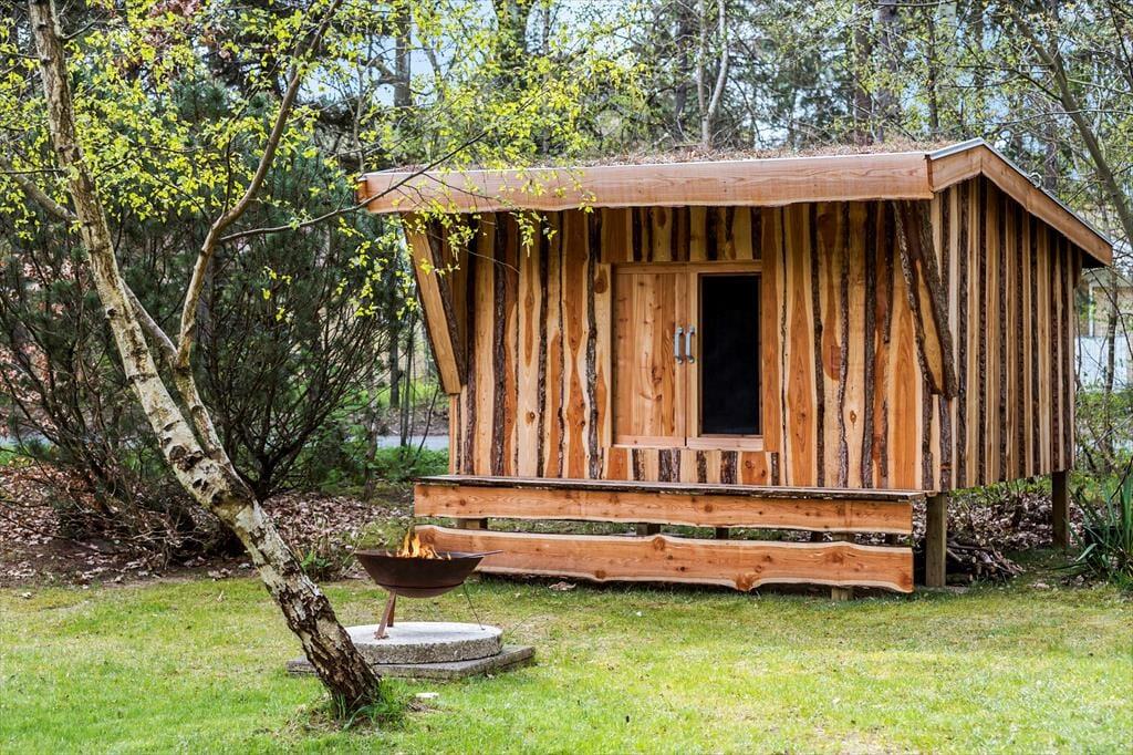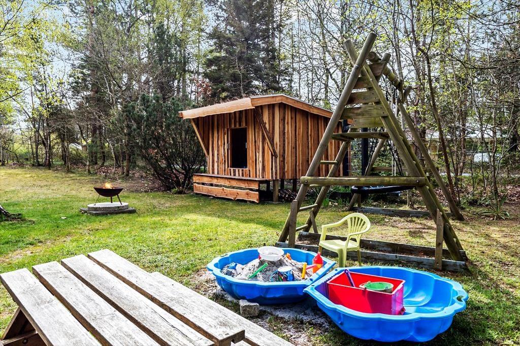 Den indhegnede skovhave er et sandt paradis for børn og hunde. Her kan børnene lege frit på plænen, i sandkassen eller gyngerne, mens de voksne tænder op i grillen eller nyder en kop kaffe i solen. Haven har også et shelter og bålsted, hvor hele familien kan samles til hygge og måske endda en nat under stjernerne.