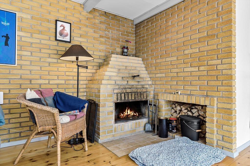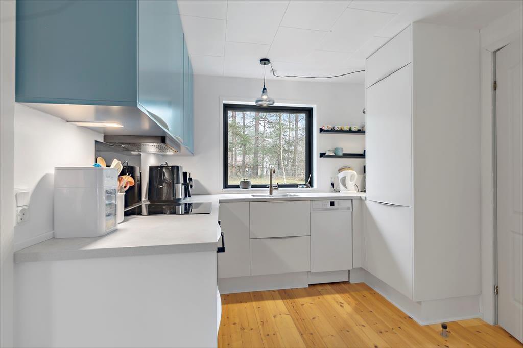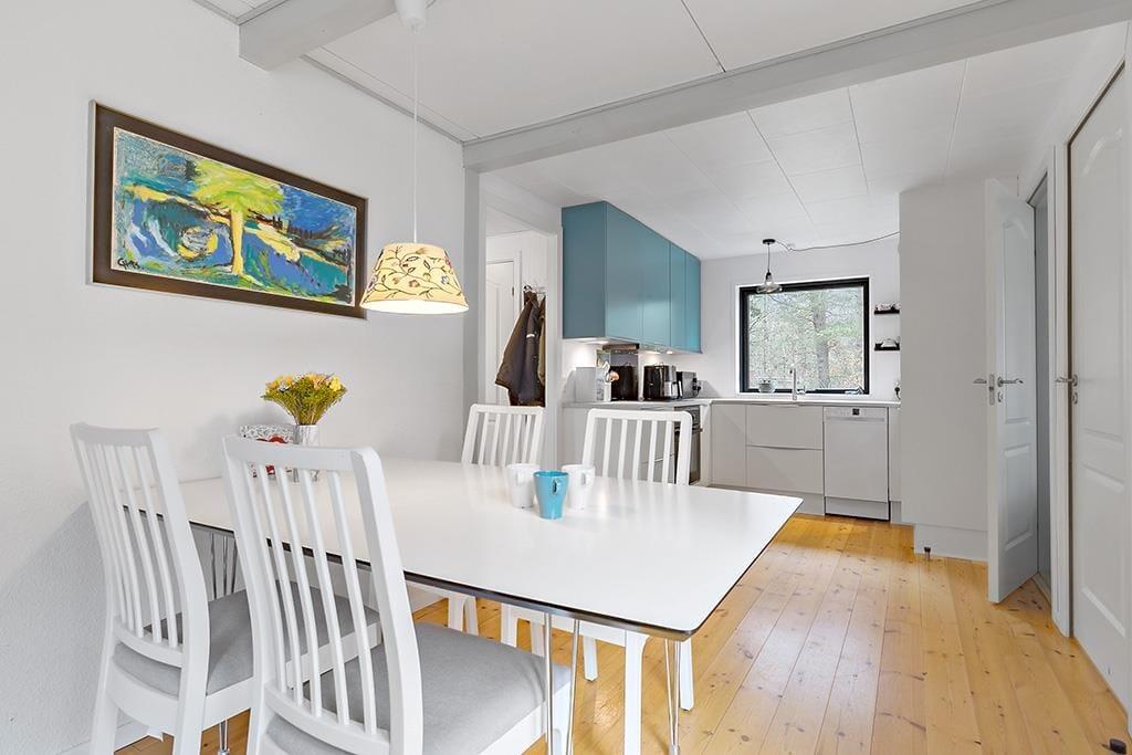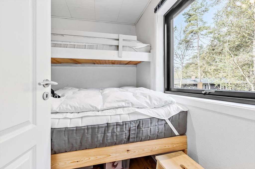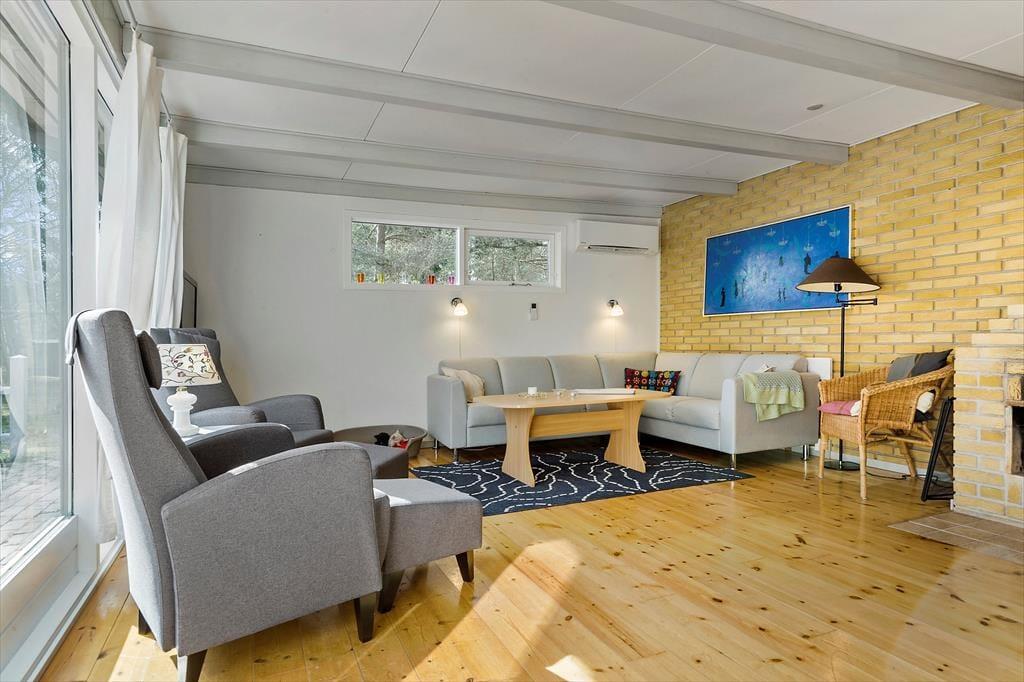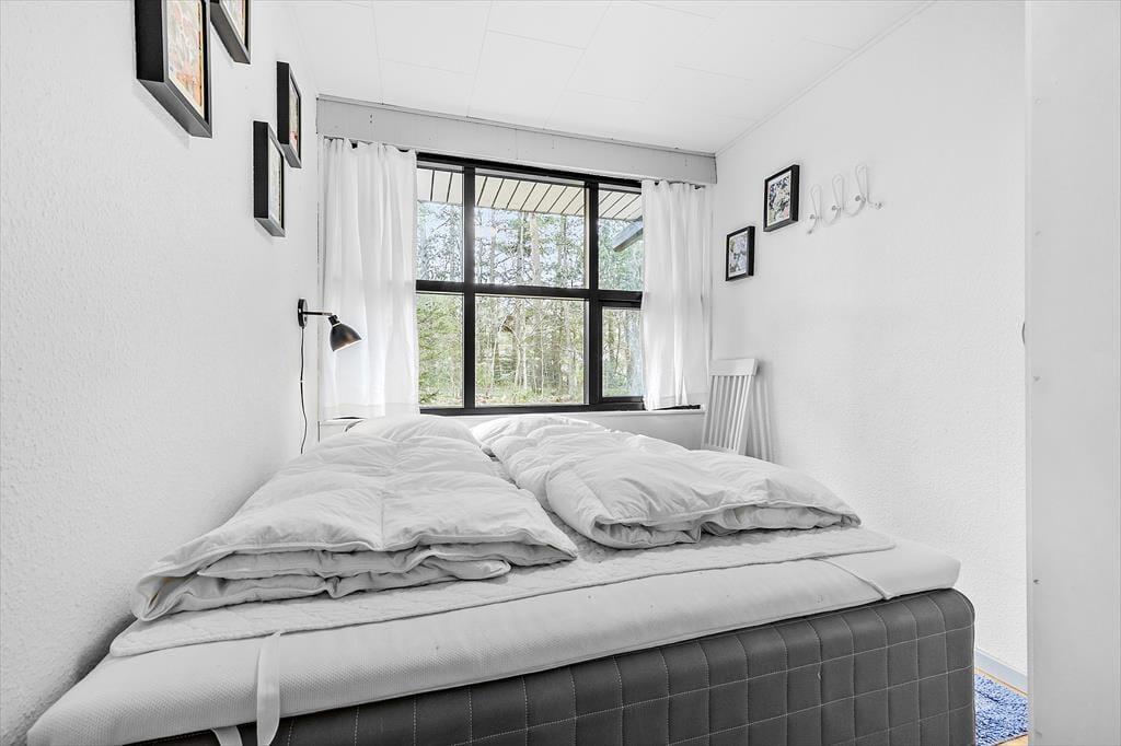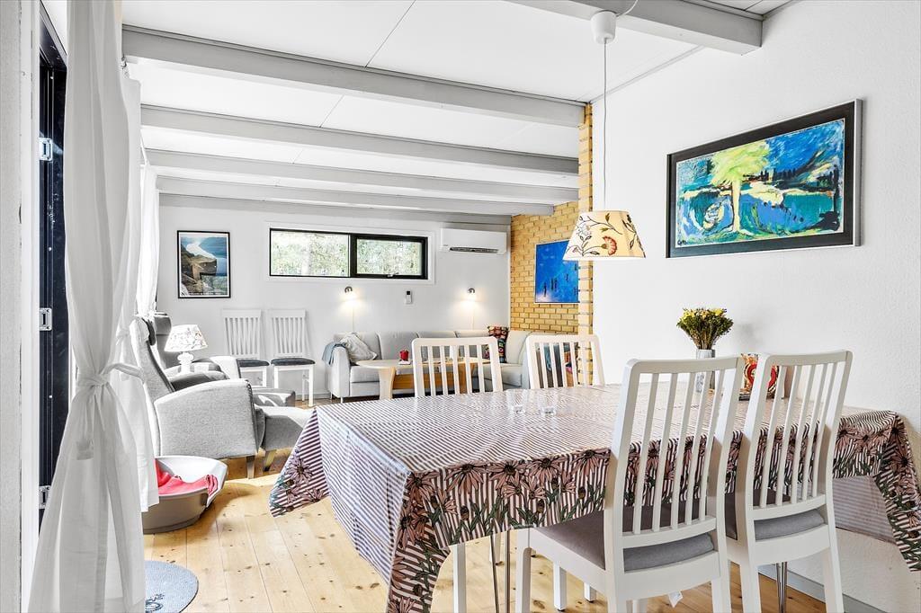Dette feriehus byder på en lys og venlig atmosfære, hvor hygge og funktionalitet går hånd i hånd. Stuen er indrettet med komfortable møbler og en åben pejs, ideel til afslappede aftener. Herfra kan du træde direkte ud på den solrige fliseterrasse. Huset har et veludstyret køkken med både opvaskemaskine og mikroovn, og spisepladsen er centralt placeret mellem køkken og stue, så du kan holde øje med både børn og madlavning. Der er tre fine soveværelser – to med dobbeltsenge og et med køjeseng – samt et badeværelse med muret bruseniche og vaskemaskine.
