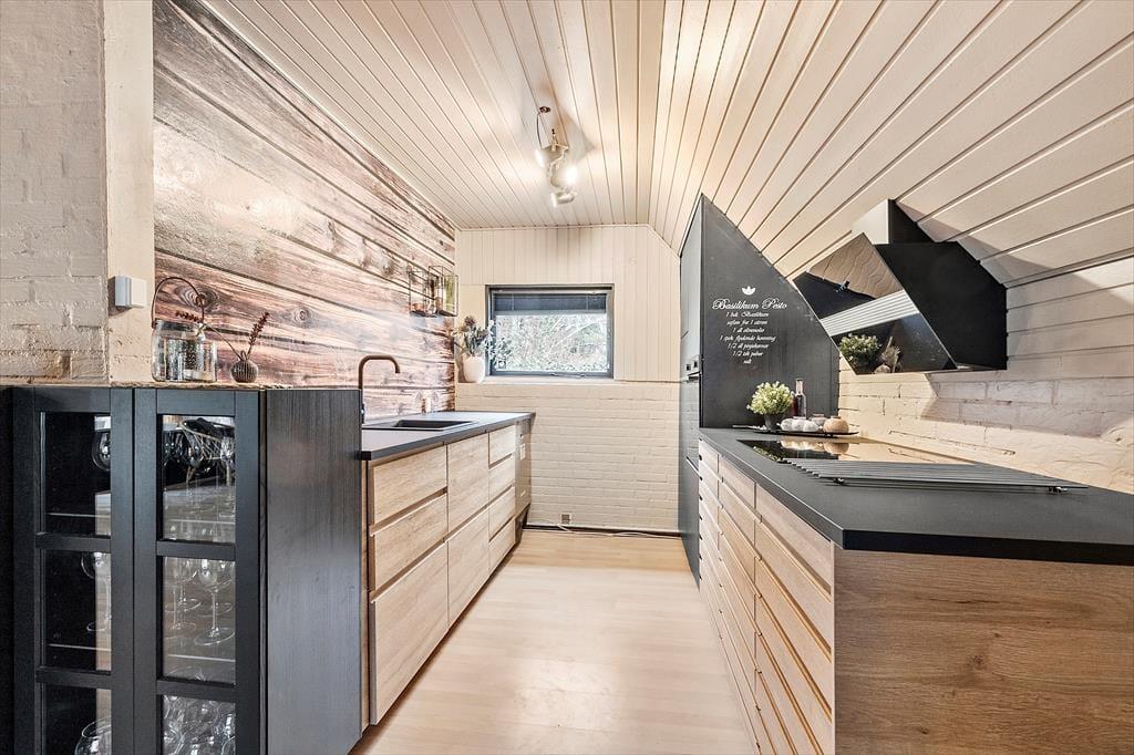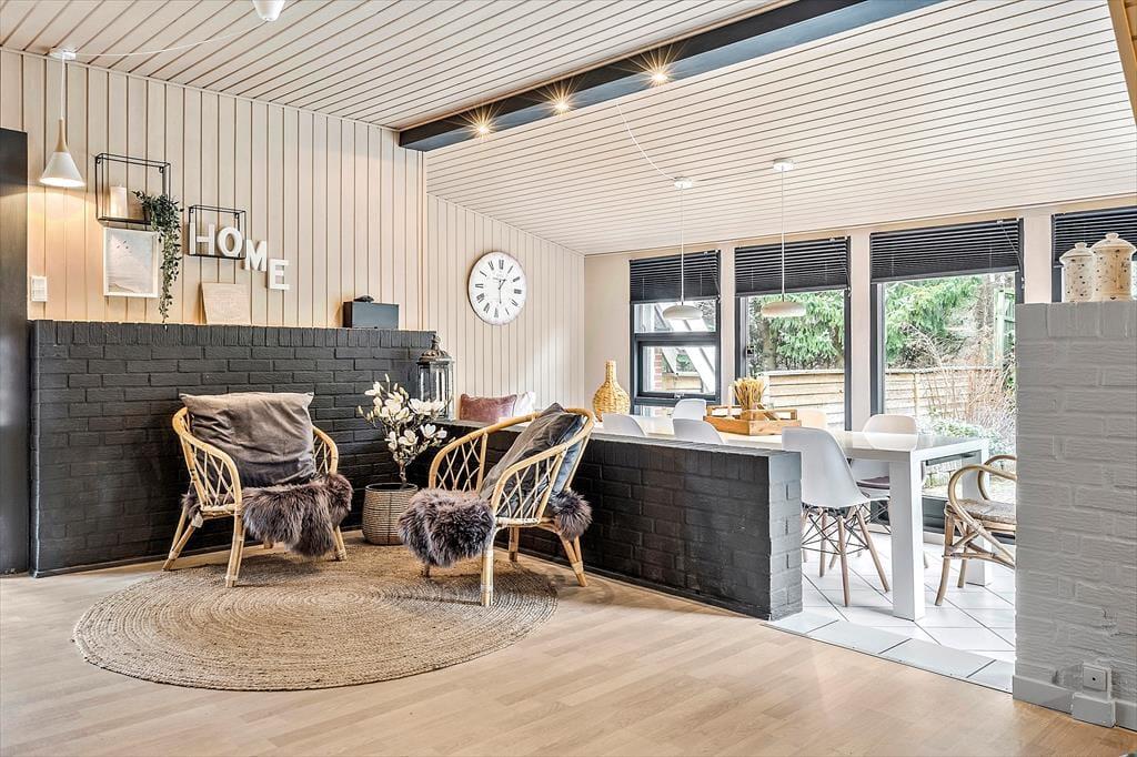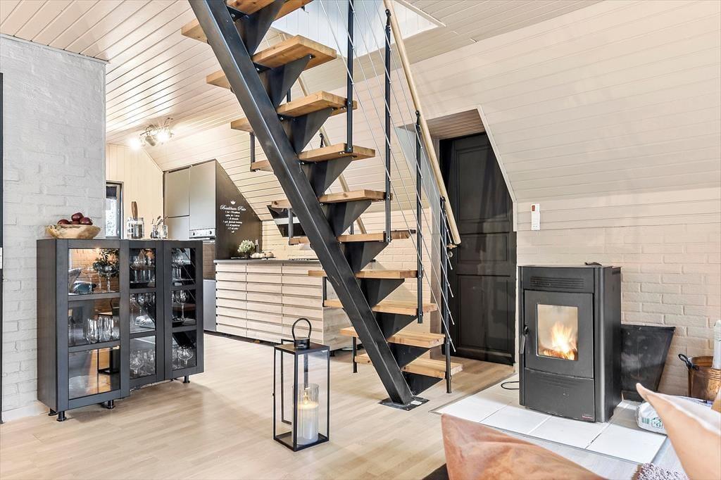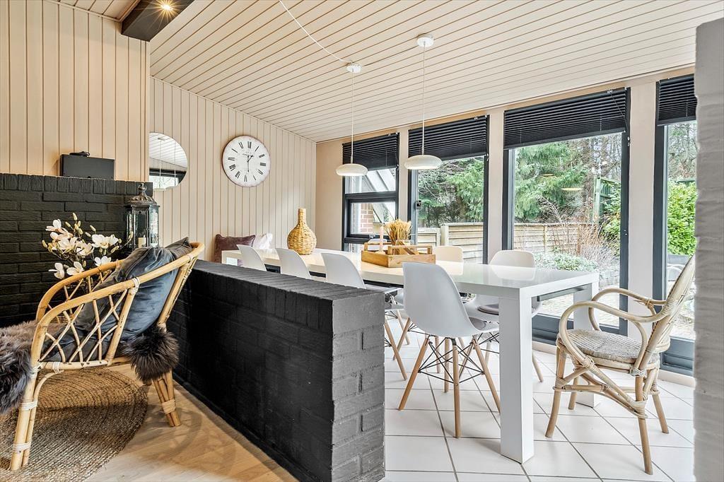 Velkommen til dette skønne og stemningsfulde feriehus, hvor indretningen er en oplevelse i sig selv. Her er der leget med smukke tapeter, rolige farver og et fantastisk lys, der straks får dig til at føle dig hjemme. Huset er gennemført hyggeligt og smagfuldt indrettet, og der er plads til både afslapning og samvær. Indgangen byder på en rummelig entre, der fører til husets store og indbydende stue. Her kan du synke ned i de komfortable ”slap af”-møbler og nyde brændeovnens knitren, se TV, læse en god bog eller hygge med familie og venner. Stuen ligger i åben forbindelse med det funktionelle og stemningsfulde køkken, hvor du har alt, hvad du behøver til at fremtrylle lækker feriemad. Spisestuen har et langt bord, perfekt til fælles måltider, og herfra er der udsigt til haven og adgang til en skøn terrasse. Huset har to badeværelser, der matcher resten af hjemmets hyggelige stil, og fire dejlige soveværelser. På 1. sal finder du to værelser med dobbeltsenge, der kan adskilles. To yderligere soveværelser ligger i stueetagen – det ene med dobbeltseng og det andet med dobbelt sovesofa.