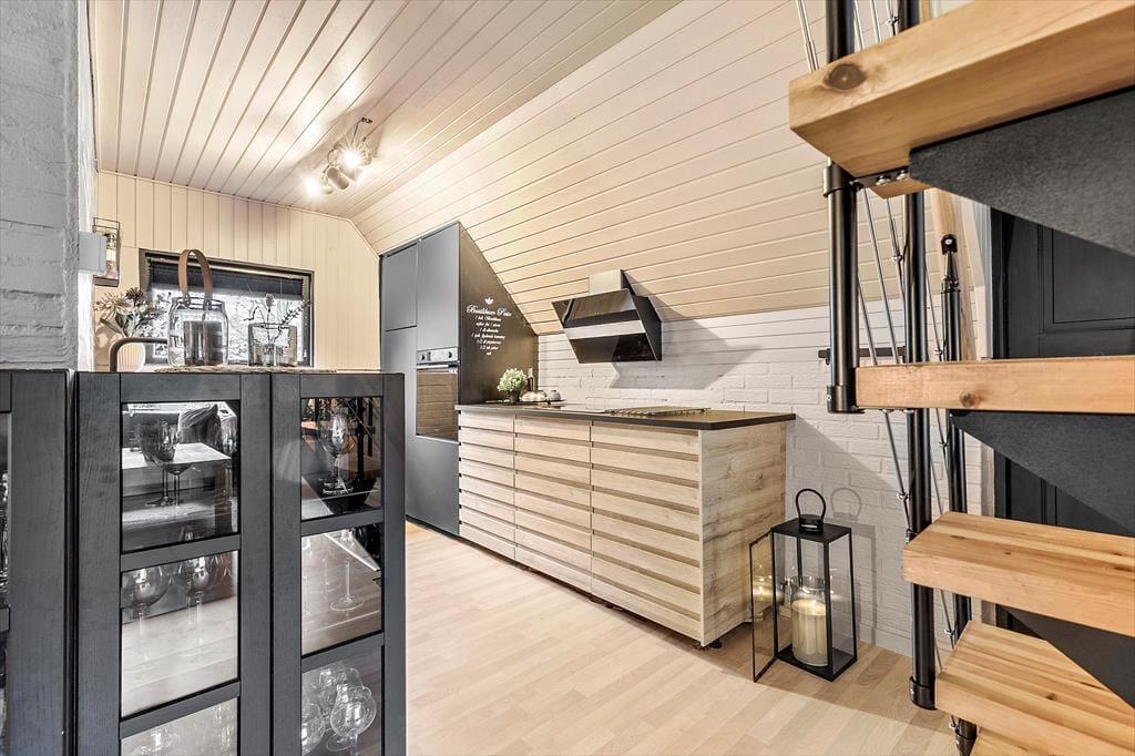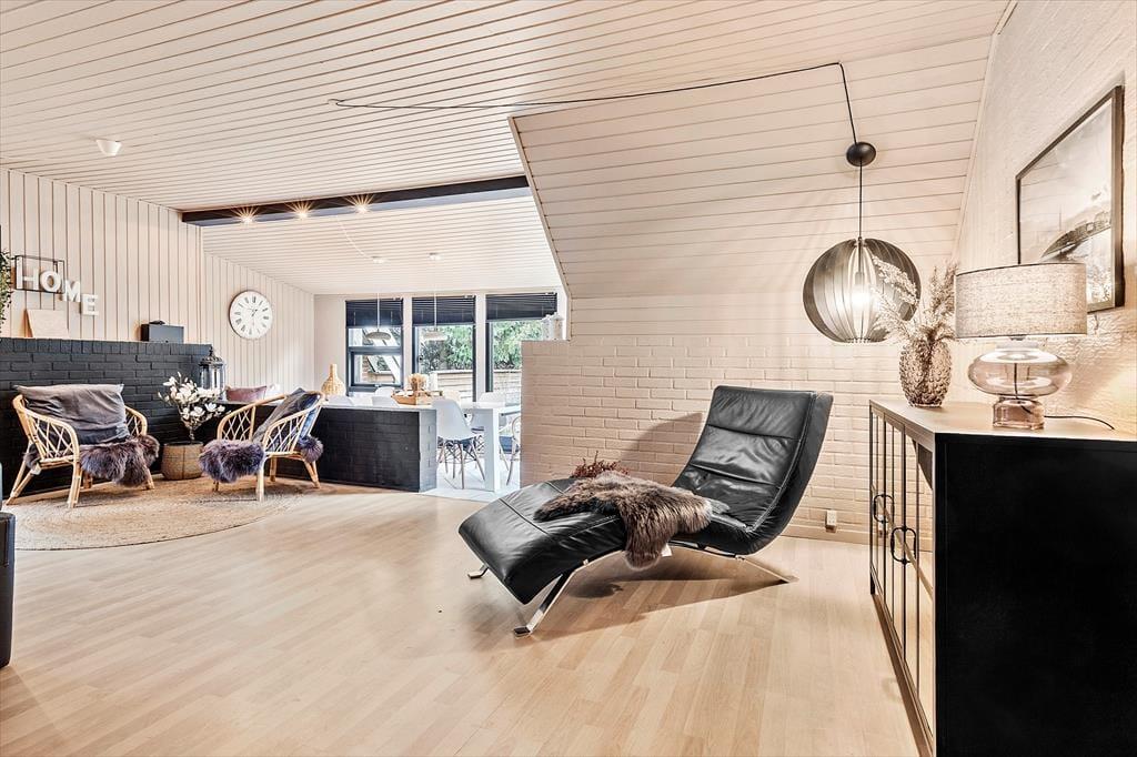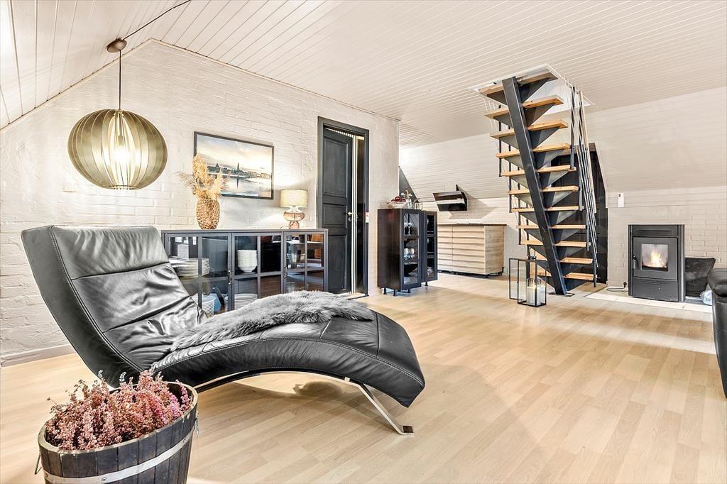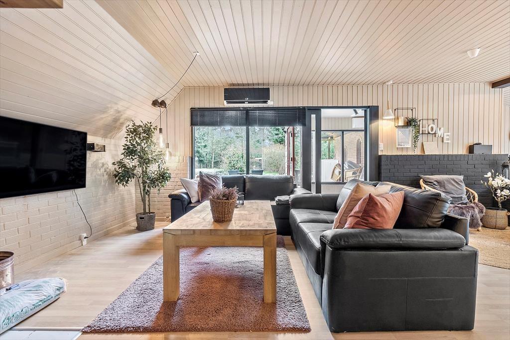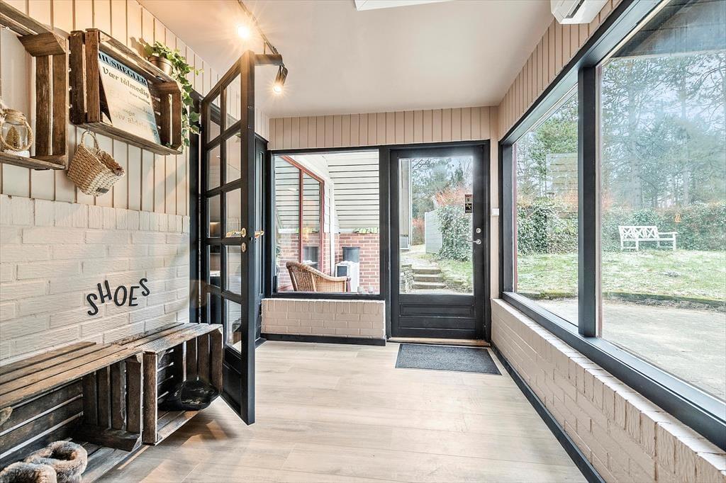 Velkommen til dette skønne og stemningsfulde feriehus, hvor indretningen er en oplevelse i sig selv. Her er der leget med smukke tapeter, rolige farver og et fantastisk lys, der straks får dig til at føle dig hjemme. Huset er gennemført hyggeligt og smagfuldt indrettet, og der er plads til både afslapning og samvær. Indgangen byder på en rummelig entre, der fører til husets store og indbydende stue. Her kan du synke ned i de komfortable ”slap af”-møbler og nyde brændeovnens knitren, se TV, læse en god bog eller hygge med familie og venner. Stuen ligger i åben forbindelse med det funktionelle og stemningsfulde køkken, hvor du har alt, hvad du behøver til at fremtrylle lækker feriemad. Spisestuen har et langt bord, perfekt til fælles måltider, og herfra er der udsigt til haven og adgang til en skøn terrasse. Huset har to badeværelser, der matcher resten af hjemmets hyggelige stil, og fire dejlige soveværelser. På 1. sal finder du to værelser med dobbeltsenge, der kan adskilles. To yderligere soveværelser ligger i stueetagen – det ene med dobbeltseng og det andet med dobbelt sovesofa.