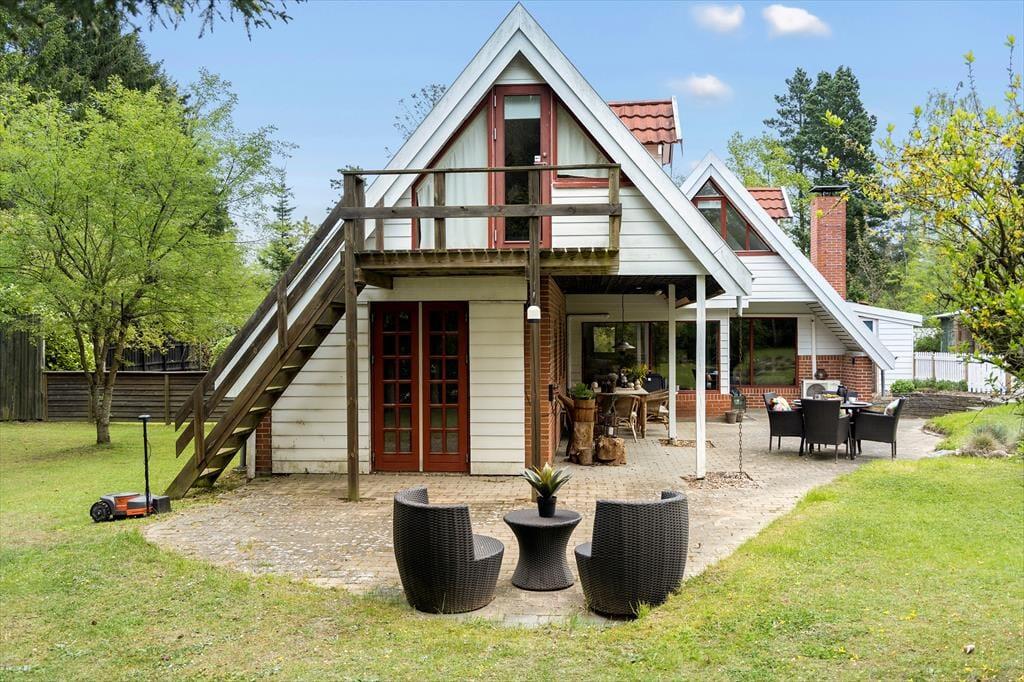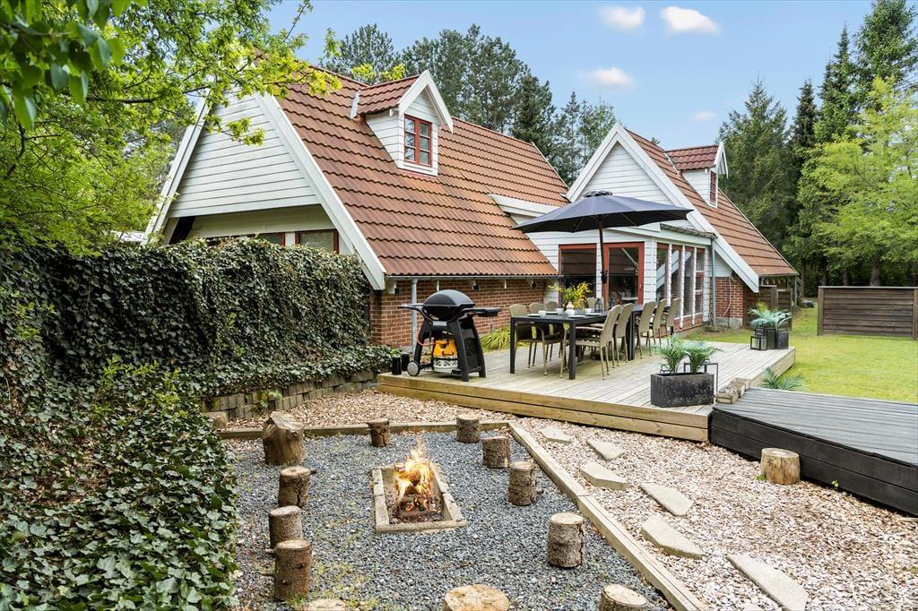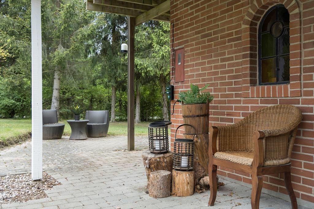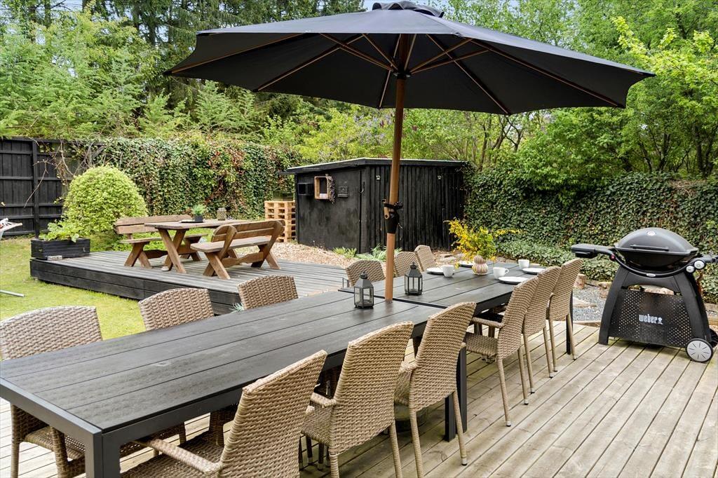 Udenfor venter en dejlig have, der indbyder til både leg og afslapning. Haven er plan og perfekt til aktiviteter, og der er flere terrasser, hvor du kan nyde solen fra morgen til aften. Trænger du til skygge, kan du slå dig ned på husets veranda og nyde den svalende brise. Grunden er delvist indhegnet, så familiens hund kan snuse rundt i trygge omgivelser.