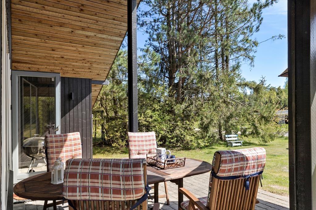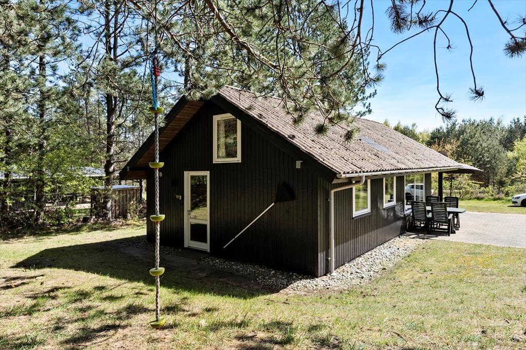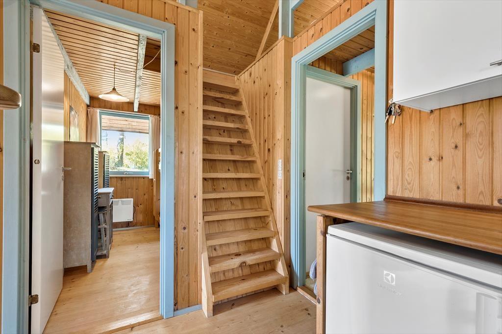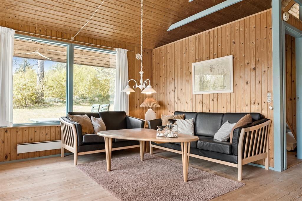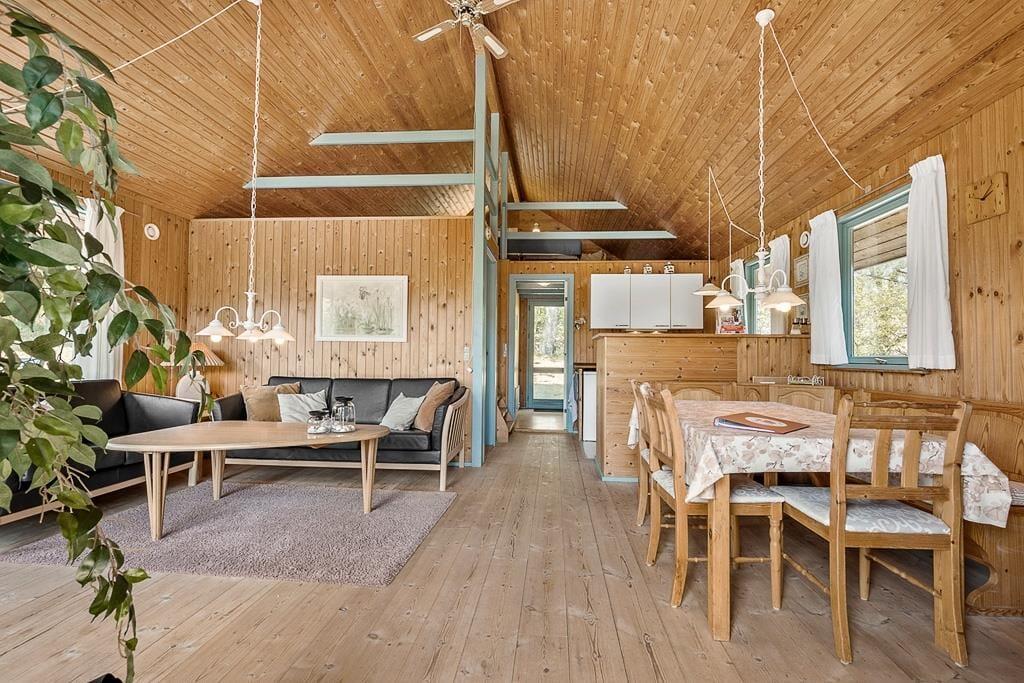 Træd ind i et hyggeligt og funktionelt feriehus, der straks får dig til at føle dig hjemme. Stuen er indrettet med komfortable møbler, en brændeovn, der spreder varme og hygge på de kølige aftener, samt direkte adgang til terrassen. Det dejlige køkken er yderst praktisk og ligger i åben forbindelse med spisepladsen, som er centralt placeret mellem køkken og stue. Her kan I samle familien til spil og hyggelige samtaler, mens maden tilberedes. Huset rummer tre fine soveværelser - et med dobbeltseng, et med køjeseng og et med dobbeltseng på hemsen – samt et funktionelt badeværelse, der opfylder alle behov.