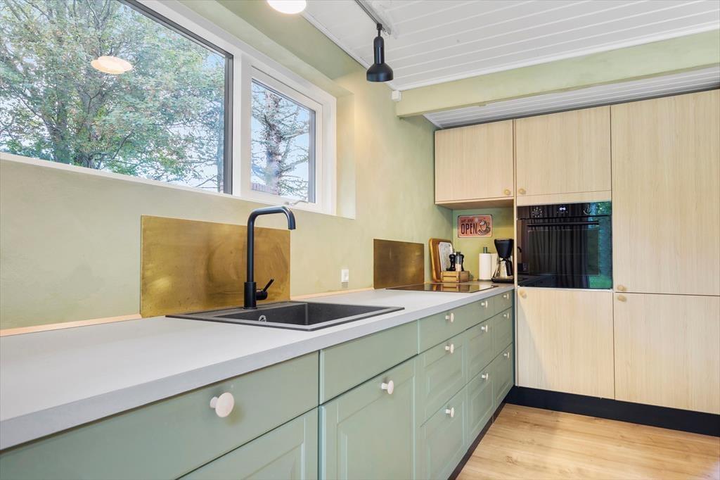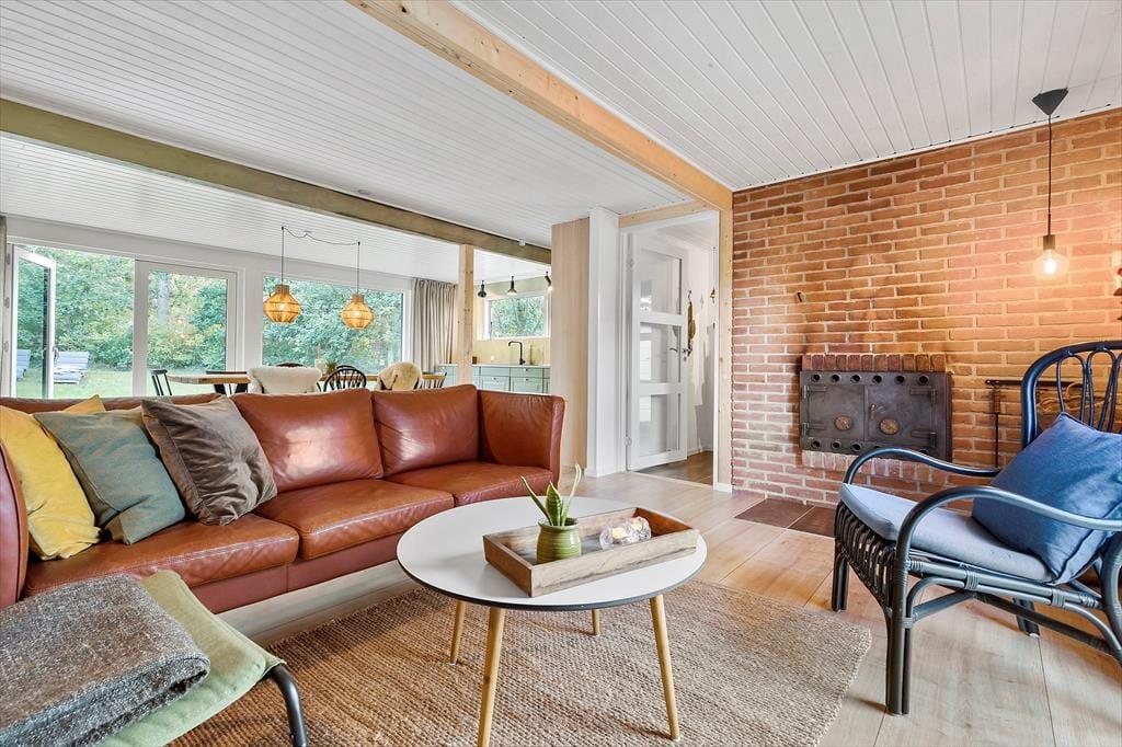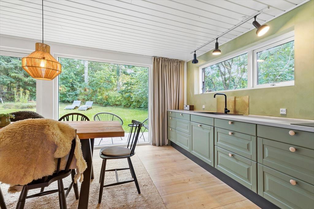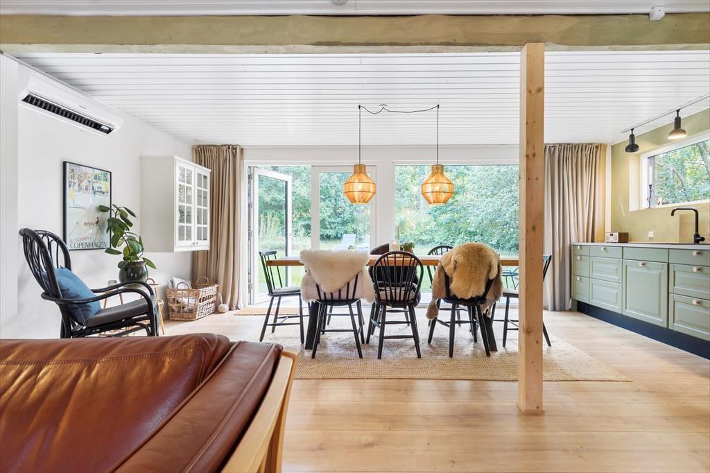 Her er der virkelig gjort noget ud af indretningen med rolige farver, stemningsfuld belysning og en stil, der straks får dig til at føle dig hjemme. Fra stuen har du et smukt kig til naturen udenfor, mens du hygger dig med et spil kort, deler gode historier eller nyder et lækkert måltid ved det store, hjemmelavede plankebord. Det grønne, stilfulde køkken gør det til en fornøjelse at lave feriemad, og i den bløde sofa foran pejsen kan du nyde en stille stund med en god bog. Huset rummer tre dejlige soveværelser med dobbeltsenge samt et hyggeligt anneks – perfekt til gæster eller teenagere, der vil have lidt privatliv. Badeværelset er rummeligt med stor bruseniche, og der er praktisk bryggers med vaskemaskine og tørretumbler. Brænde til pejsen er naturligvis gratis.