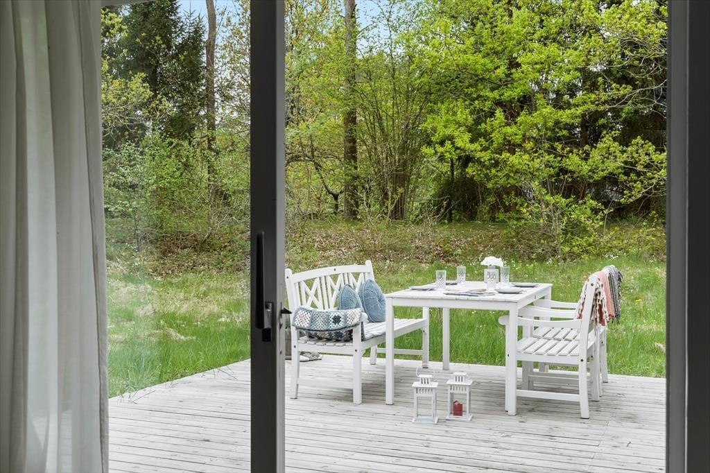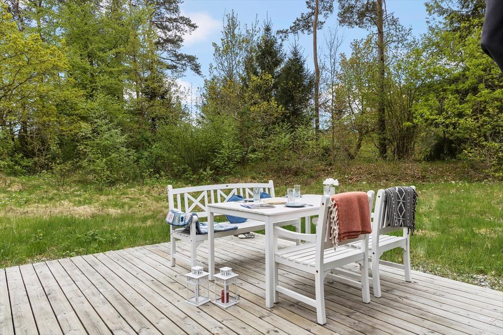 En dejlig have, der er "vild med vilje" så her kan du sidde og nyde flora og fauna. Her er en god stor terrasser, hvor solen kan nydes. Her er ro og fred i lange baner. Gode havemøbler og grill. Foran huset er der også et åbent plateau, så der er flere muligheder for at finde solen og nyde den.