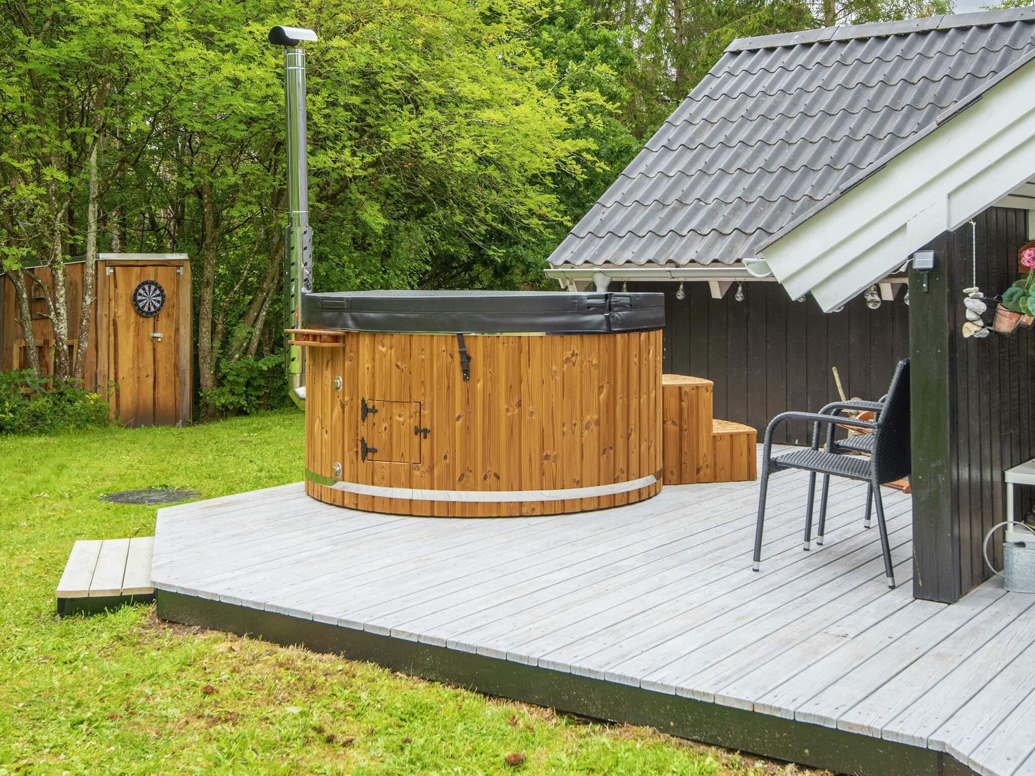 Terrassen er udstyret med hyggelige siddepladser og det træopvarmede spabad, hvilket skaber et ideelt sted til at nyde solen eller slappe af efter en dag med udforskning. Ejendommen er fuldt indhegnet og har modne træer, der giver naturlig skygge og et behageligt miljø for både børn og voksne. Den store græsplæne byder på rigelig plads til spil, solbadning eller blot at nyde den friske luft i fuldstændig privatliv.