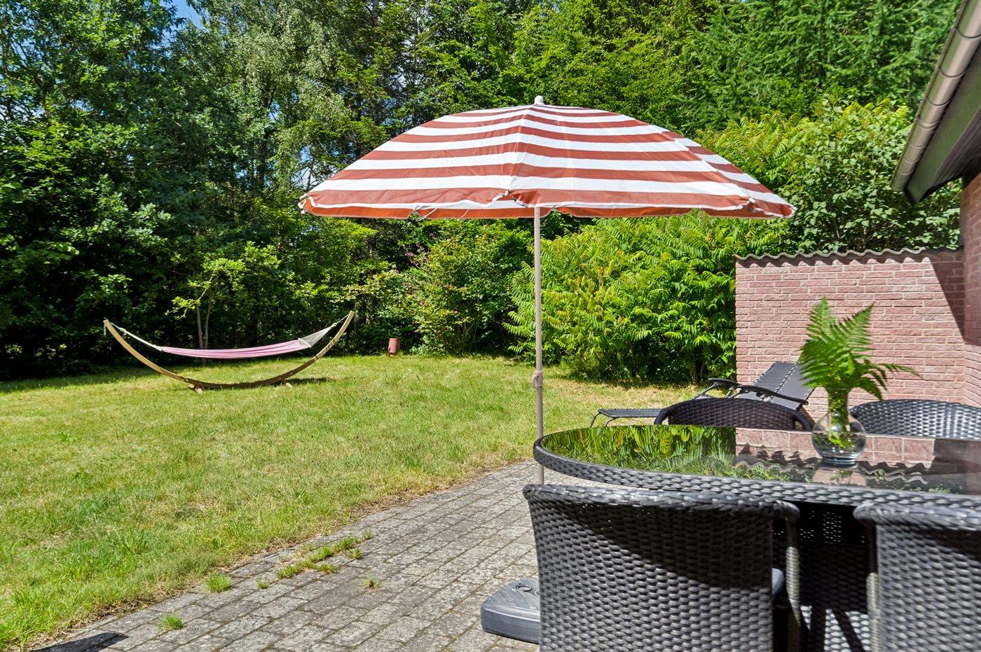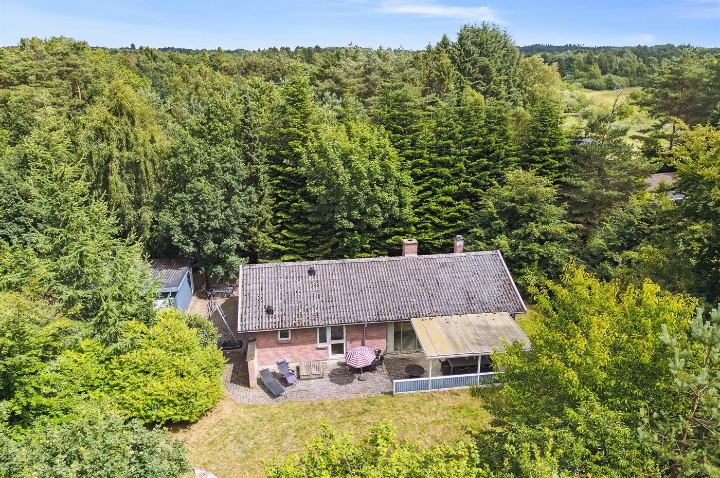 Flot og rummeligt sommerhus beliggende på en lukket grund omkranset af træer og bevoksning i et roligt og naturskønt område.