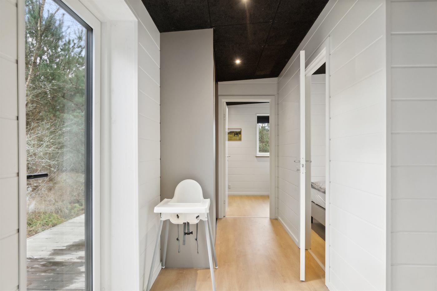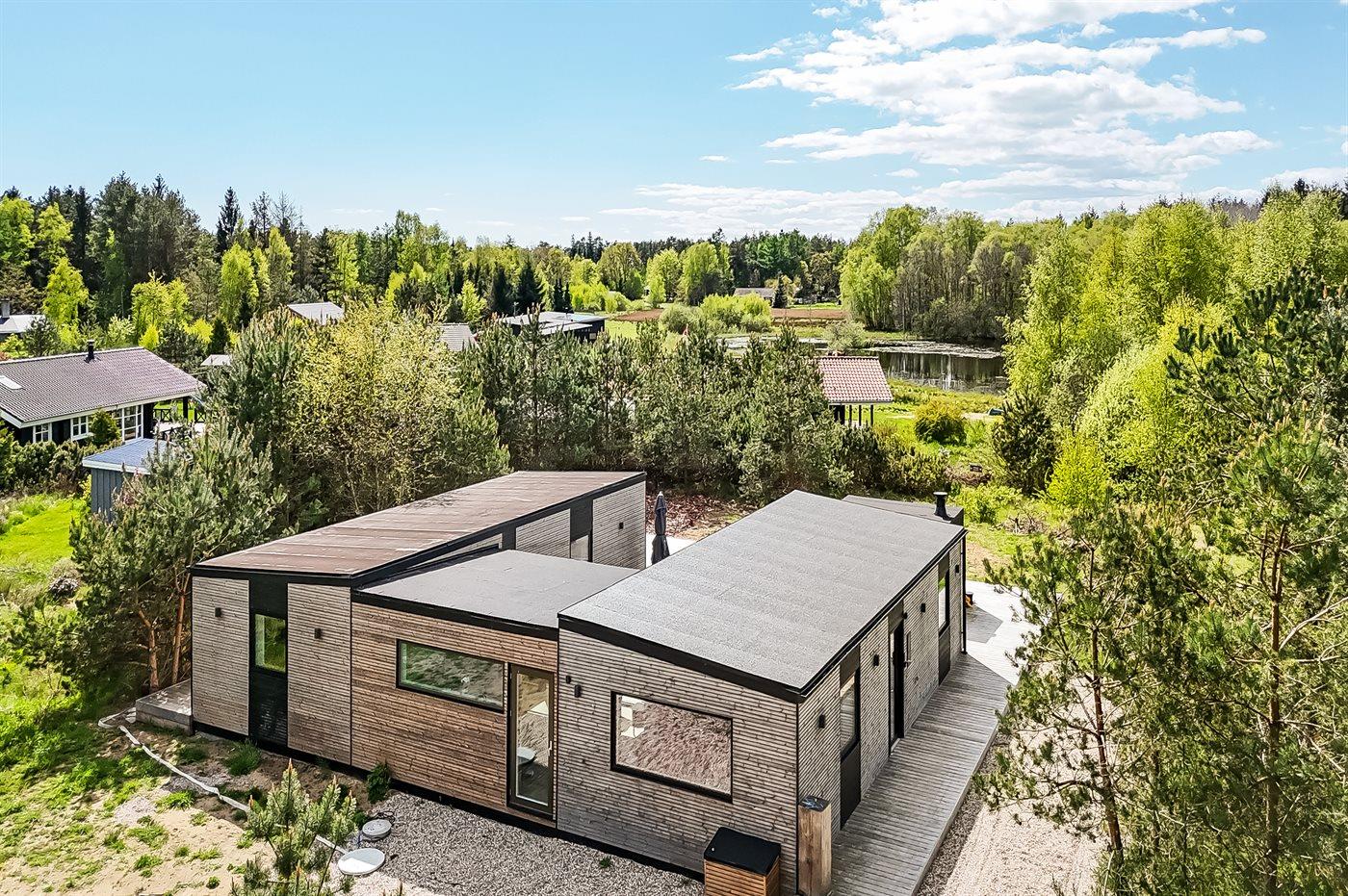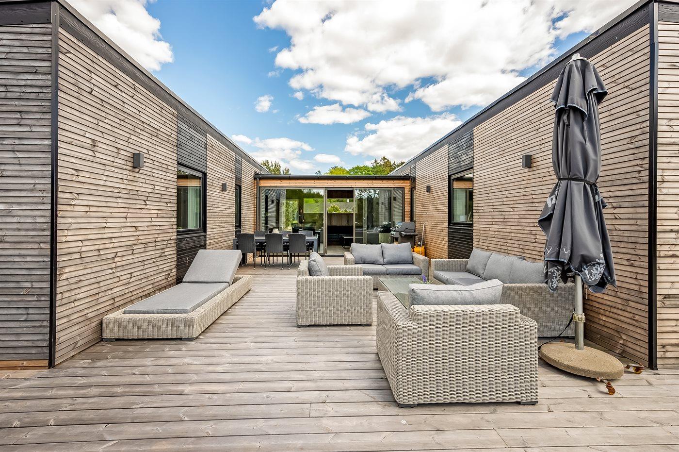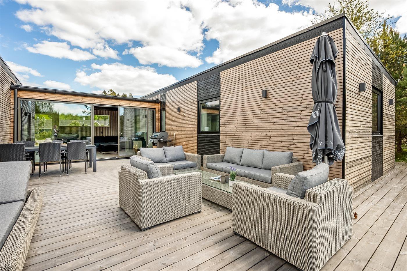 Sommerhuset i tre længer er det oplagte udgangspunkt for flere familier, der gerne vil have hver sin afdeling. Udenfor er der en stor og dejlig terrasse samt en skøn udendørs sauna med udsigt over landskabet.