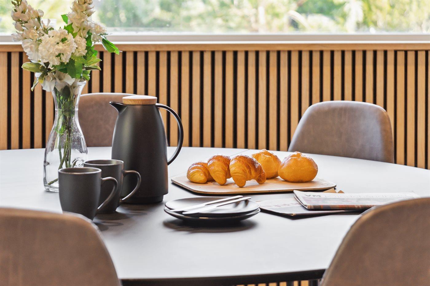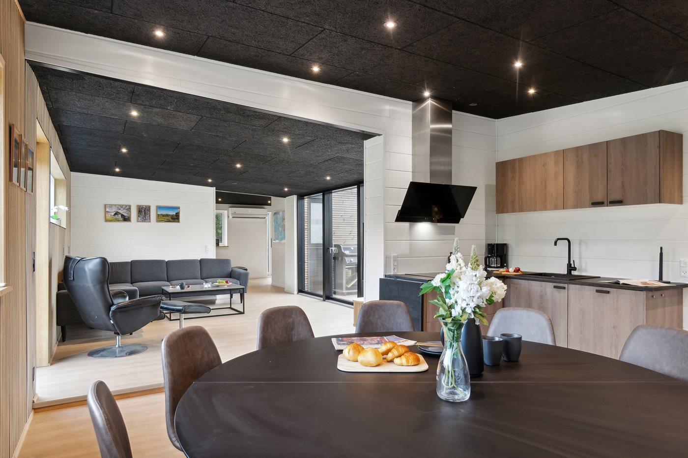 Køkkenet er udstyret med 1 køleskab. Der er 4 keramiske kogeplader, varmluftovn, mikrobølgeovn samt opvaskemaskine.