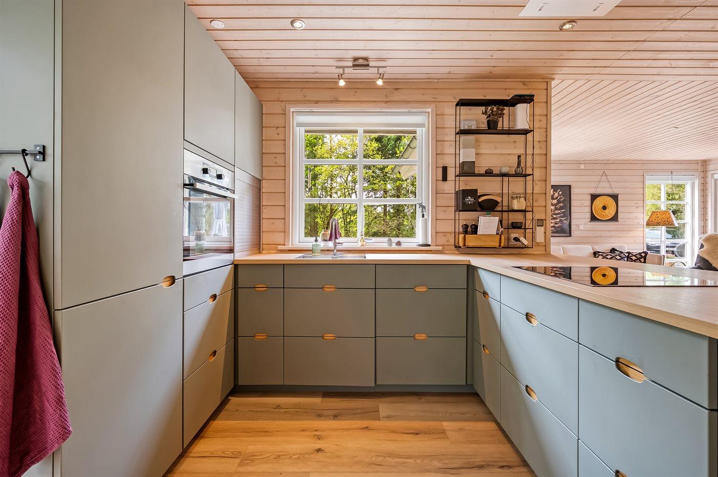 Køkkenet er udstyret med 1 køleskab. Der er 4 gasblus, varmluftovn samt opvaskemaskine.