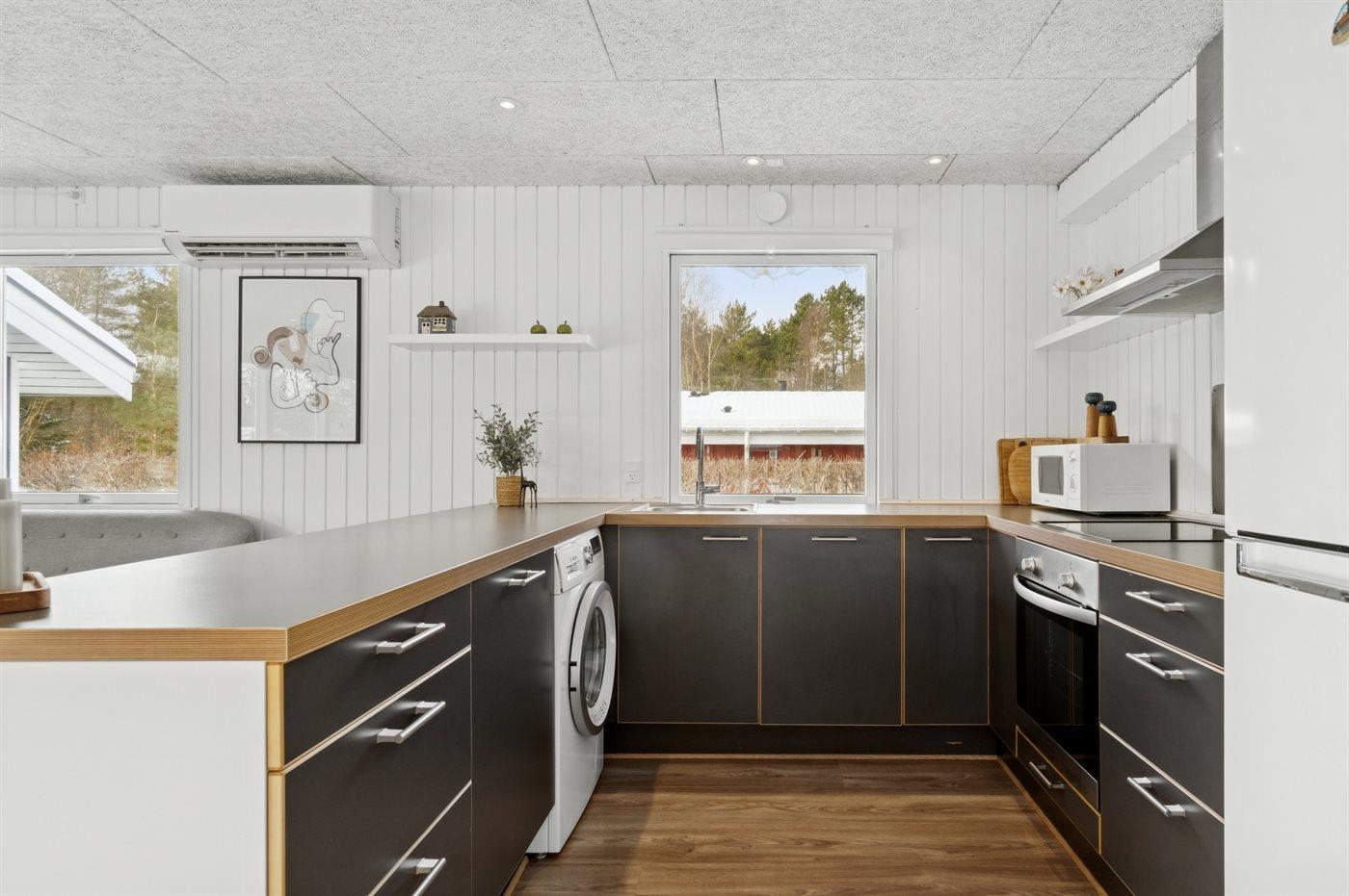 Køkkenet er udstyret med 1 køleskab. Der er 4 keramiske kogeplader, varmluftovn, mikrobølgeovn samt opvaskemaskine.