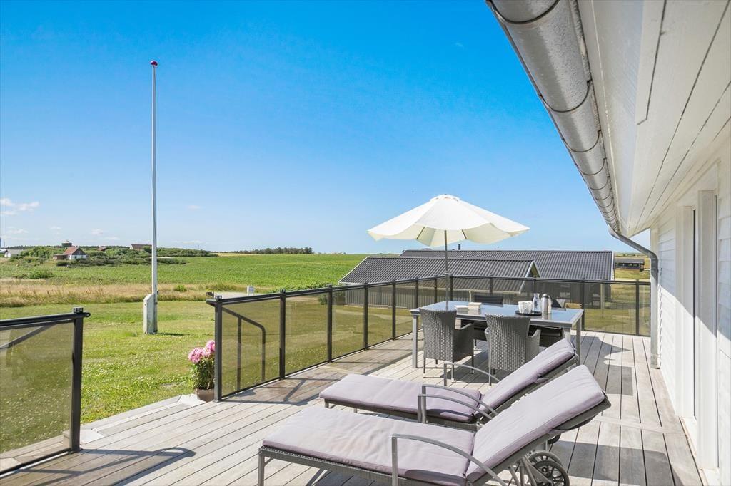 Der er terrasser på begge sider af huset og fra køkken-alrummet, har du direkte adgang tilhusets vestvendte terrasse, som byder på en flot udsigt over området og markerne. Der er naturligvis grill til rådighed og det er oplagt, at nyde de lune sommeraftener på terrassen med et udendørs måltid. Til huset er der en stor åben græsplane, som giver god mulighed for leg og boldspil.