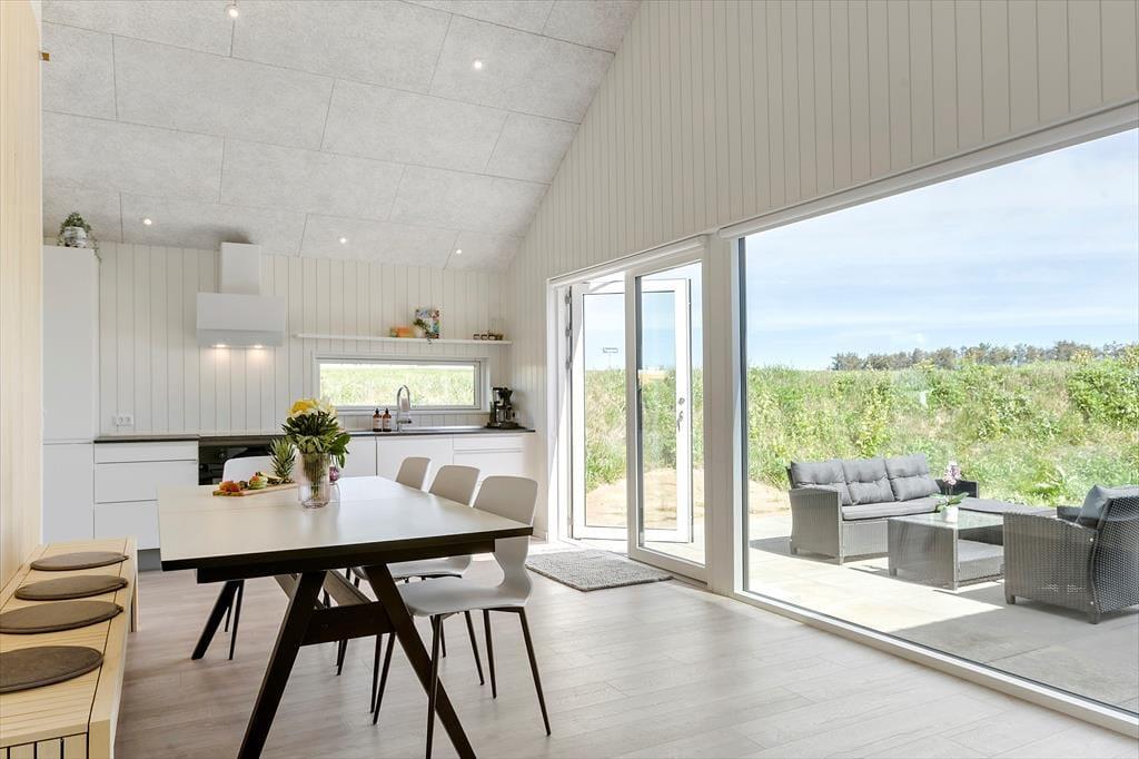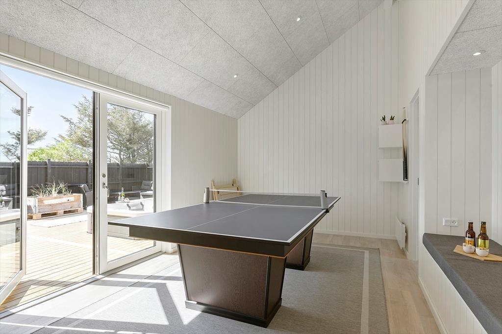 Når I holder ferie i et nybyggeri som dette, kan I være sikre på, at alt bare spiller. Inden døre er rummene fulde af charme og stilfuldt interiør, og med lyse farvetoner og et smukt lysindfald er her bare skønt at være. Planløsningen byder på en stue med åbent køkken, to badeværelser med bruser og lækre soveværelser, indrettet med dobbeltsenge og enkeltsenge. Med andre ord er sommerhuset perfekt indrettet til otte personer – og så har vi stadig ikke nævnt aktivitetsrummet, hvor i kan hygge jer med at spille pool og bordtennis.
