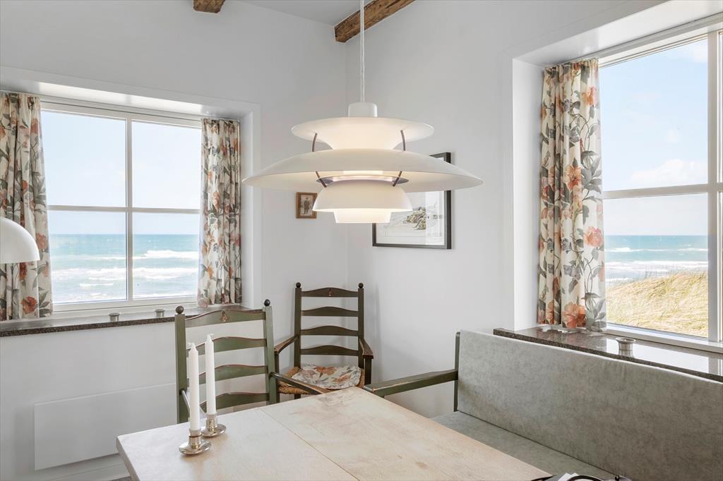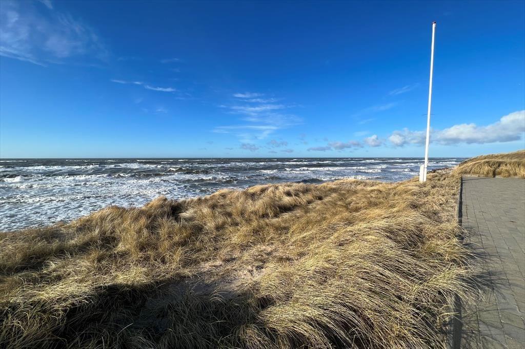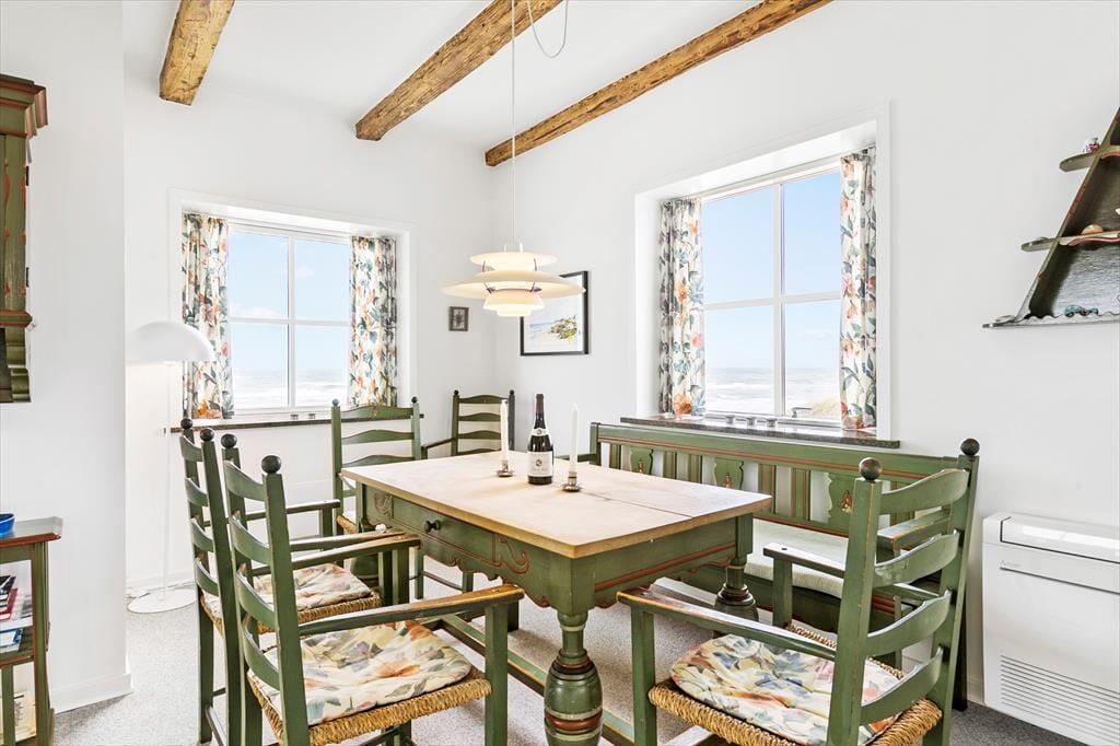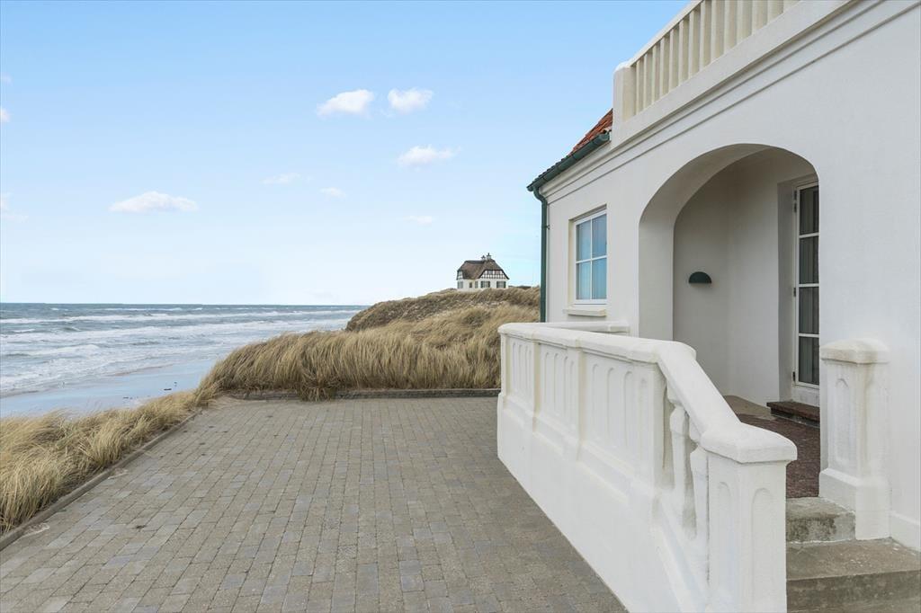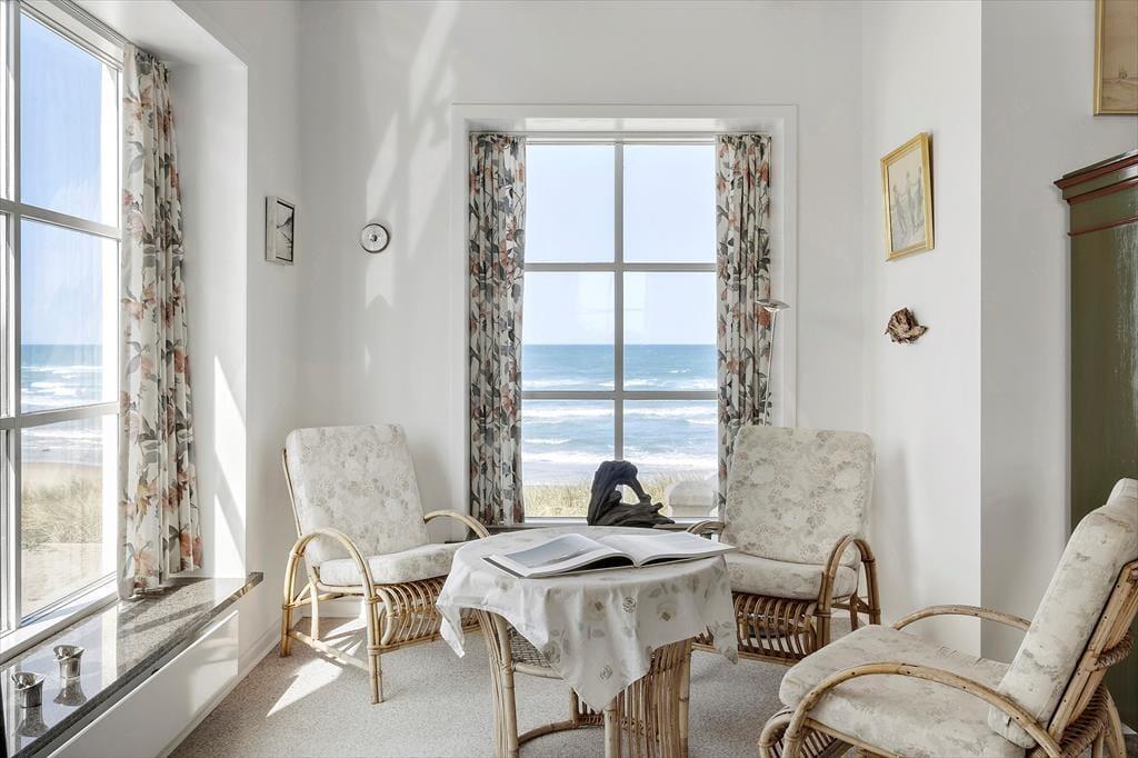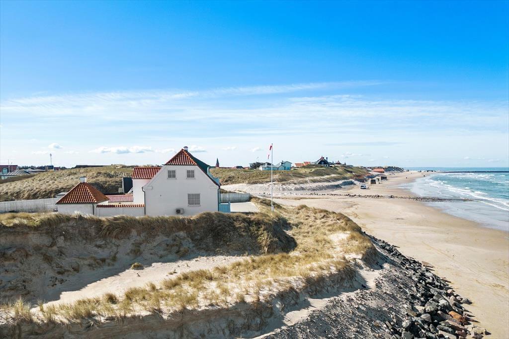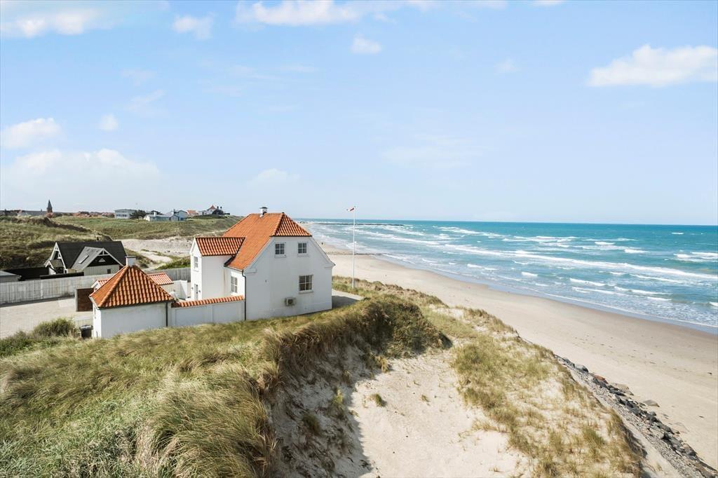 Sommerhuset ligger godt hævet over stranden på den kystsikrede grund, så I har et flot panoramavue over Vesterhavet og kyststrækningen fra den syd- og vestvendte del af terrassen. I kan også sætte jer på østsiden af huset, hvis I vil drikke kaffe i morgensolen eller søge læ for havbrisen.